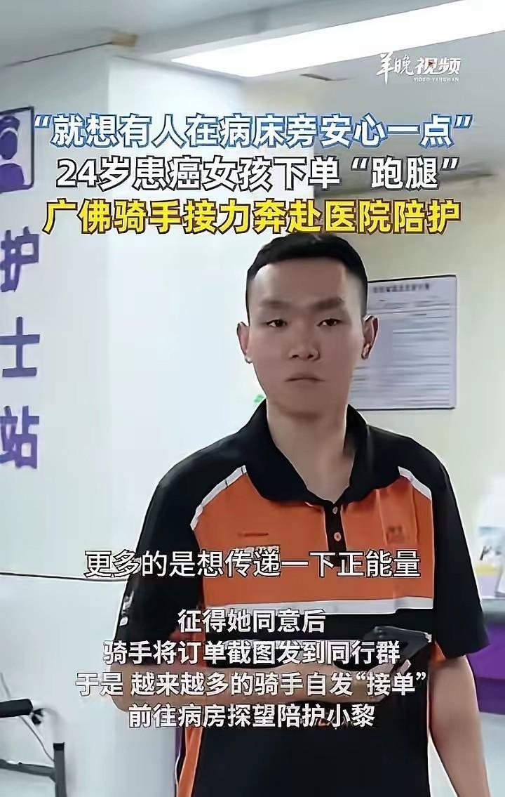 广东佛山,一个跑腿骑手接到了这辈子最诡异的单子:不用送饭,不用买药,只要去病床边干坐两小时。 报酬50块,订单备注里却透着一股子令人心碎的卑微:“求求你来陪陪我,让我安心一点就好。” 接单的小哥看着手机屏幕愣了半天,心里直犯嘀咕:这该不会是恶作剧吧?送过成千上万的单,头一回见有人花钱买“陪伴”的。 可那行字里透出的孤独,像一根细针,轻轻扎了他一下。他犹豫片刻,还是点了“接单”,调转车头,朝着佛山复星禅诚医院的方向驶去。 推开肿瘤科病房的门,小哥看到的是一个瘦弱的女孩,24岁的小黎,正靠在病床上,脸色有些苍白。 她得的是一种罕见的血液系统恶性肿瘤,叫母细胞性浆细胞样树突细胞肿瘤,已经熬过了四次化疗。 病魔的折磨、治疗的痛苦,都比不上一种更深的煎熬——孤独。 父亲为了筹钱,不得不外出打工;弟弟一边实习一边照顾她,也分身乏术。 漫长的住院时光里,病房安静得能听见点滴的声音,窗外的世界车水马龙,却仿佛与她隔着一层厚厚的玻璃。 那天,一个念头突然冒出来:能不能像点一份外卖一样,点一份“陪伴”? 于是,就有了那张特殊的跑腿单。她没抱太大希望,甚至做好了被取消订单的准备。 第一位骑手来了,他真的就在床边坐了两个小时。起初有点局促,不知道说什么好。 小黎慢慢打开了话匣子,聊她的病,聊她的家人,聊那些因为治疗而中断的梦想。小哥听着,心里那股职业性的匆忙感渐渐褪去,取而代之的是一种沉甸甸的酸楚。 他这才明白,那50块钱买的不是服务,是一个年轻生命在绝境中,对人间烟火气最卑微的渴望。 临走前,他征得小黎同意,把这段经历发到了骑手微信群里。他本意或许只是想分享一件奇遇,却没想到,像往平静的湖面扔进了一颗石子,涟漪迅速荡开。 接下来发生的事,让所有人都没想到。那张订单截图,那句“坐在病床旁陪我两个小时”,像一道无声的召集令,在佛山这座城市的骑手网络里悄然传开。 这群平日里与时间赛跑、穿梭在大街小巷的“赶路人”,不约而同地按下了暂停键。 有人刚送完一单麻辣烫,顺手在楼下买了盒新鲜水果;有人本来已经收工,看到消息又骑上小电驴折返医院;还有不善言辞的兄弟,就安静地坐在一旁,帮忙递杯水,或者只是默默陪伴。 他们来自天南地北,互不相识,却因为一个陌生女孩的孤独,临时聚成了她的“家人”。 甚至,远在云南的一位骑手兄弟,通过线上花店,订了一束鲜花送到病房。 牛奶、零食、故事书……这些微不足道的小东西,堆满了床头,也一点点填满了小黎心里那个因疾病和孤独而裂开的大洞。 消息像长了翅膀,飞出了骑手圈。民警来了,社区工作人员来了,同楼的病友和家属也来了。 那间原本冷清的30号病床,成了医院里最温暖的角落。小黎的话渐渐多了,脸上有了笑容,饭也吃得香了。她说,没想到会有这么多素不相识的人来关心她,这些善意给了她巨大的力量,让她有了继续和病魔斗争的勇气。 4月20日,小黎出院回家休养的日子,善意依然没有散场。一位女骑手,捧着一束花敲开了门。 这束花,是一位网友在外卖平台下的单,备注写着:“祝小黎女士尽早康复,你并不孤独,我们都替你加油打气!” 你看,这场始于一个孤独订单的温暖,已经接力传递,变成了整座城市对一个女孩的温柔守护。 回过头看,这张价值50元的“陪伴订单”,可能是世界上最“亏本”的买卖,却也是最有价值的交易。 它支付的报酬微不足道,买回的,却是一个人对这个世界重新燃起的信任和希望。 它让我们看到了现代社会中,那些被我们忽略的、深不见底的孤独。尤其是对于病人、老人、独居者,他们的世界可能因为各种原因被折叠起来,与外界的连接脆弱得像一根蛛丝。 它也让我们看到在算法和效率至上的平台经济背后,依然涌动着最朴素的人情。 骑手们,这些我们印象中总是行色匆匆的“工具人”,在那一刻,脱下了系统赋予的“赶时间”外壳,露出了人性中最柔软、最善良的内核。 所以,那个最初接下订单的骑手,他接下的不仅仅是一单奇怪的跑腿业务,他接下的,是一份沉甸甸的信任,也无意中打开了一扇门,让无数陌生的善意得以涌入。 小黎用50块和一句卑微的请求,完成了一次对社会温情的“众筹”。 而佛山这群可爱的骑手和市民们,用他们的行动告诉我们:对抗孤独最有效的药方,或许不是科技,不是金钱,而是另一个人的体温,一次安静的倾听,一份不期而遇的善意。 这座城市用一场自发的接力赛证明,最快的“配送”,不是餐食,而是人心;最珍贵的“打赏”,不是金钱,而是时间。 愿我们都能在匆忙赶路时,不忘为身边需要陪伴的人,留出一盏灯的温暖。 参考:“坐在病床旁陪我两小时”:一张特殊“跑腿单”发出后——南方日报