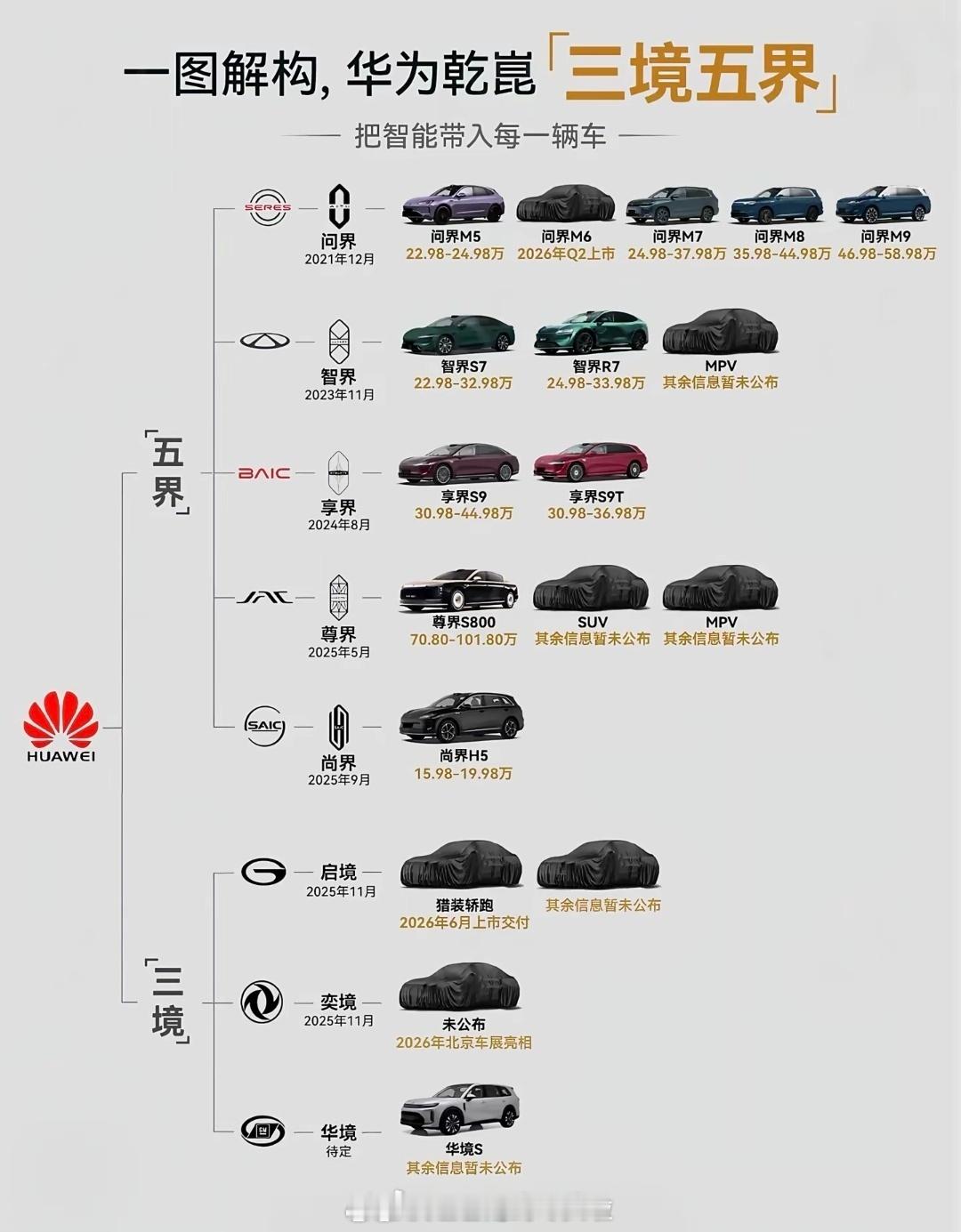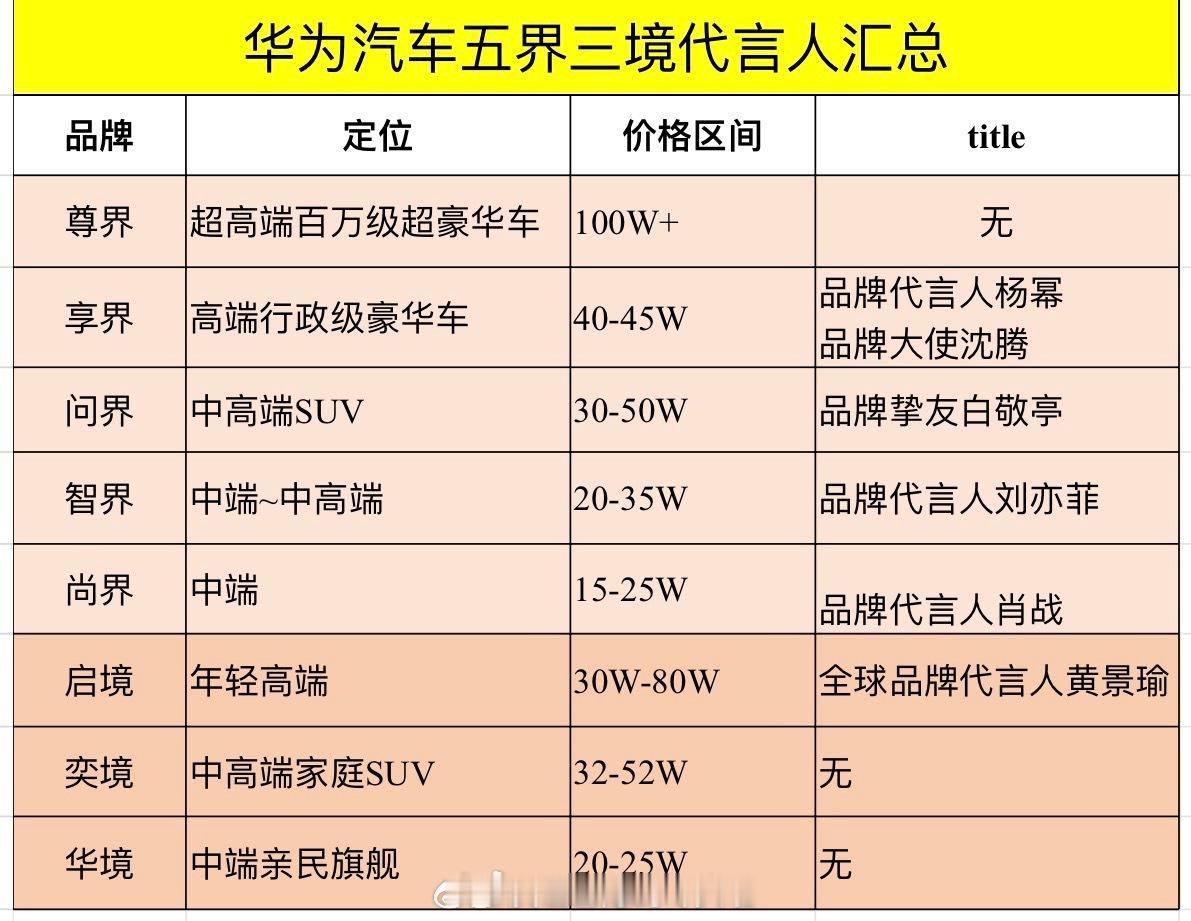华为汽车五界三境代言人汇总享界:品牌代言人杨幂 品牌大使沈腾智界:品牌代言人刘亦菲尚界:品牌代言人肖战问界:品牌挚友白敬亭启境:全球品牌代言人黄景瑜肖战代言尚界余承东官宣肖战代言