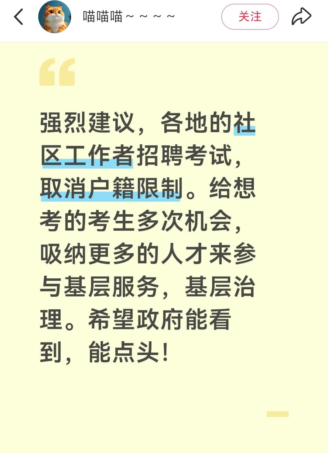 网友强烈建议:“各地的社区工作者招聘考试, 应该取消户籍限制。” 为何要取消户籍限制呢?吸纳更多的人才来参与基层服务,基层治理。 现实中的社区工作者招聘考试对于户籍限制越来越严格了,不仅仅单单限制在本市,有的已经限制在本区了,说不一定过几年就限制在本镇街了。