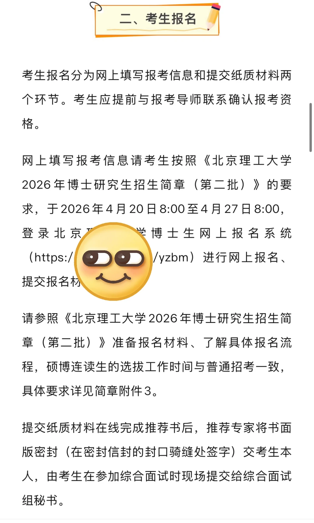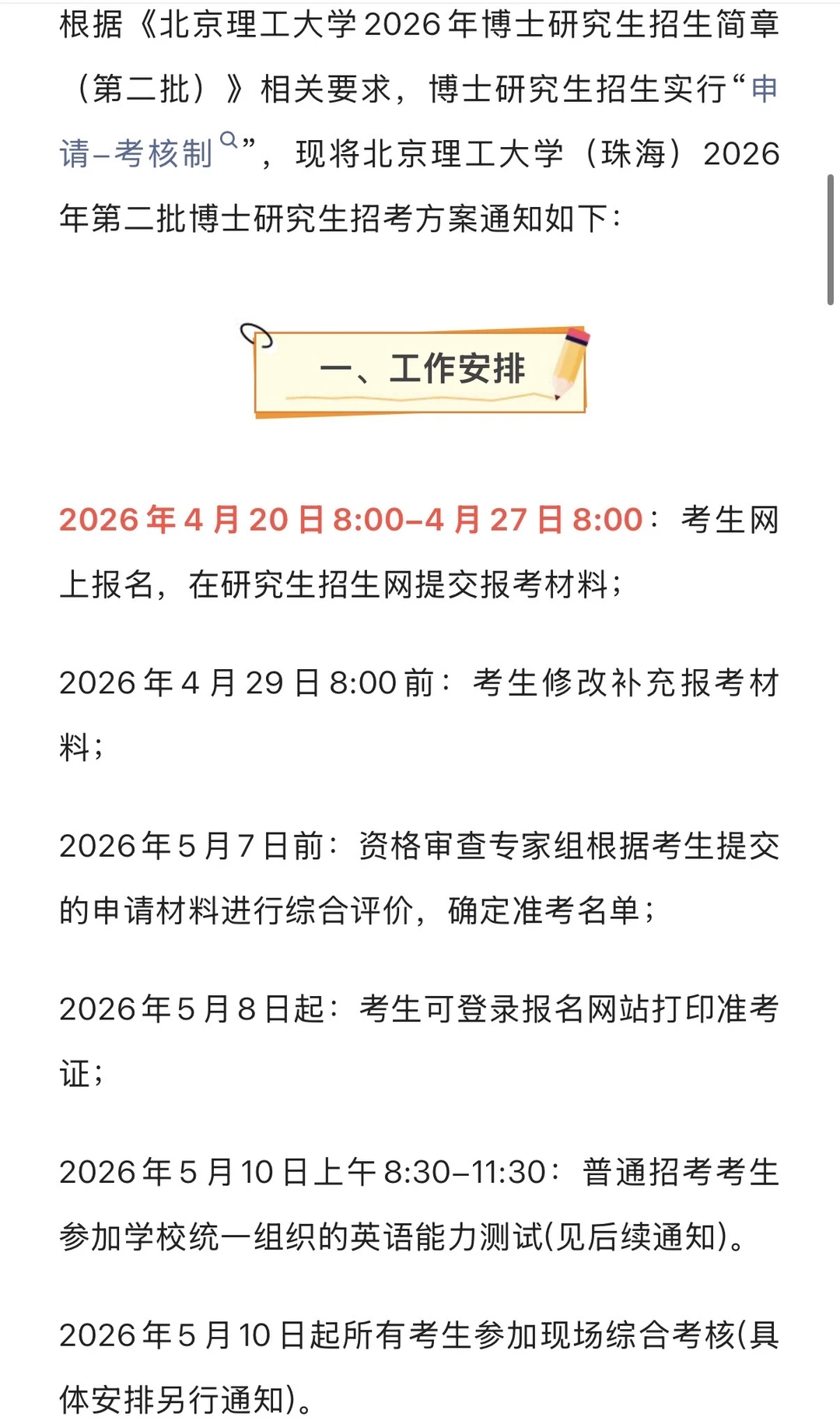 根据《北京理工大学2026年博士研究生招生简章(第二批)》相关要求,博士研究生招生实行“申请-考核制~”,现将北京理工大学(珠海)2026年第二批博士研究生招考方案通知如下: