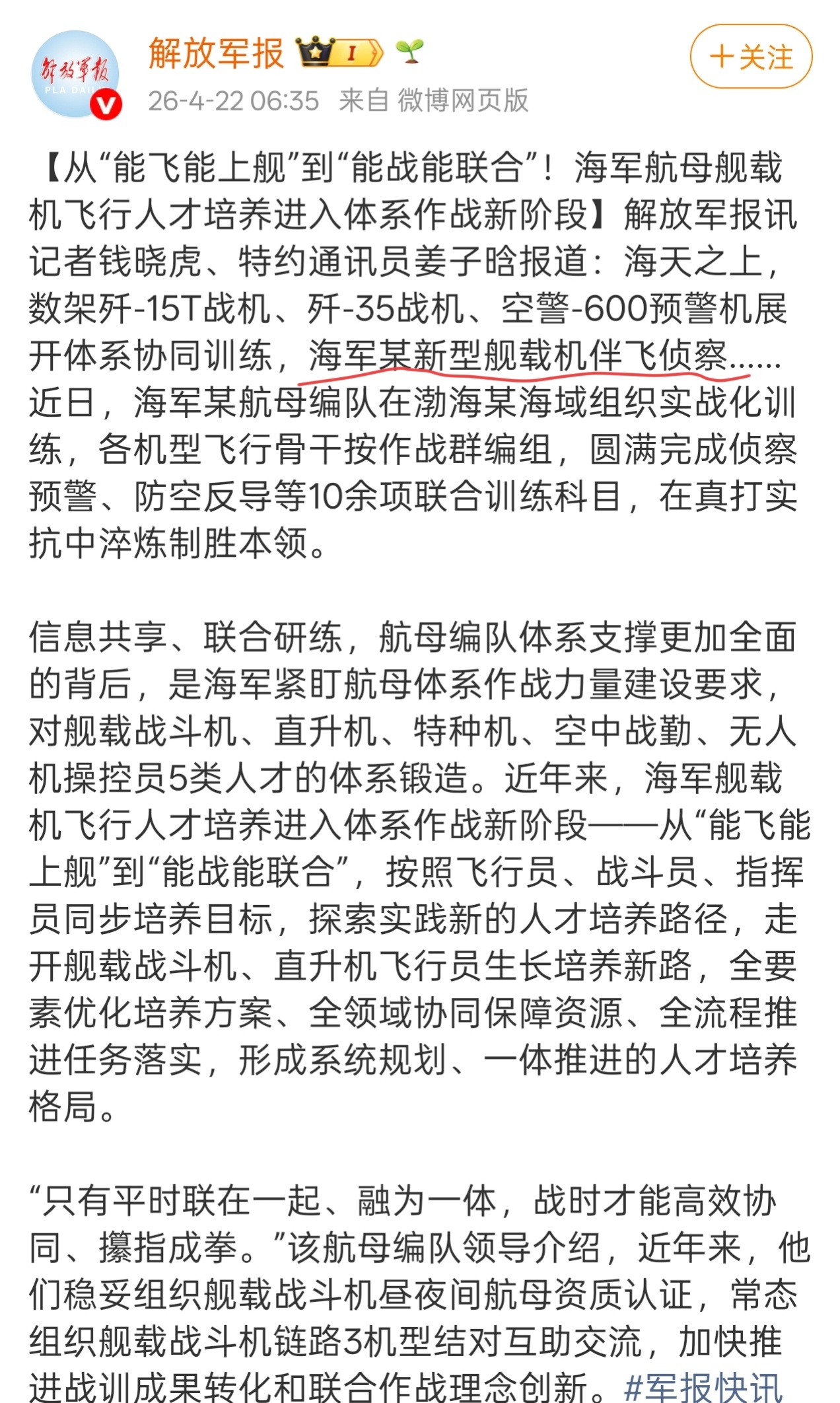 J-35、J-15T、KJ-600都直接报出了型号,这个却没有,是什么新服役的舰载机?这么神秘?