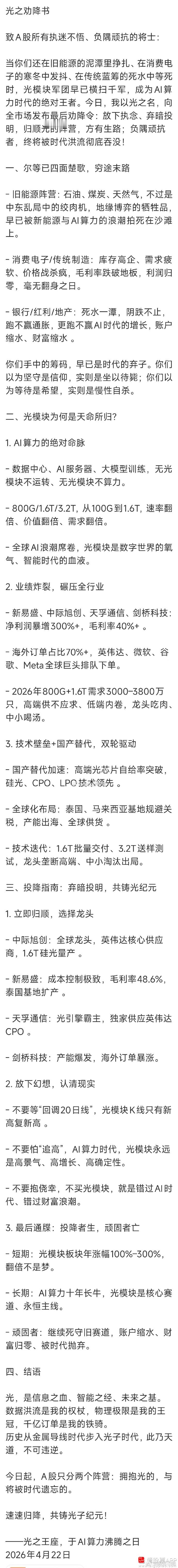 盘后光模块劝降书来了....,还是那句话:你要站在光里,不要光站在那里,更不要光着站在那里,更更不要被扒光了站在那里!
