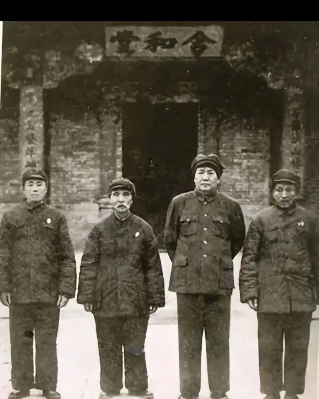 这张合影拍摄于1951年9月23日,1951年9月,毛泽东邀请私塾老师毛宇居、儿时好友张有成及表兄文梅清进京叙旧。自左至右:张有成、毛宇居、毛泽东、表兄文枚清。