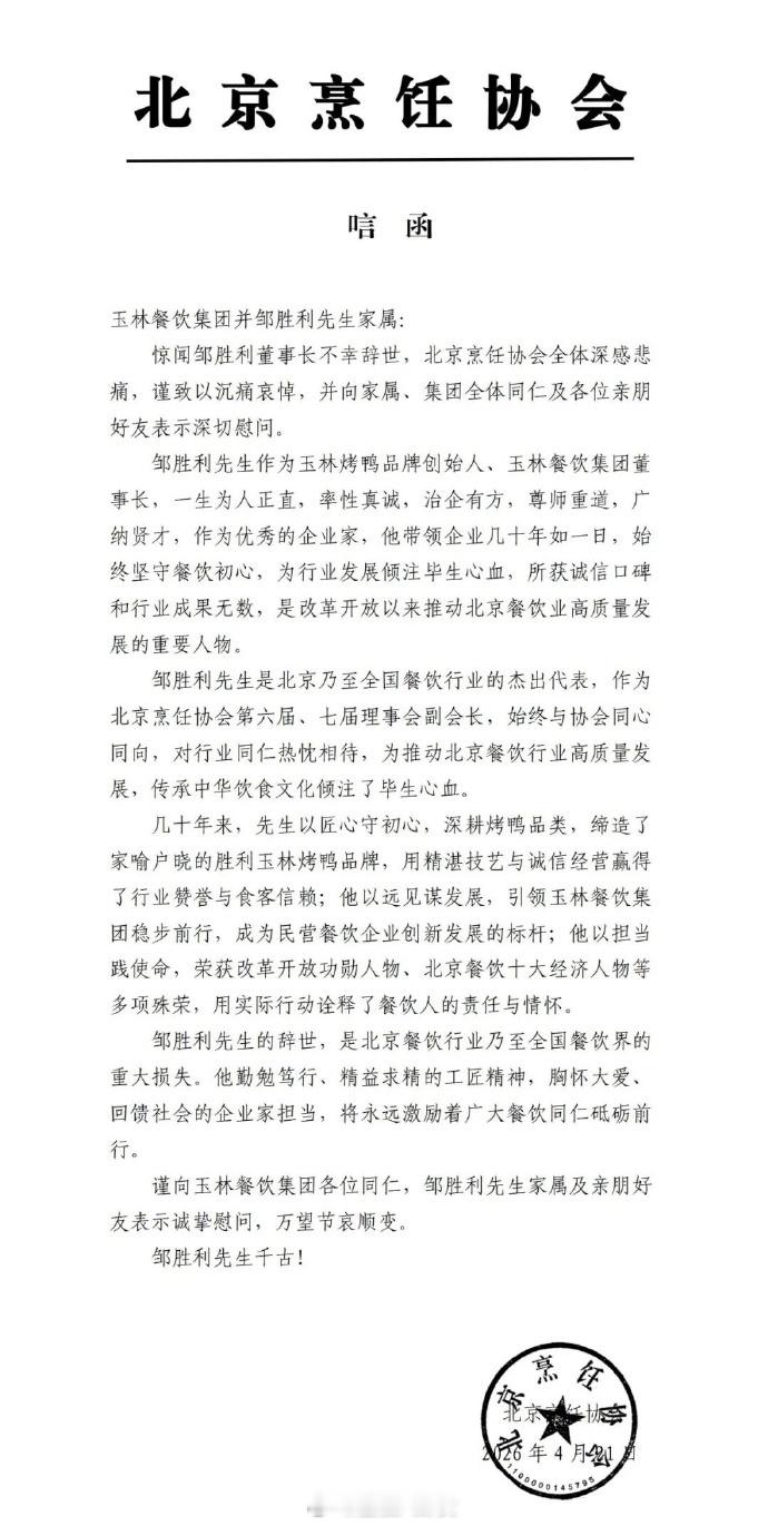 玉林烤鸭品牌创始人、玉林餐饮集团董事长邹胜利去世,北京烹饪协会:沉痛悼念