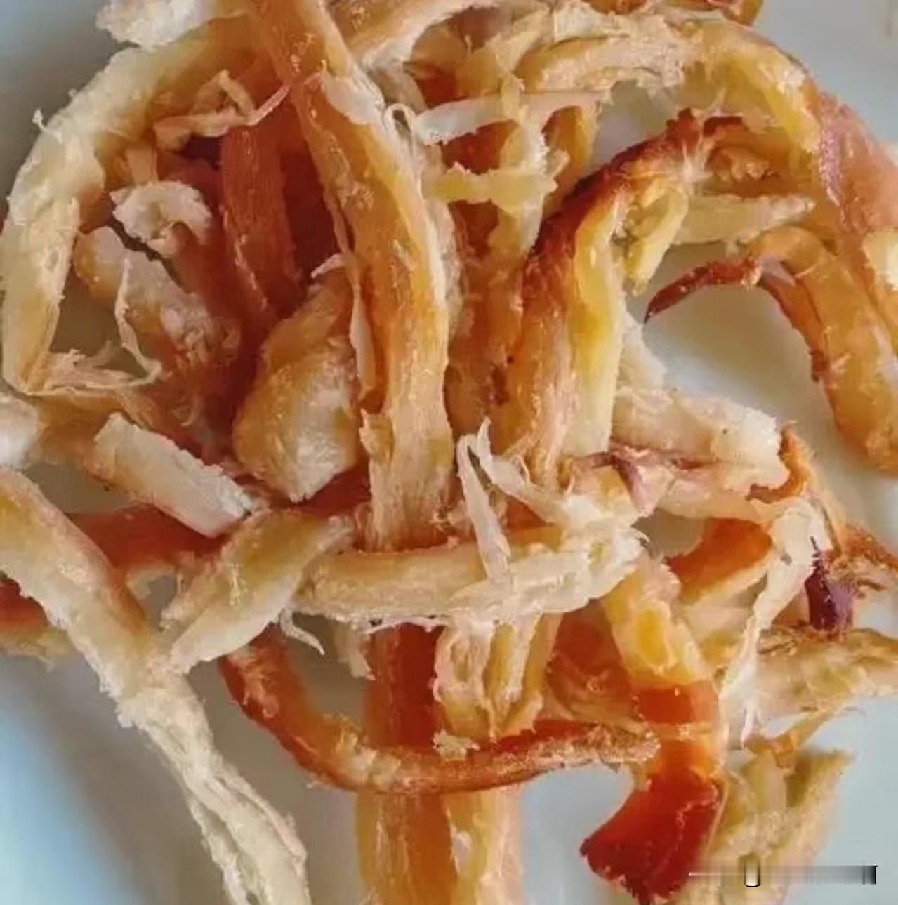 这是鱿鱼条,用大鱿鱼做的,这种是没有加淀粉的那种。 吃的时候一条条撕着吃。 这不是墨鱼条,不是。 看清楚是大鱿鱼做的,就是你们在烧烤摊位上看到的油炸大鱿鱼,就那玩意做的。 头条有位粉丝来旅游买了袋鱿鱼条花了一百多,说是墨鱼条。 哪是墨鱼条,墨鱼是墨鱼,鱿鱼是鱿鱼,这两个虽然有点瓜蔓子亲戚但是绝对不是一回事。 但是吃起来味道差不多,区别不大。