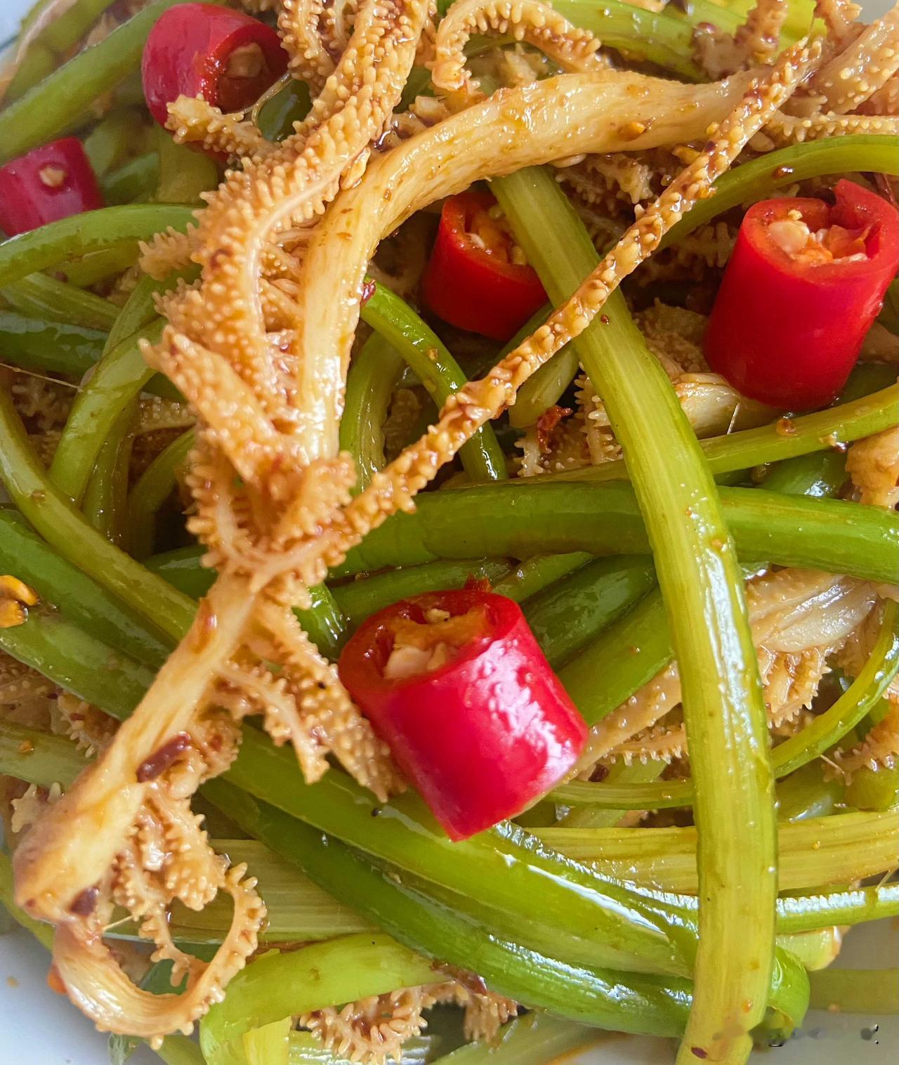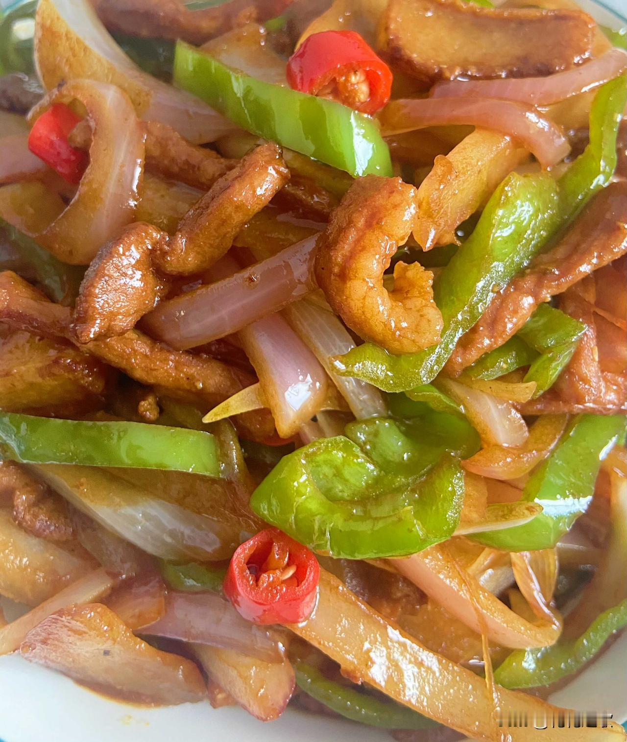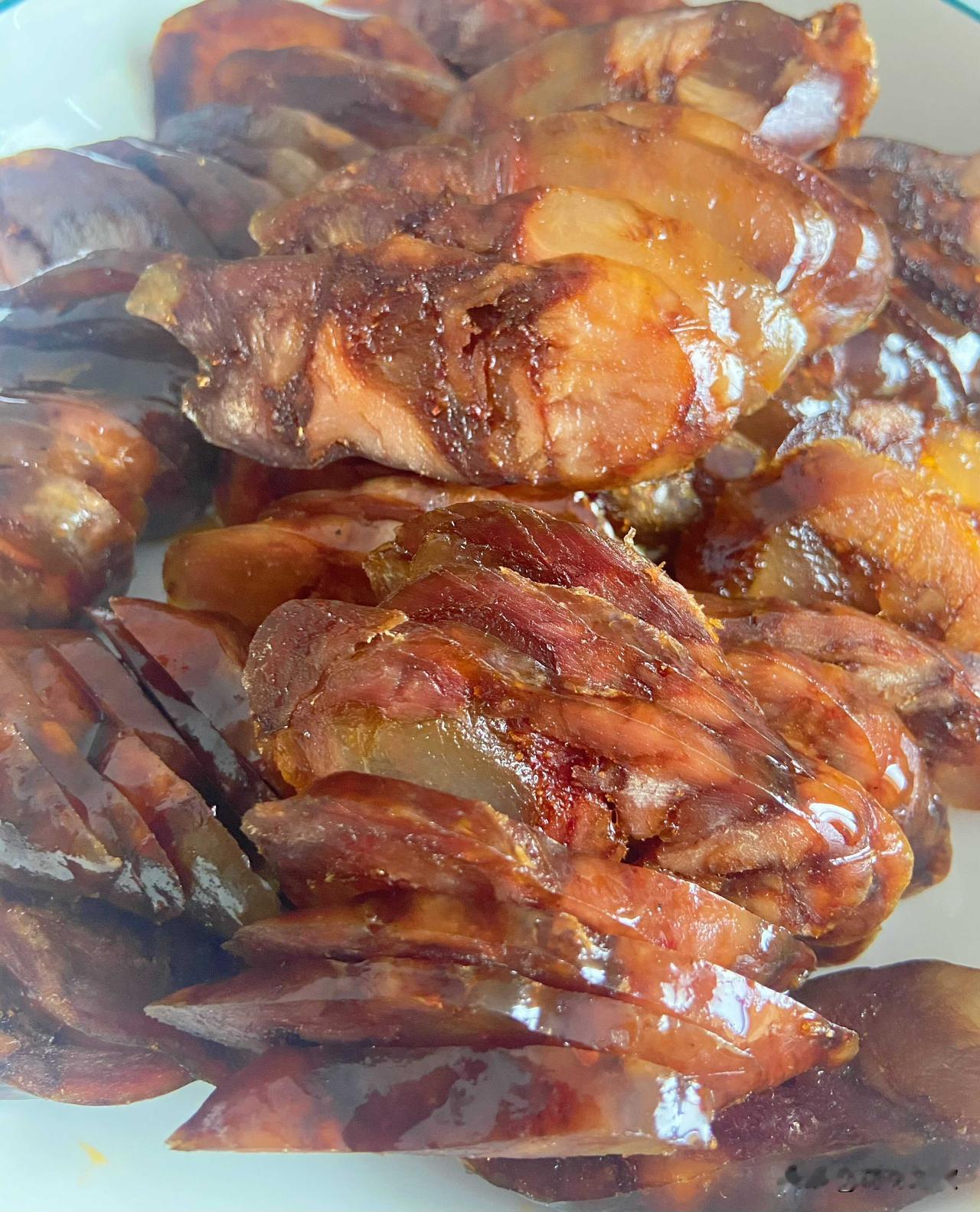 还是三道菜,午餐多一点,顺带给晚餐留一口,自我感觉今日的色彩看着还挺让人食欲满满的呢! 蒜苔拌千层肚:脆脆的口感,配上小米辣的味道,爽口开胃极了! 麻辣香肠:自家出品的腊肠,不允许说不好吃,就是好吃啦! 青椒洋葱炒肉:带着点甜味的洋葱还真的很喜欢,也很下饭的! 喜欢,三道菜都喜欢,越吃越开心呢!