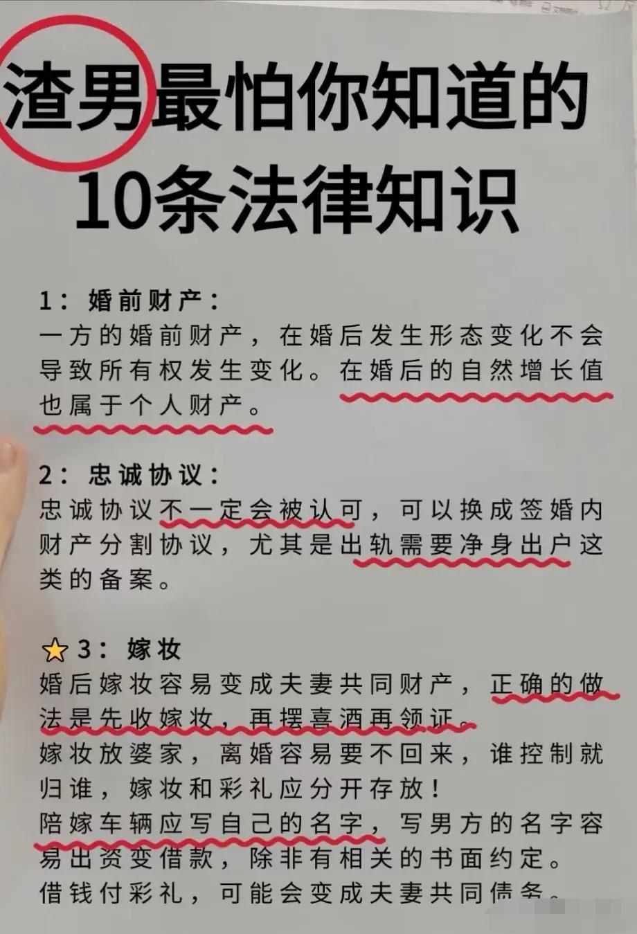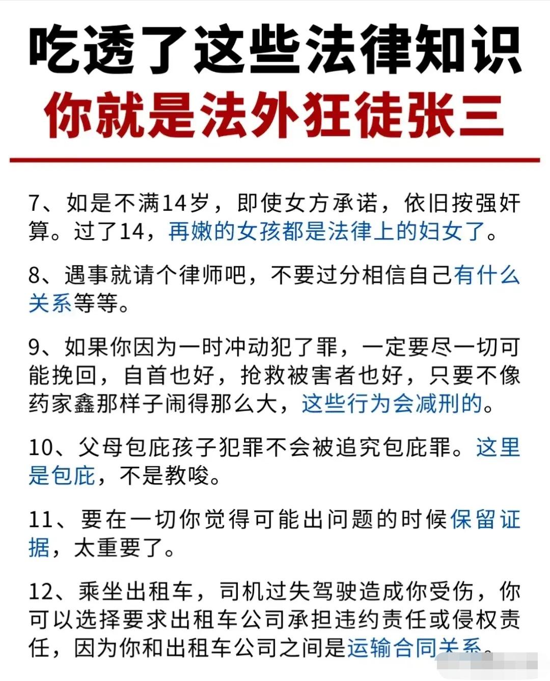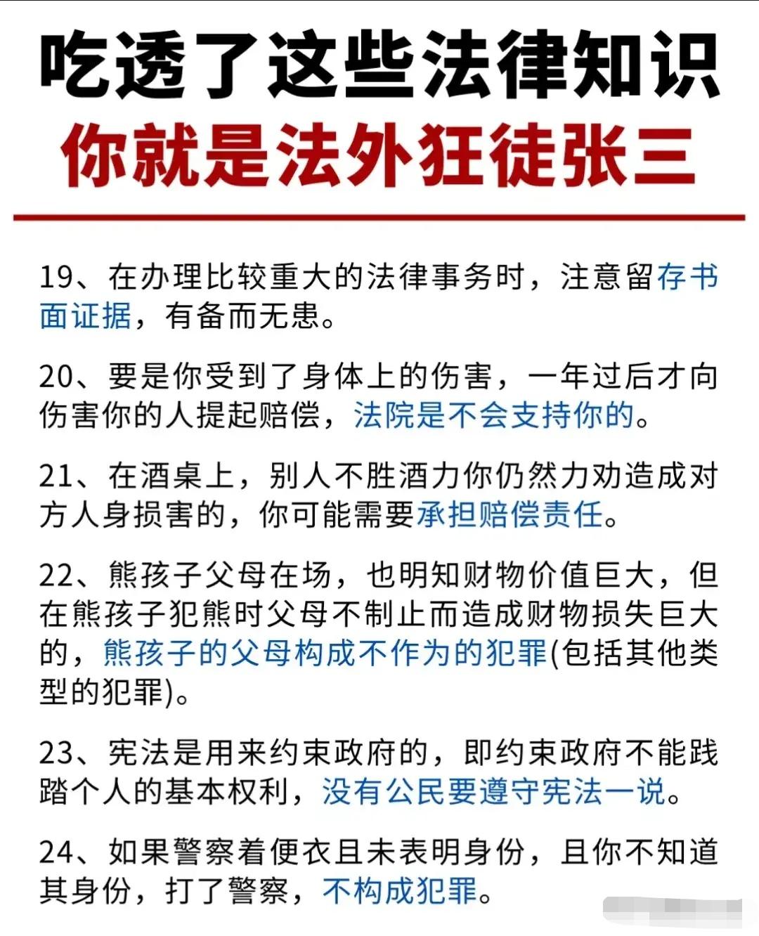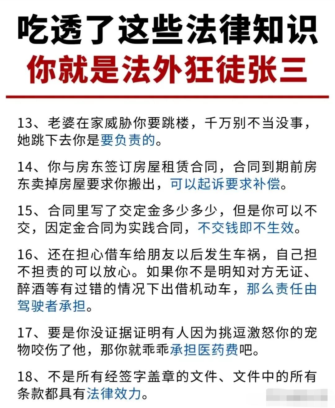 不懂法真的会吃亏!这些接地气的法律知识,覆盖生活、婚恋、职场三大场景,实用又好记。 渣男最怕的婚前财产、彩礼归属、忠诚协议避坑;老板最怕的双倍工资、加班费、带薪年假维权;还有正当防卫、借款证据、宠物伤人、工伤认定……全是日常能用得上的干货。 懂法不是要当“法外狂徒”,而是守住底线、护住权益。多看一遍民法典,关键时刻能帮你和家人少走弯路、不吃哑巴亏。