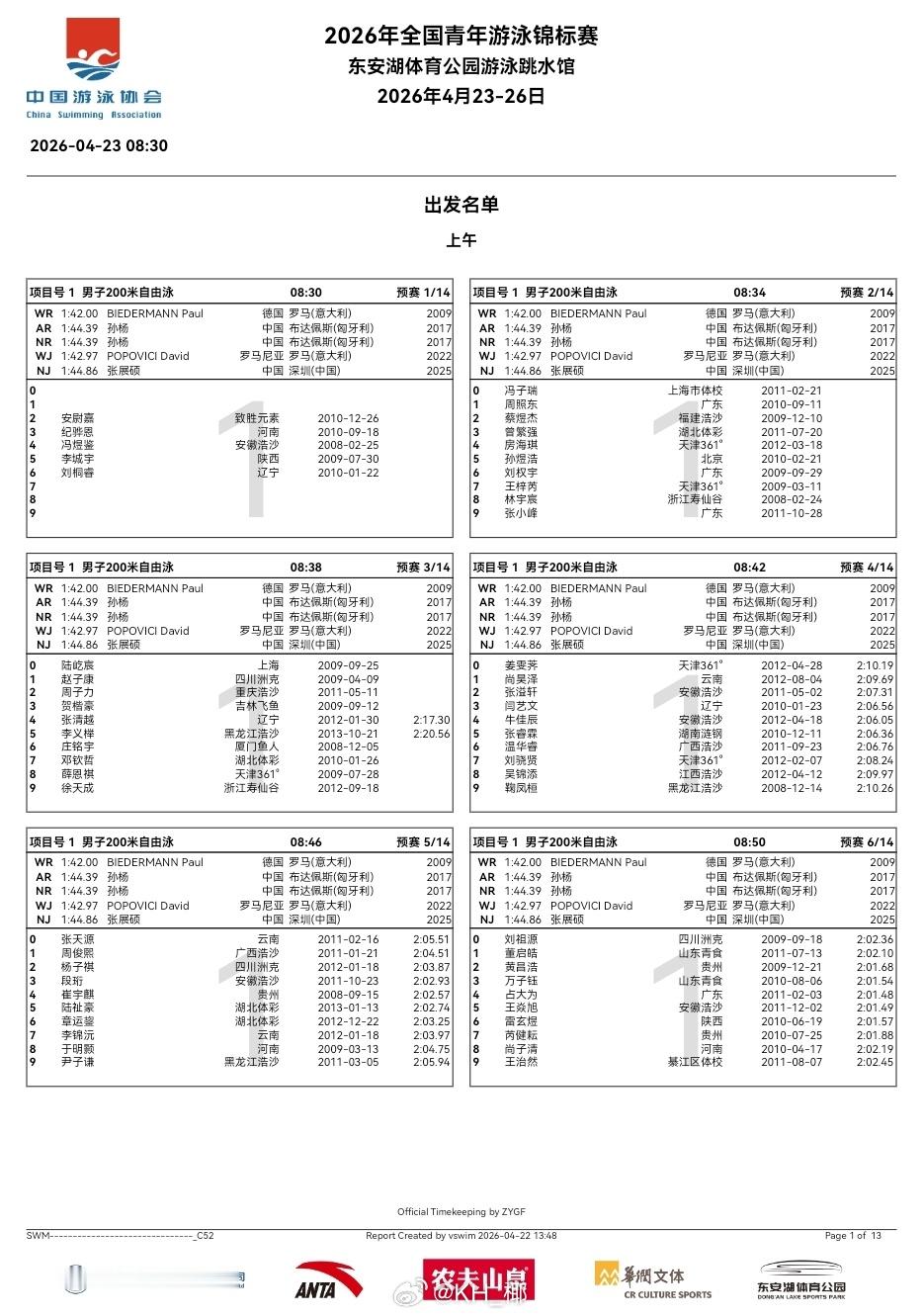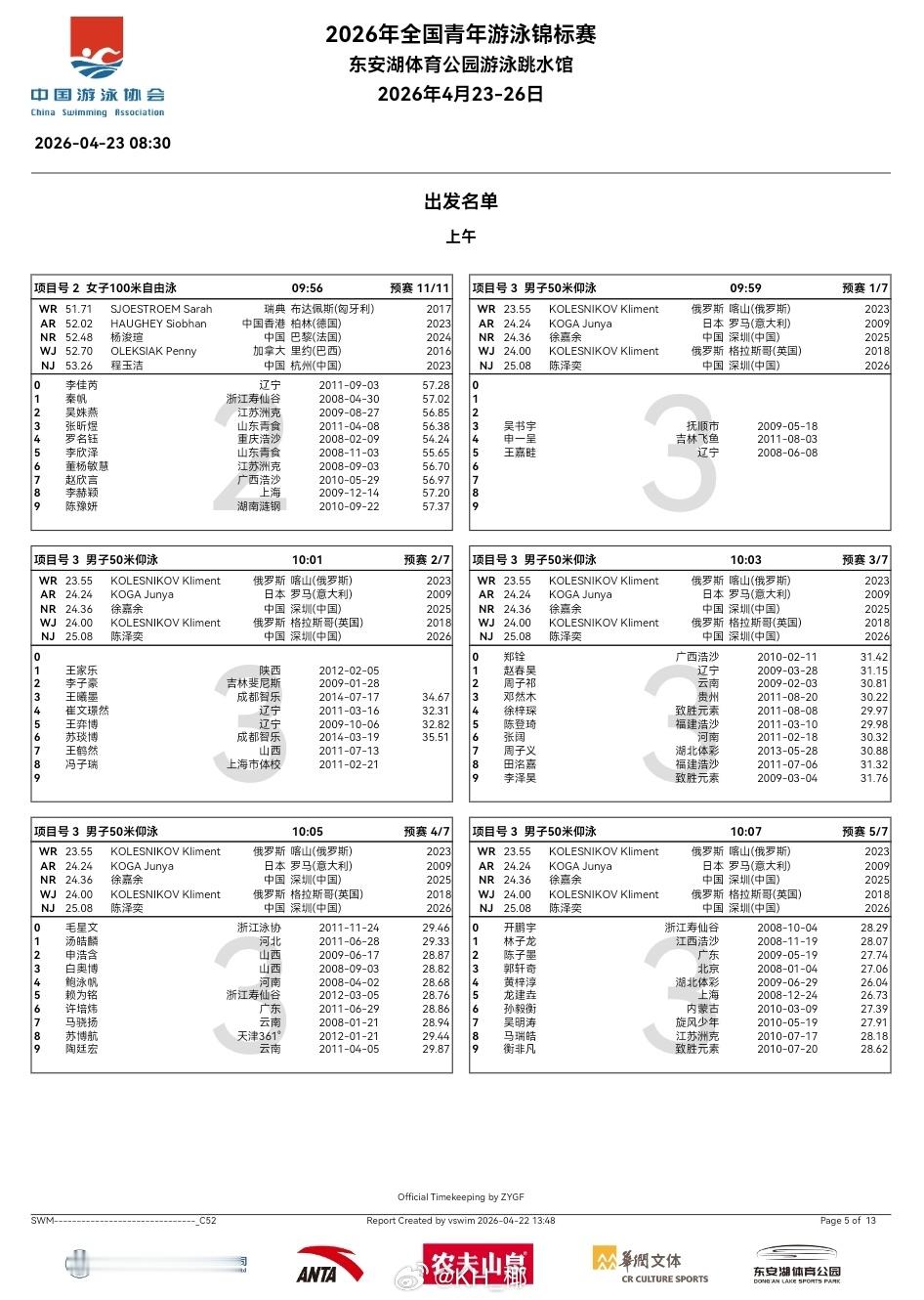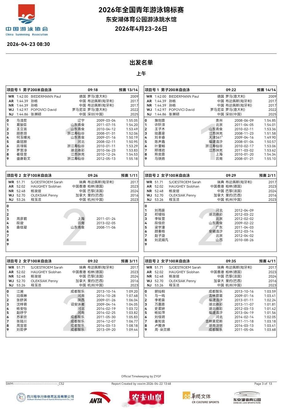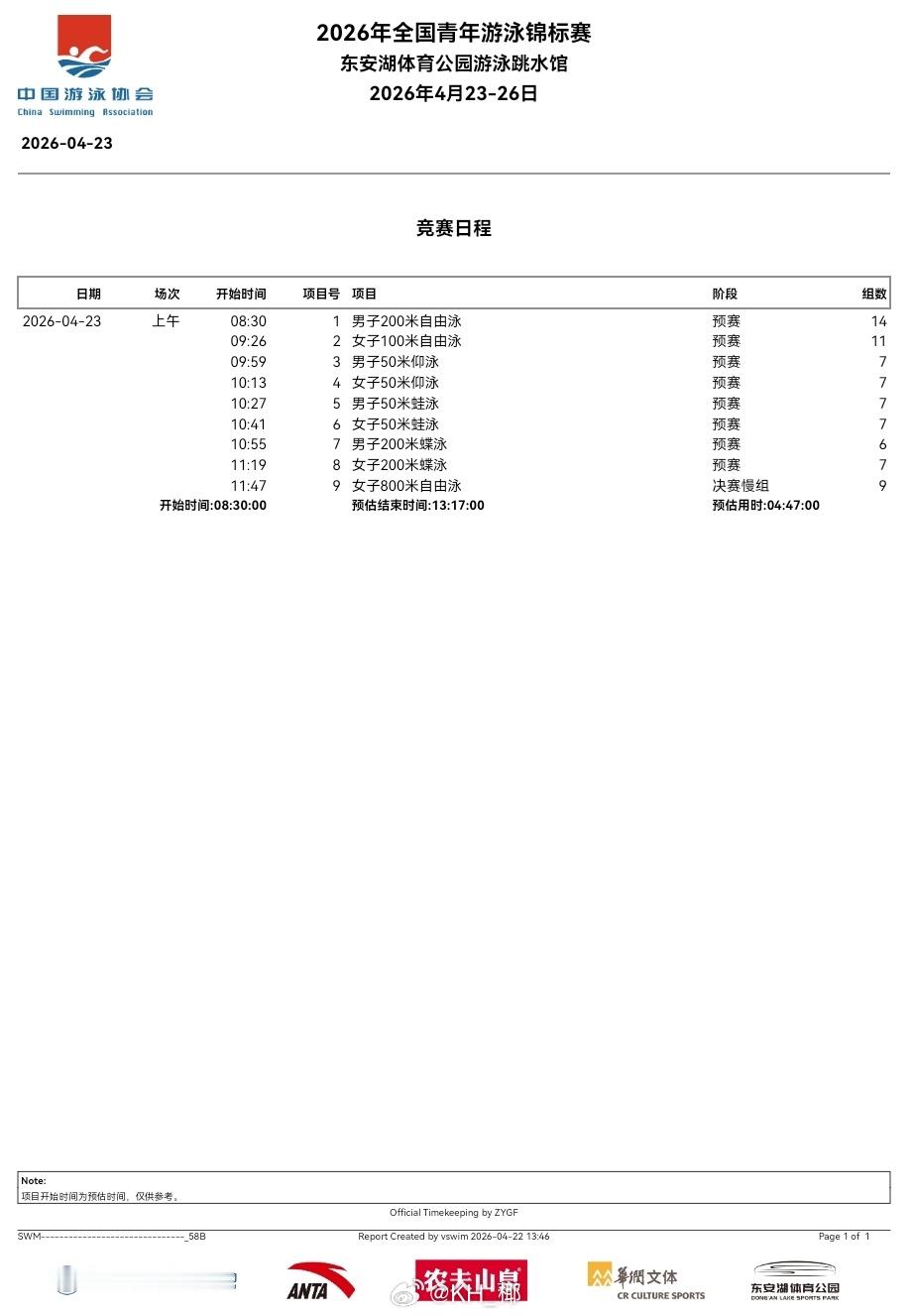 全国青年游泳锦标赛 第一天预赛秩序单
