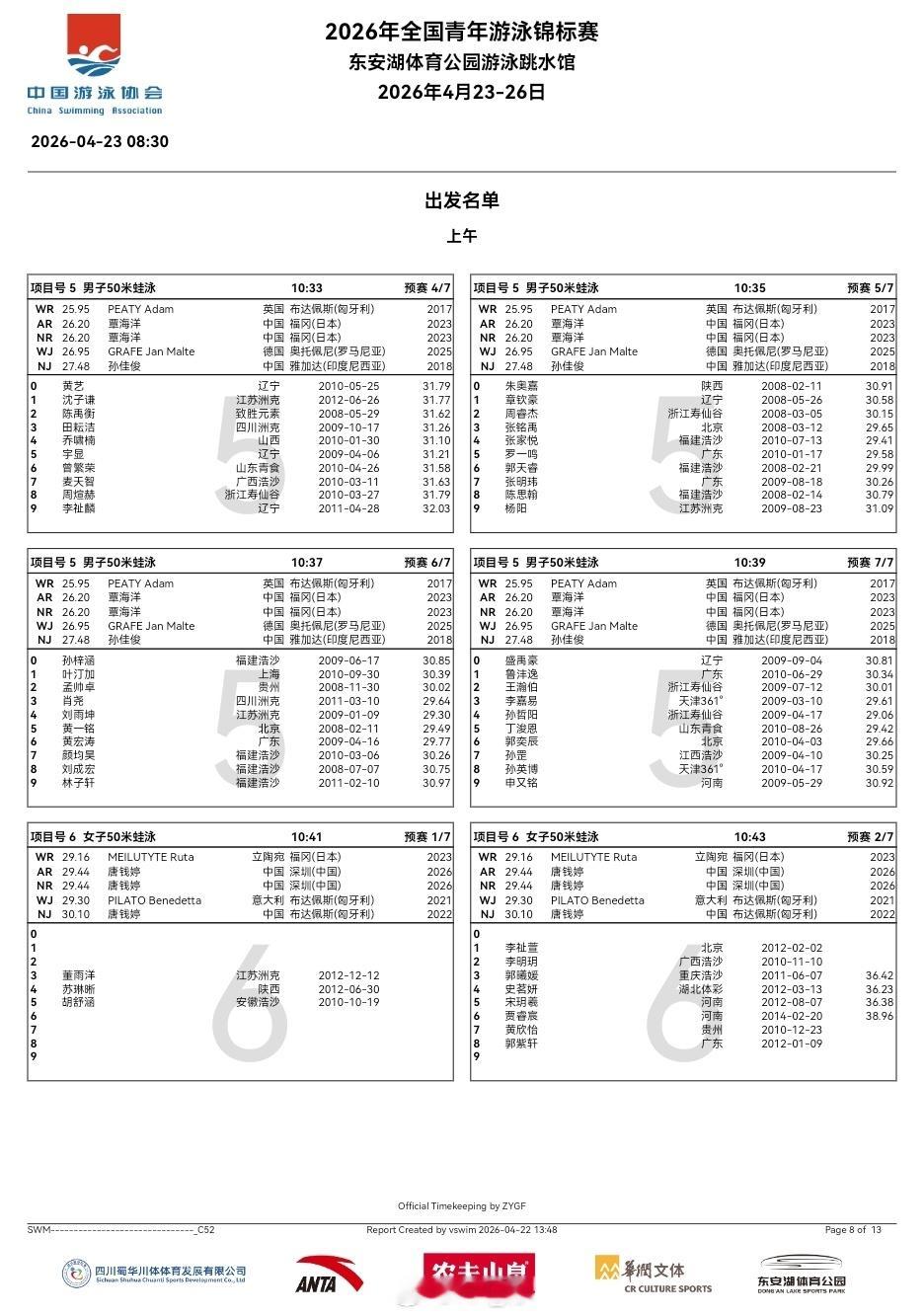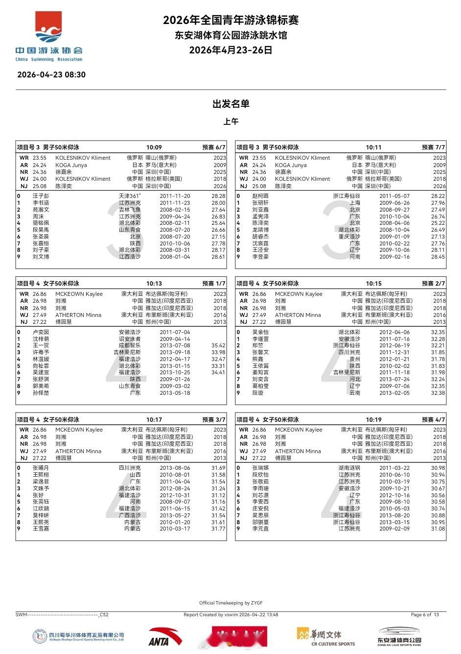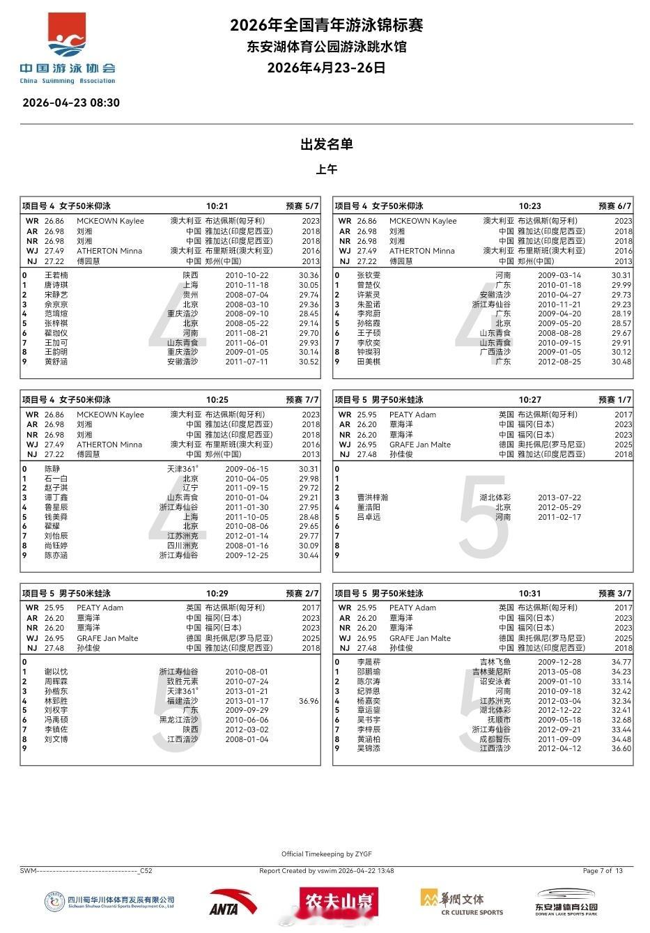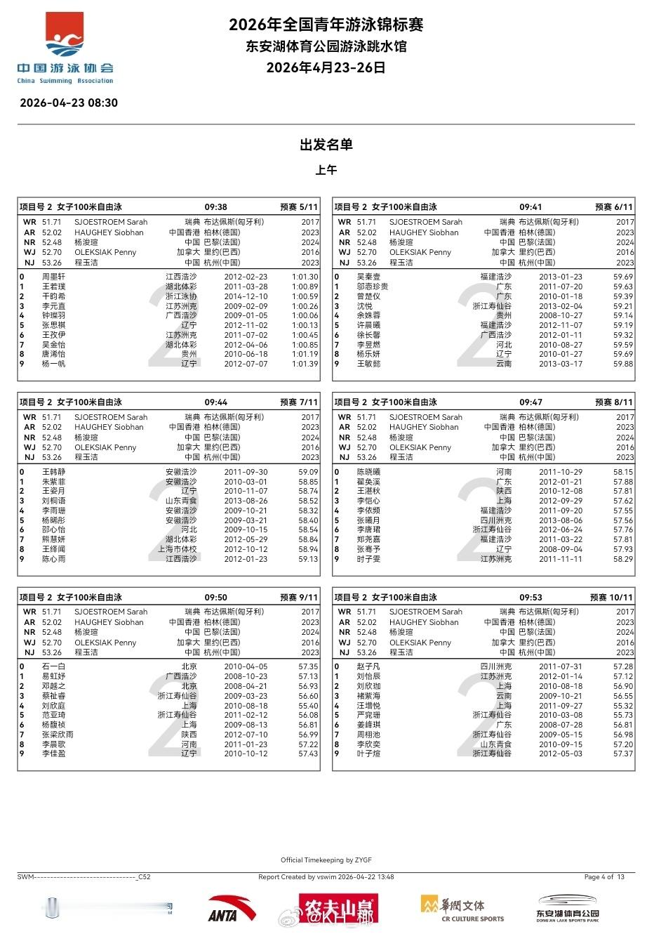 全国青年游泳锦标赛 第一天预赛秩序单