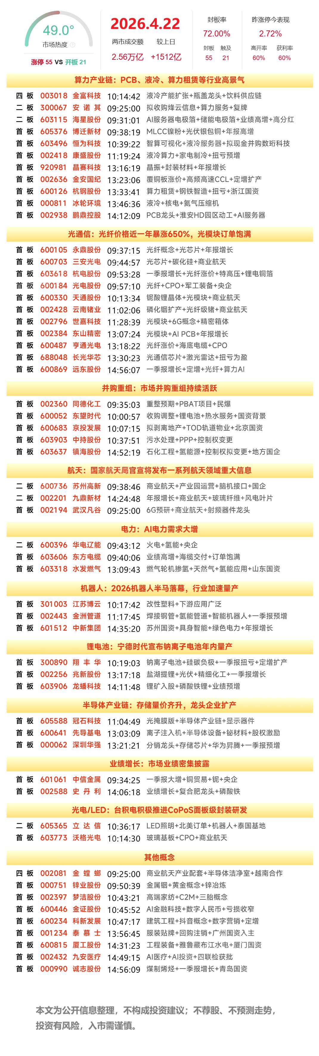4月22日A股涨停复盘:算力硬件方向全线走强,算力租赁、光纤概念活跃
