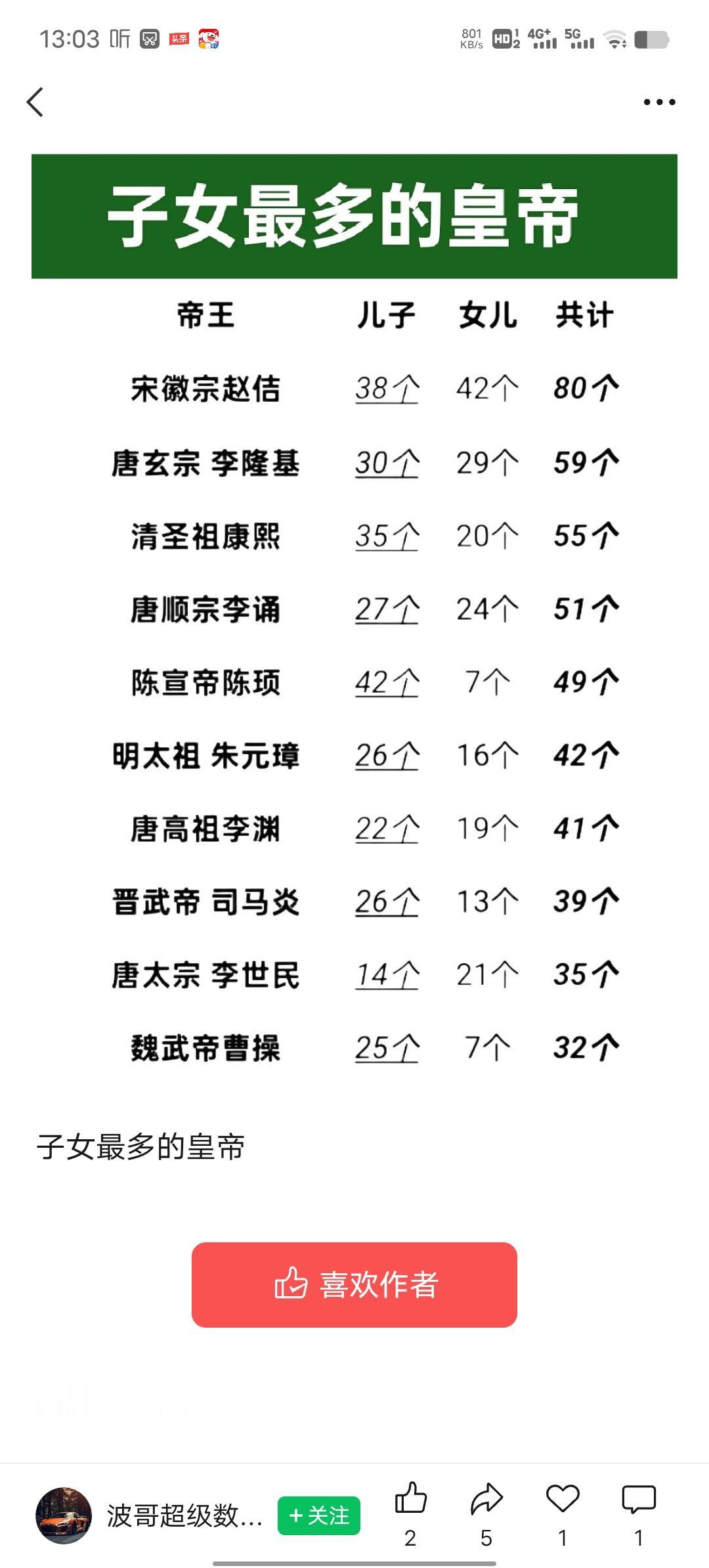 头条创作训练营 历史上子女多的皇帝还真不少。梁武帝萧衍排第十,《梁书・武帝纪》记载他有31个子女,14个儿子、17个女儿。他活了86岁,是古代少有的高寿皇帝,可惜晚年怠政引发侯景之乱,子女大多没好下场,有的死于战乱,有的自相残杀。 唐太宗李世民排第九,《旧唐书・太宗本纪》显示他有35个子女,14个儿子、21个女儿,在唐朝皇帝里子嗣数量顶尖。不过他儿子命运不佳,14个儿子中有3个早夭,还有3个有其他不幸遭遇。这些皇帝子女众多,却各有各的无奈啊。