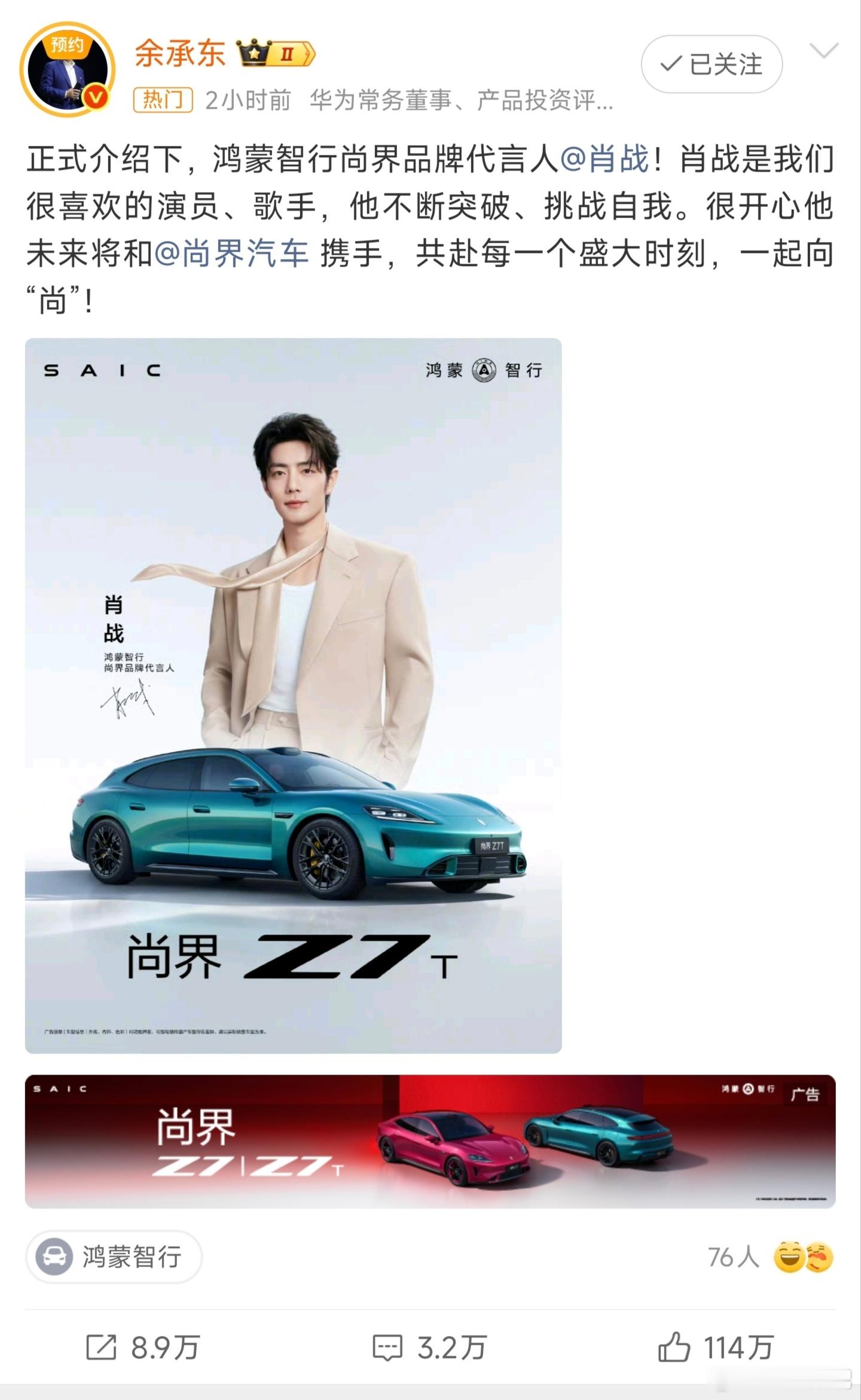 余承东官宣肖战代言鸿蒙智行尚界z7华为肖战