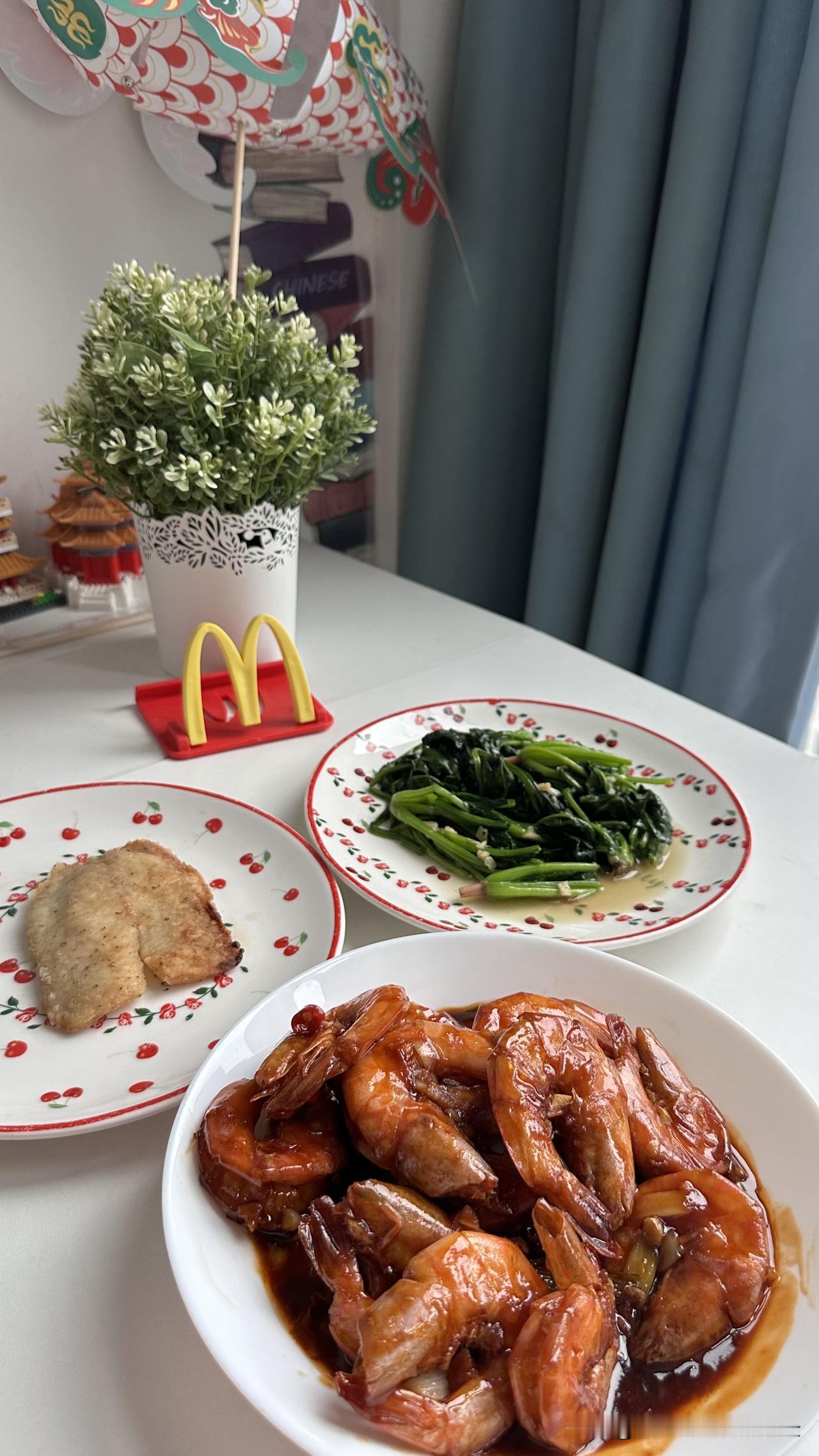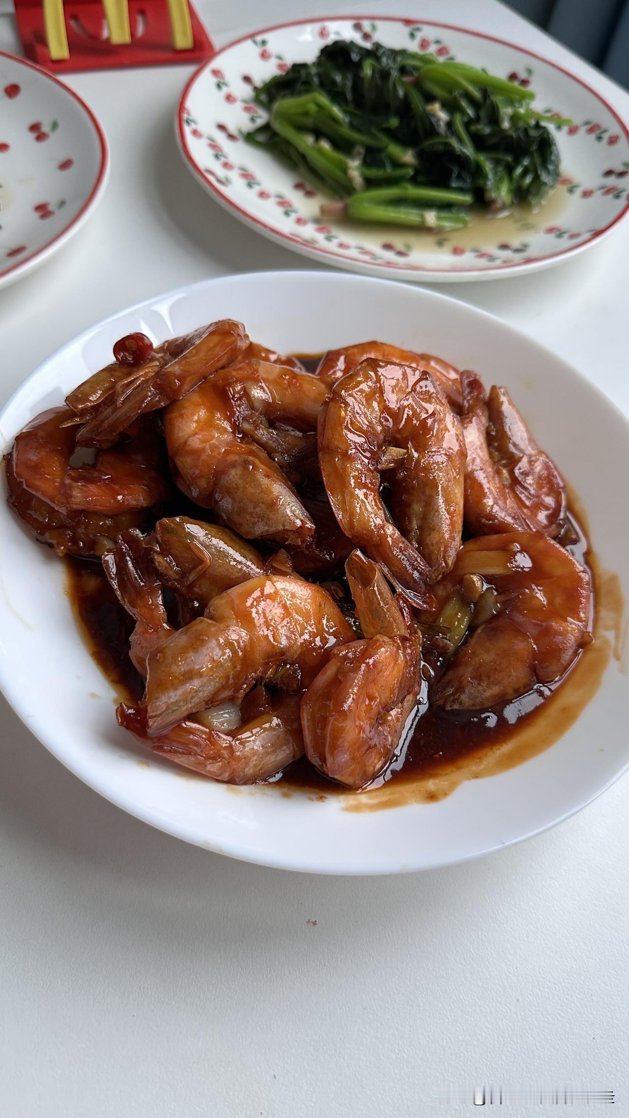 台北人在苏州,下雨天,一个人的晚餐。茄汁大虾、干煎罗非鱼、清炒菠菜,成本只要三十元,太划算了⋯ 最近嗜食水产鱼鲜,买了速冻活虾及单片包装的罗非鱼片。虾子肉质紧实、飽满肥大,一包1400g、69.9元,可以分成三顿吃。而罗非鱼片一包10片、30多元,每片只要三块多。 今天大虾做成茄汁口味,酱浓味美,好吃得停不下来。罗非鱼片解冻后,两面沾上生粉下锅小火干煎,煎至两片金黄后洒上椒盐,一口接一口。 清炒半把菠菜,有鱼、有虾、有时蔬的晚餐即完成。算一下成本还不到三十元。 下雨天的美食小确幸,好满足~