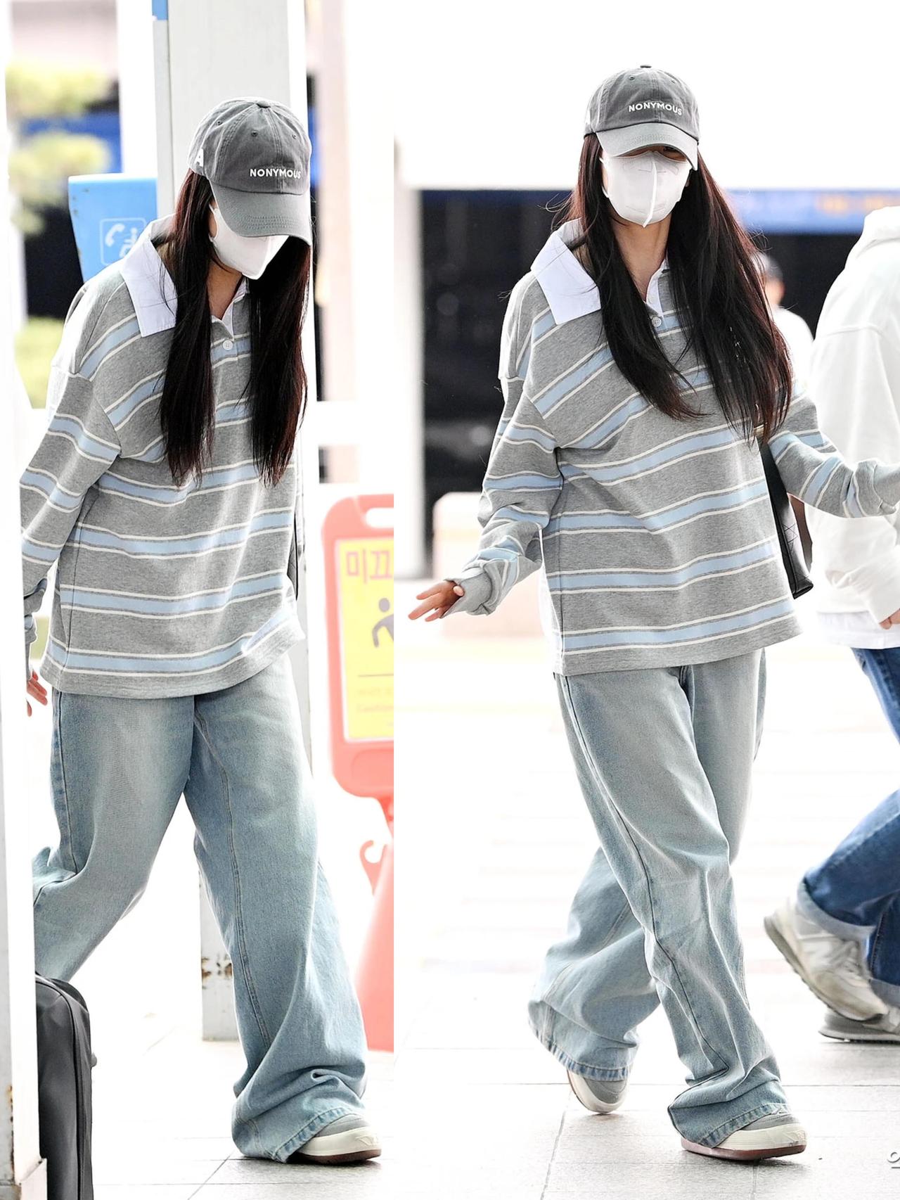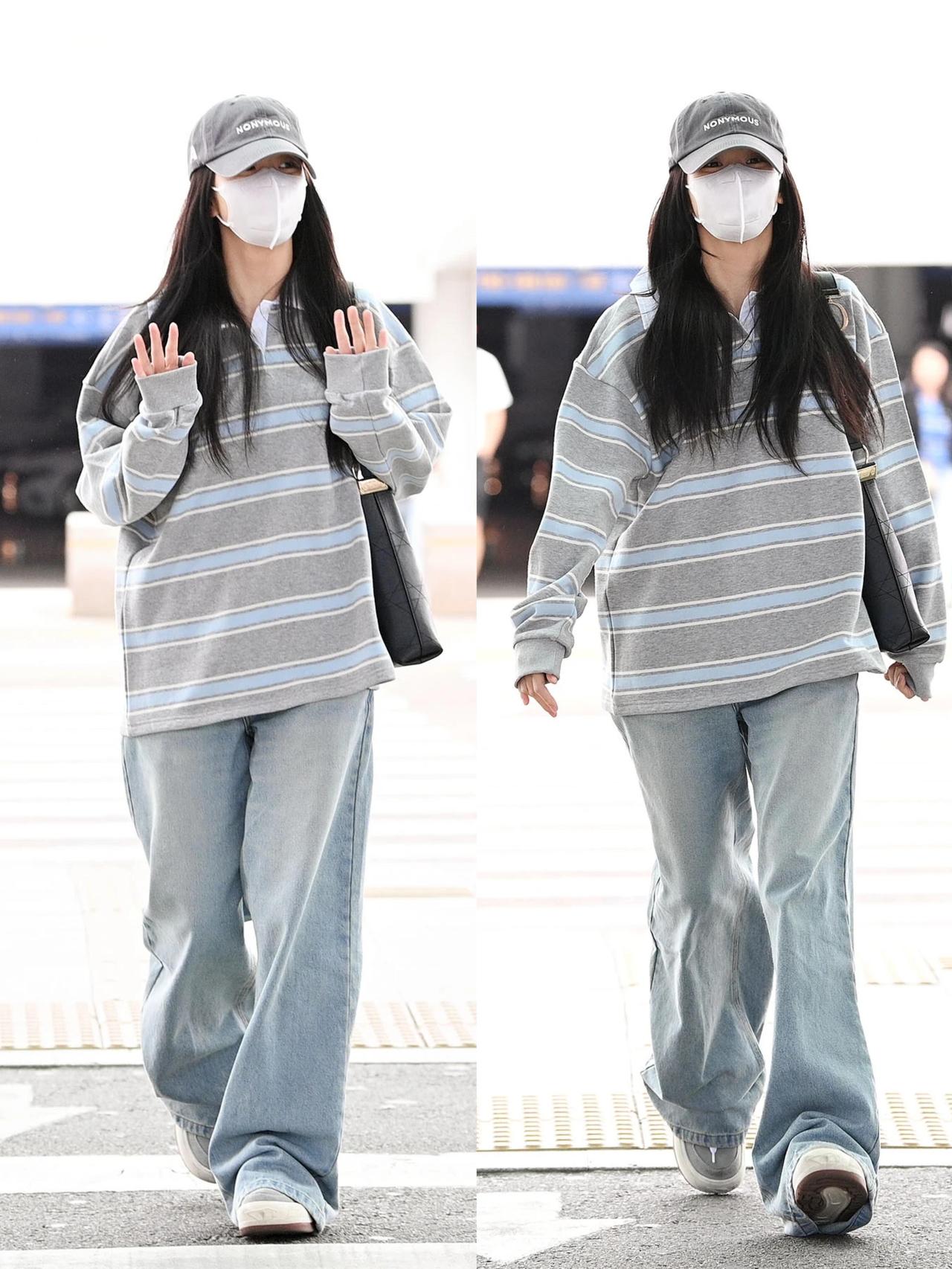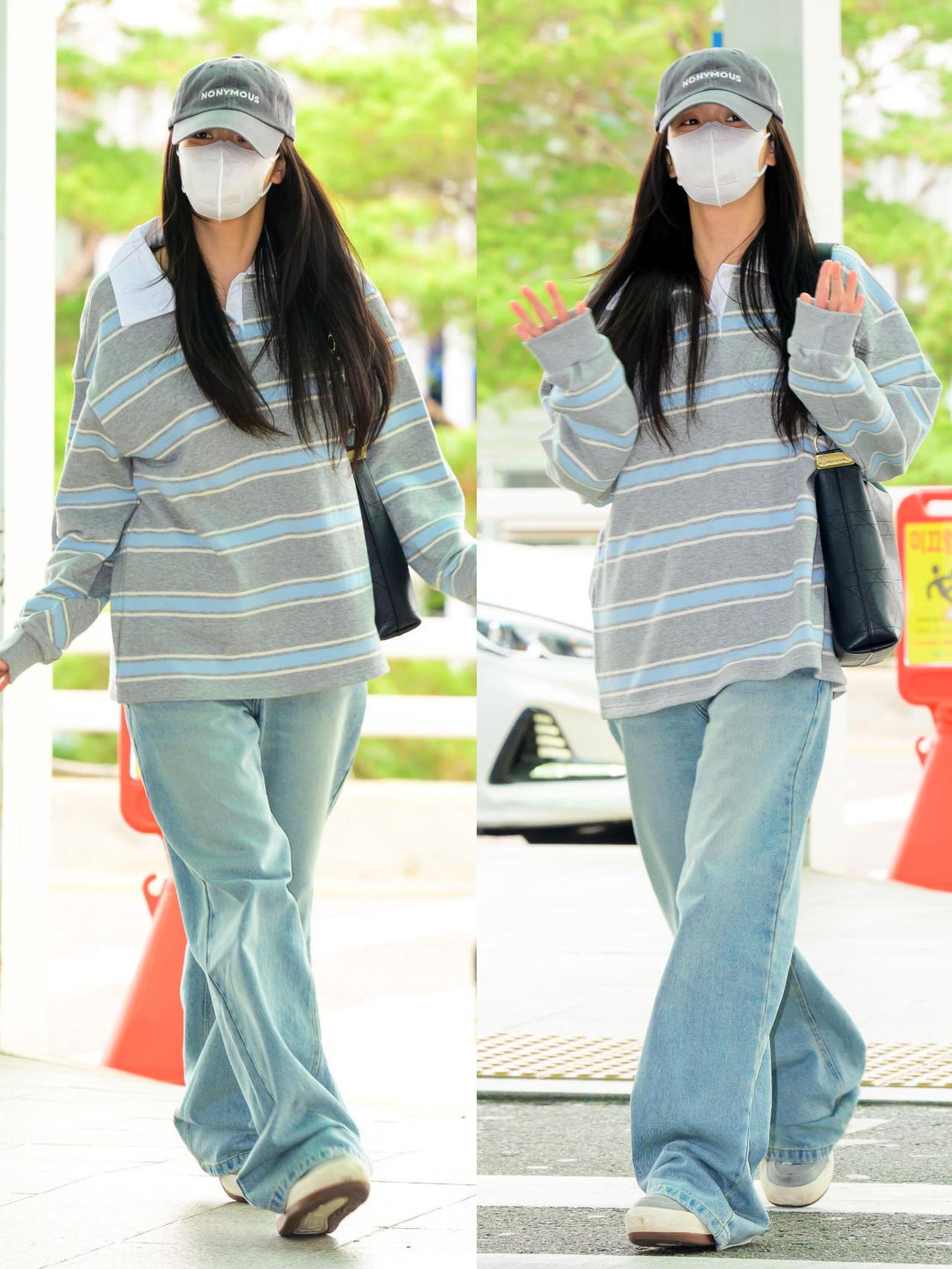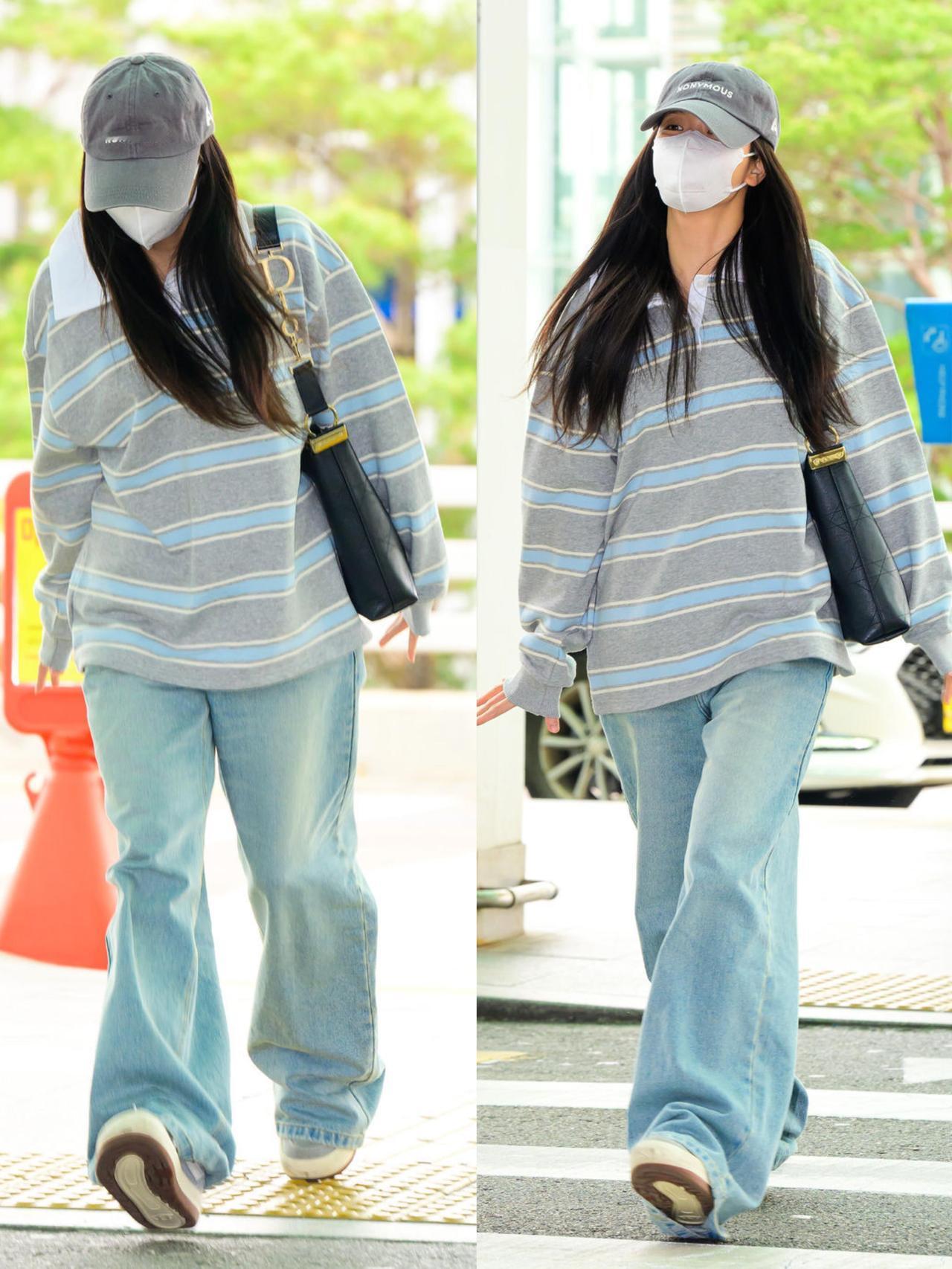 智秀街拍,这次的穿搭很慵懒! 浅灰蓝条纹Polo衫搭配水洗浅蓝阔腿牛仔裤,宽松版型自带松弛感,休闲又耐看。灰色棒球帽与黑包、小白鞋呼应,把色彩压得干净清爽,是毫不费力的韩系机场风。整套低饱和配色舒适又减龄,慵懒随性却又透着精致感,日常照搬也能穿出同款清爽气质,真的太会拿捏松弛氛围了。
