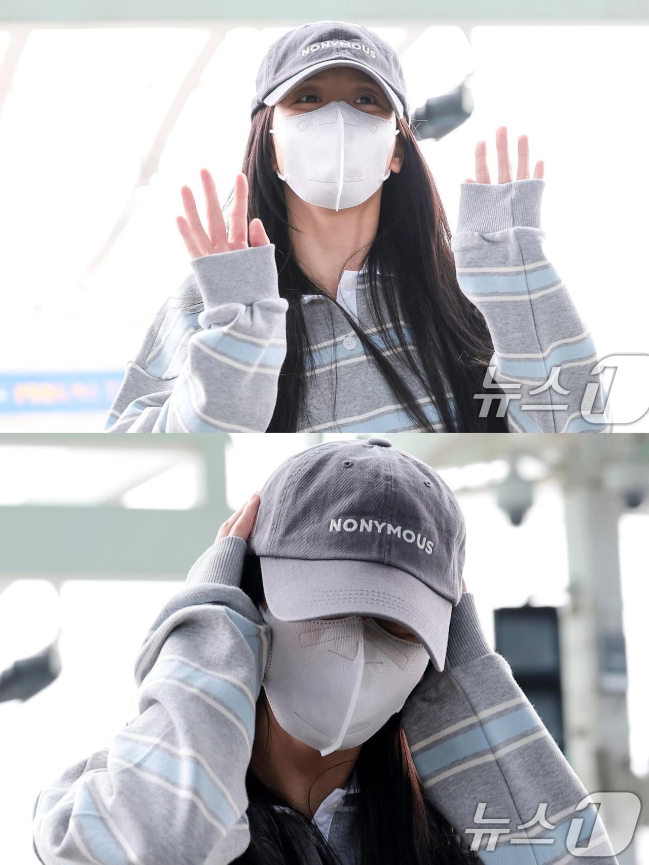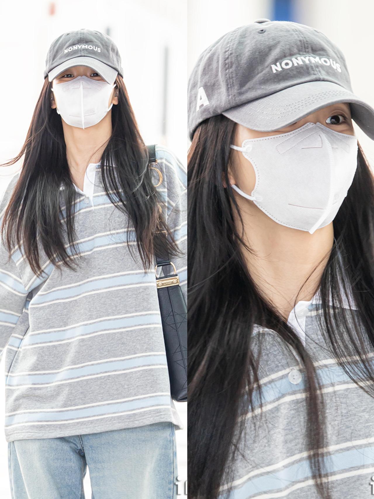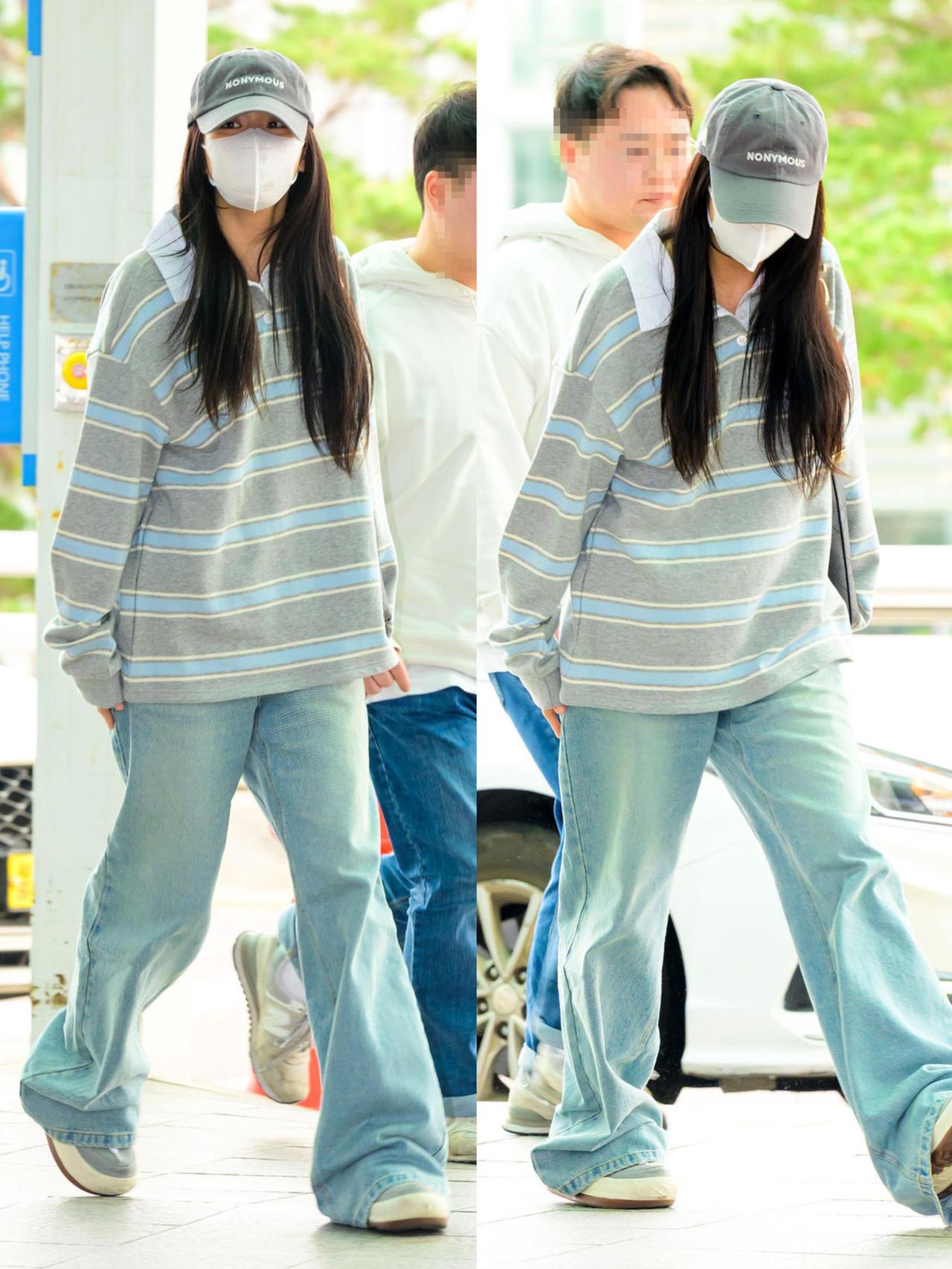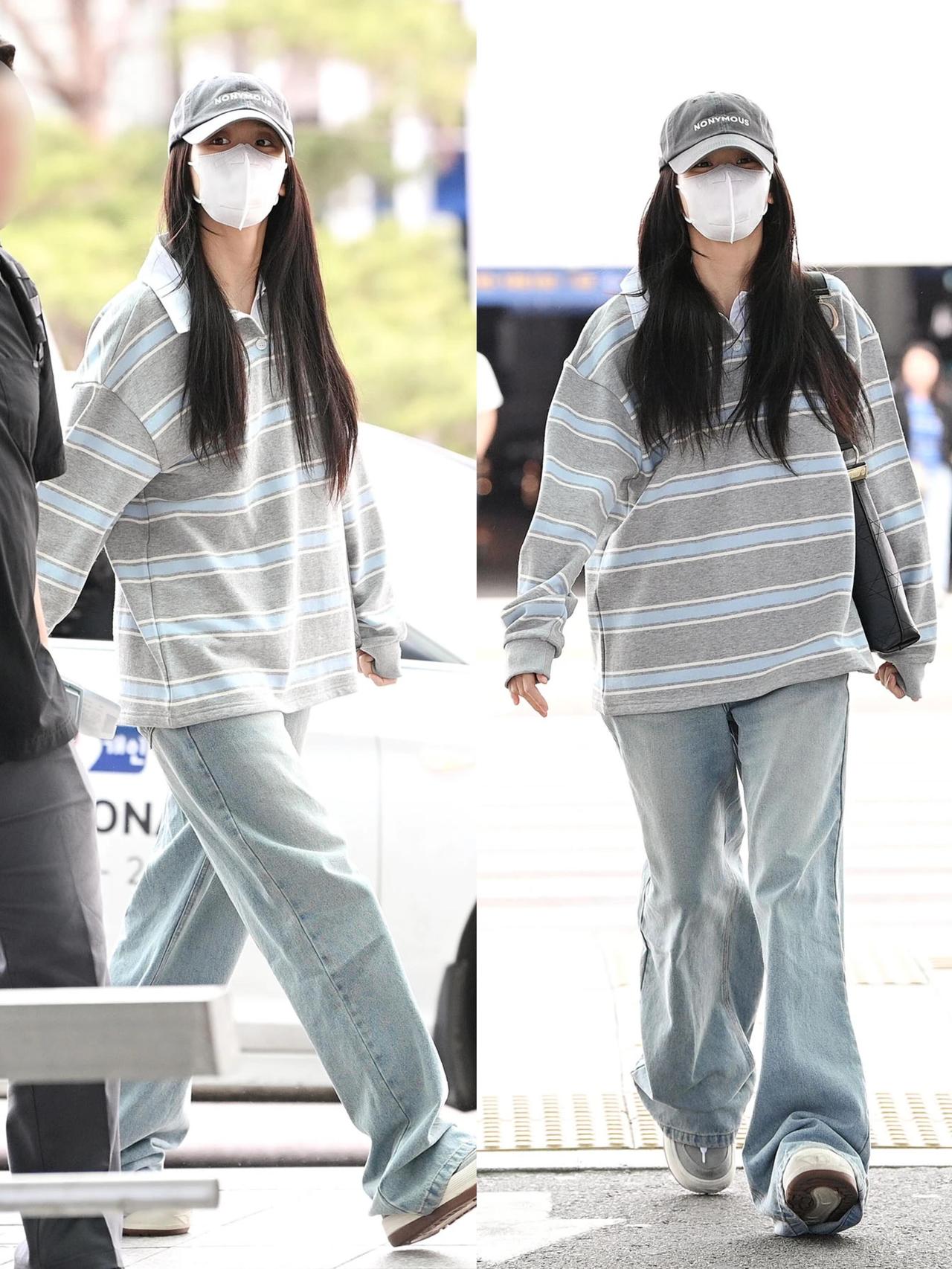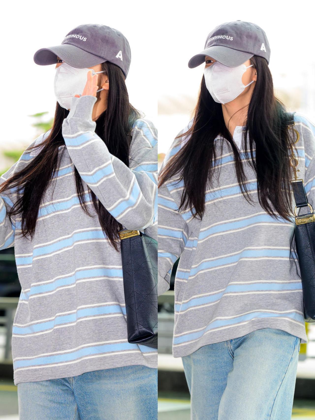 智秀街拍,这次的穿搭很慵懒! 浅灰蓝条纹Polo衫搭配水洗浅蓝阔腿牛仔裤,宽松版型自带松弛感,休闲又耐看。灰色棒球帽与黑包、小白鞋呼应,把色彩压得干净清爽,是毫不费力的韩系机场风。整套低饱和配色舒适又减龄,慵懒随性却又透着精致感,日常照搬也能穿出同款清爽气质,真的太会拿捏松弛氛围了。