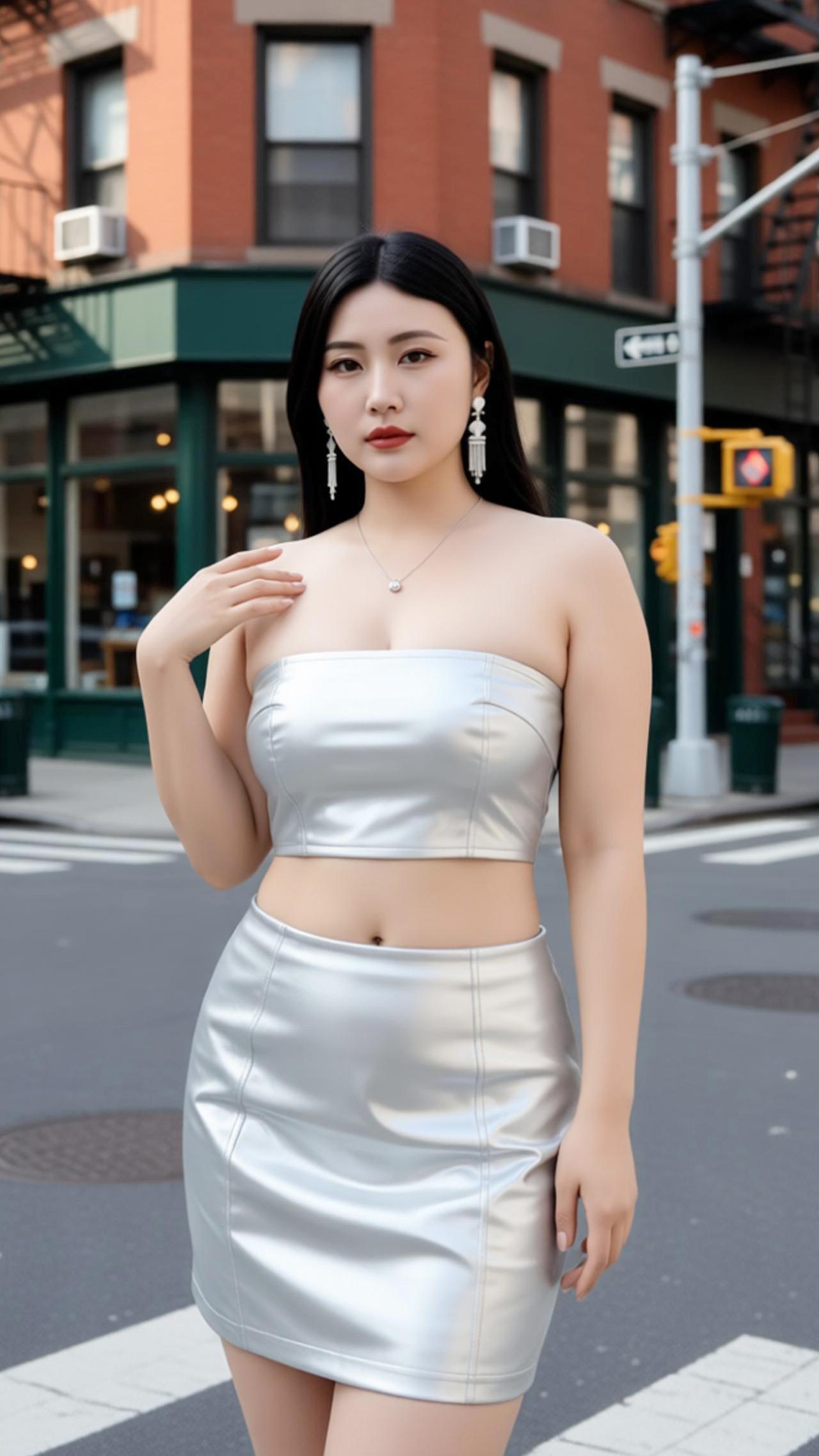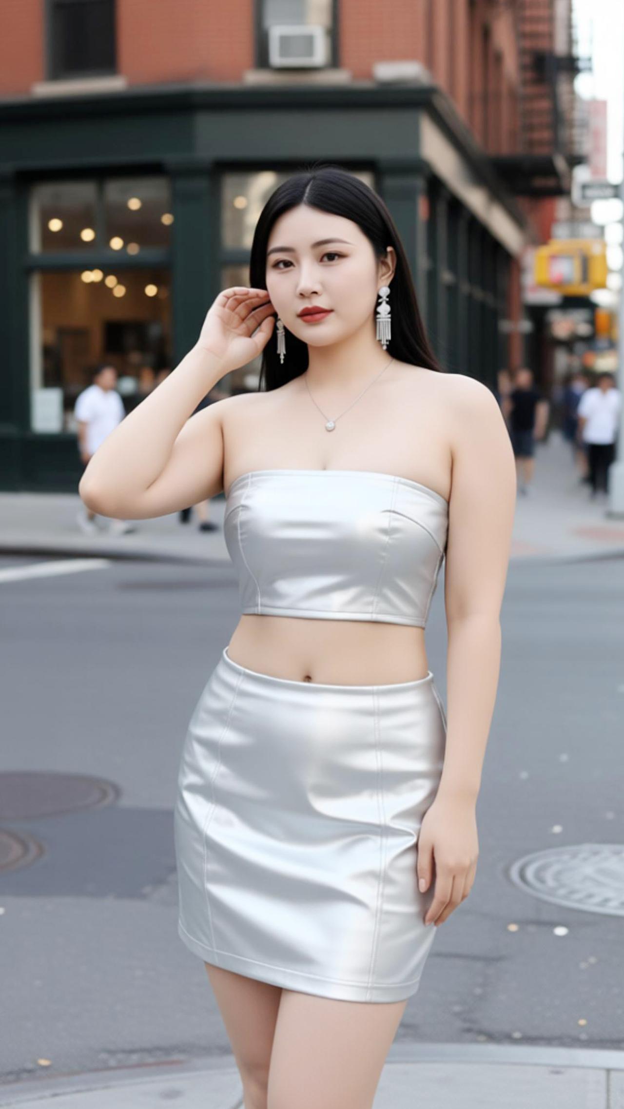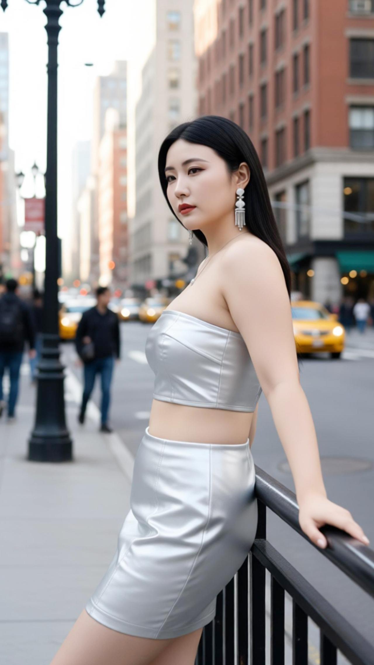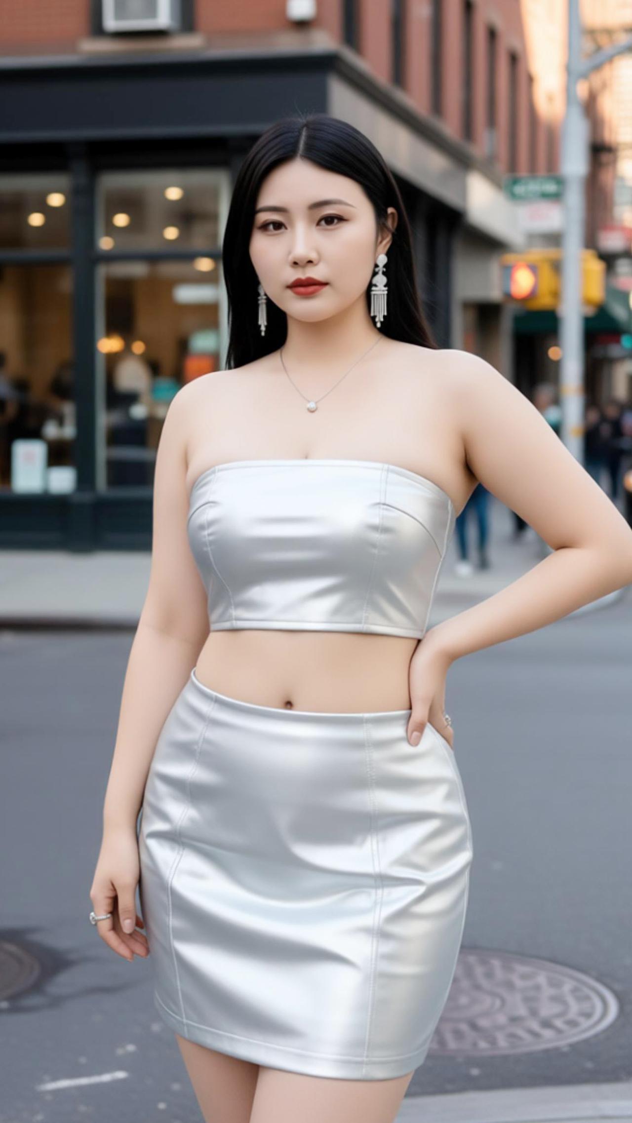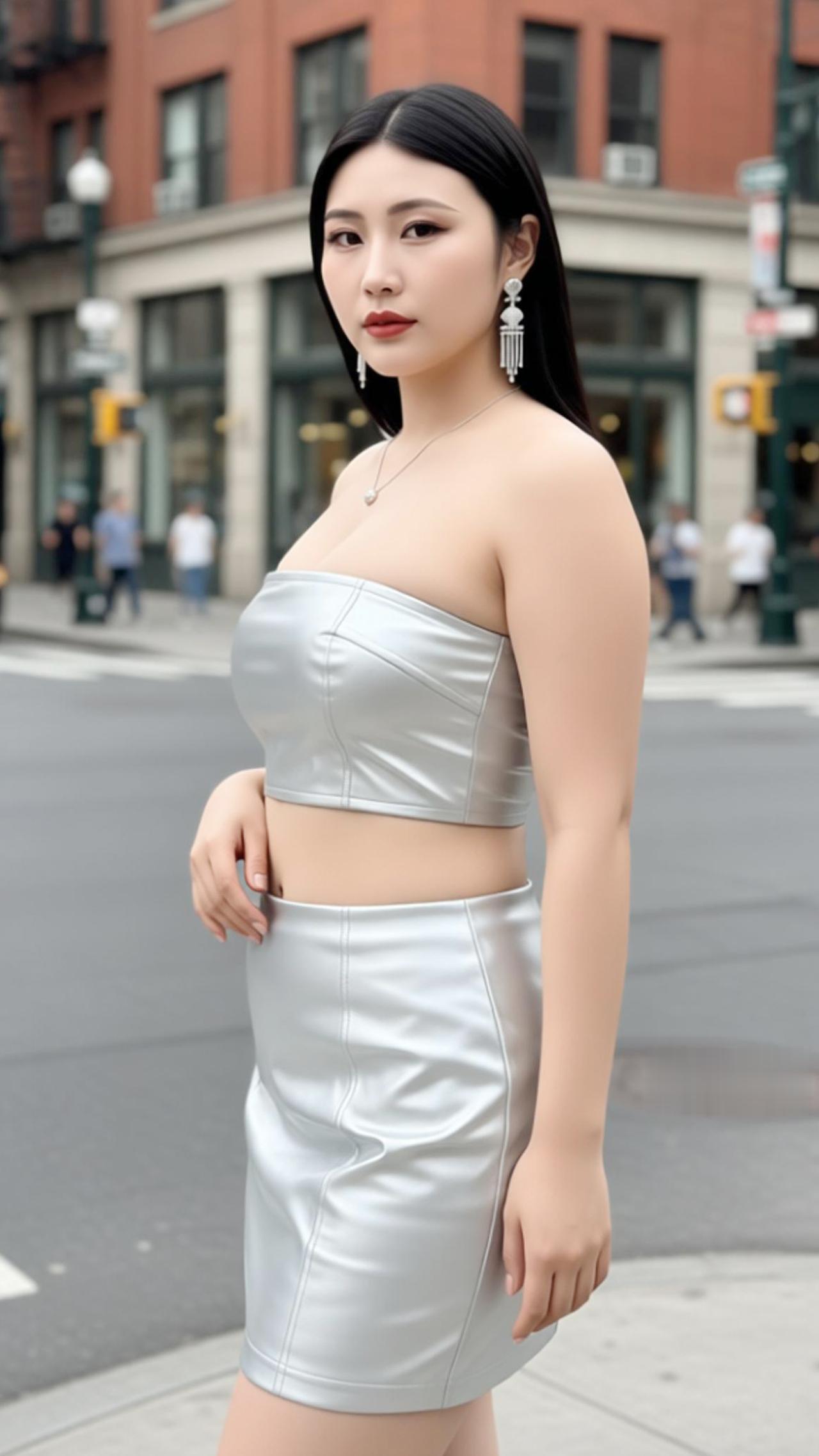 苏念念小姐姐身穿银色抹胸皮质套装,是街头最亮眼的时尚注脚。亮面皮质自带冷冽高级感,抹胸短款上衣勾勒肩颈线条,高腰短裙利落收束腰腹,将利落与性感完美融合。搭配流苏耳饰与细链项链,柔化皮质的硬朗,为造型注入灵动气质。漫步在复古街巷,金属光泽与砖红建筑碰撞出别样火花,每一步都踩在时尚的节拍上,尽显都市女性的自信与魅力。