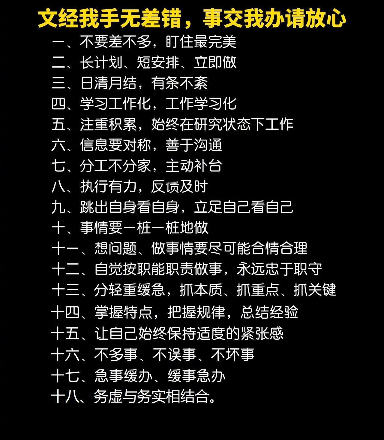 干好工作18法。 ·一、不要差不多,盯住最完美。 ·二、长计划、短安排、立即做。 ·三、日清月结,有条不紊。 ·四、学习工作化,工作学习化。 ·五、注重积累,始终在研究状态下工作。 ·六、信息要对称,善于沟通。 ·七、分工不分家,主动补台。 ·八、执行有力,反馈及时。 ·九、跳出自身看自身,立足自己看自己。 ·十、事情要一桩一桩地做。 ·十一、想问题、做事情要尽可能合情合理。 ·十二、自觉按职能职责做事,永远忠于职守。 ·十三、分轻重缓急,抓本质、抓重点、抓关键。 ·十四、掌握特点,把握规律,总结经验。 ·十五、让自己始终保持适度的紧张感。 ·十六、不多事、不误事、不坏事。 ·十七、急事缓办、缓事急办。 ·十八、务虚与务实相结合。