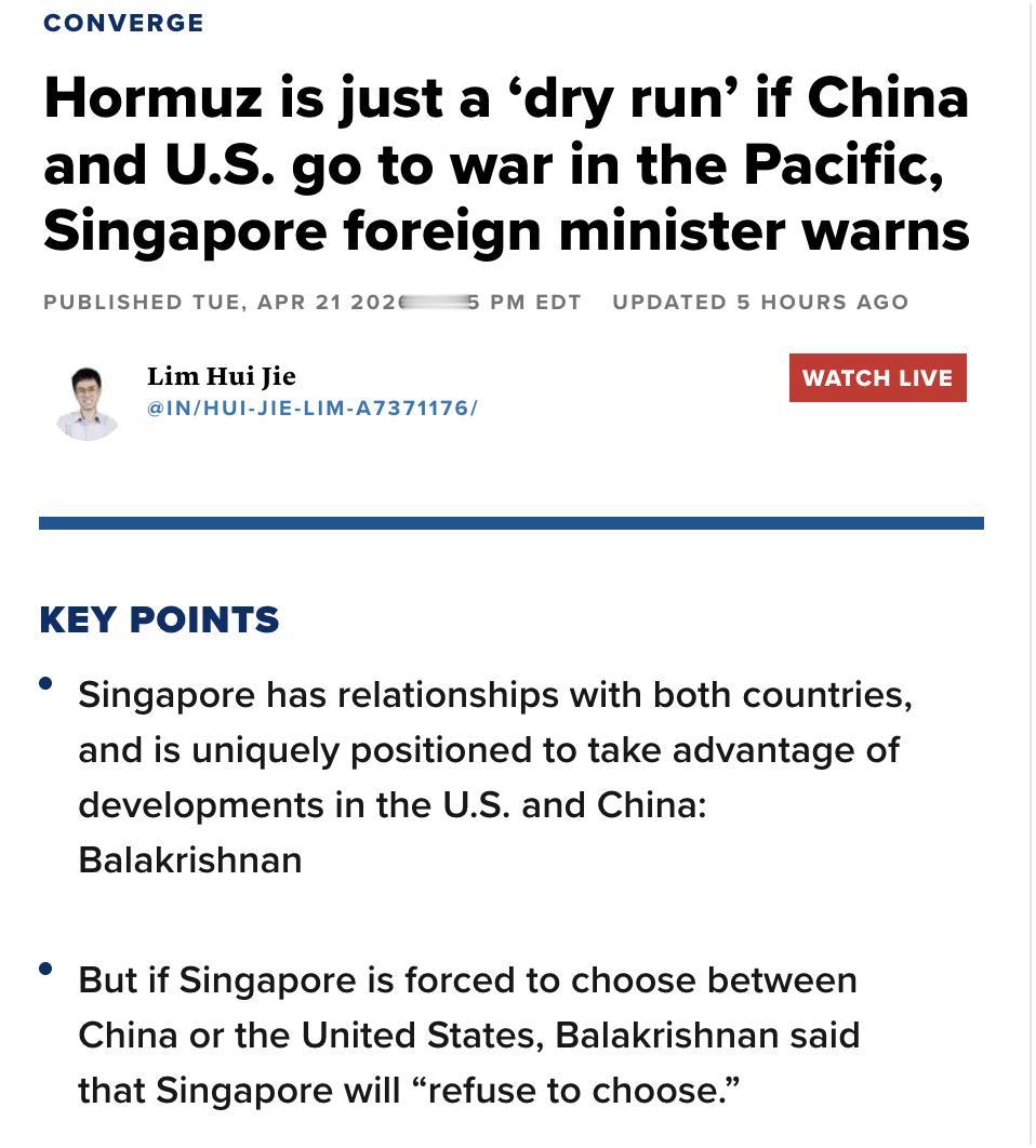 外媒:新加坡外长维文·巴拉克里希南在CONVERGE LIVE论坛上发出警告,若中美在太平洋爆发冲突,当前霍尔木兹海峡的局势将只是一次"预演",届时冲击规模将远超于此。 在中美博弈背景下,新加坡明确拒绝"选边站"。维文指出,美国是新加坡最大外资来源国,约有6000家美国企业在新加坡运营,新加坡对美货物贸易逆差约36亿美元;与此同时,中国是新加坡最大贸易伙伴,而新加坡也是中国最大外资来源国。他强调:"我们依据新加坡的长远国家利益行事,不会被任何人利用。" 维文还就马六甲海峡问题表态,新加坡、马来西亚和印尼在维持航运通道畅通方面拥有共同战略利益,不会仿效伊朗对霍尔木兹海峡征收过路费的做法。马六甲海峡最窄处仅两海里,远窄于霍尔木兹的21海里。他重申新加坡遵守《联合国海洋法公约》,"过境通行权对所有人开放,我们不会参与任何封锁或征收通行费的行为。"