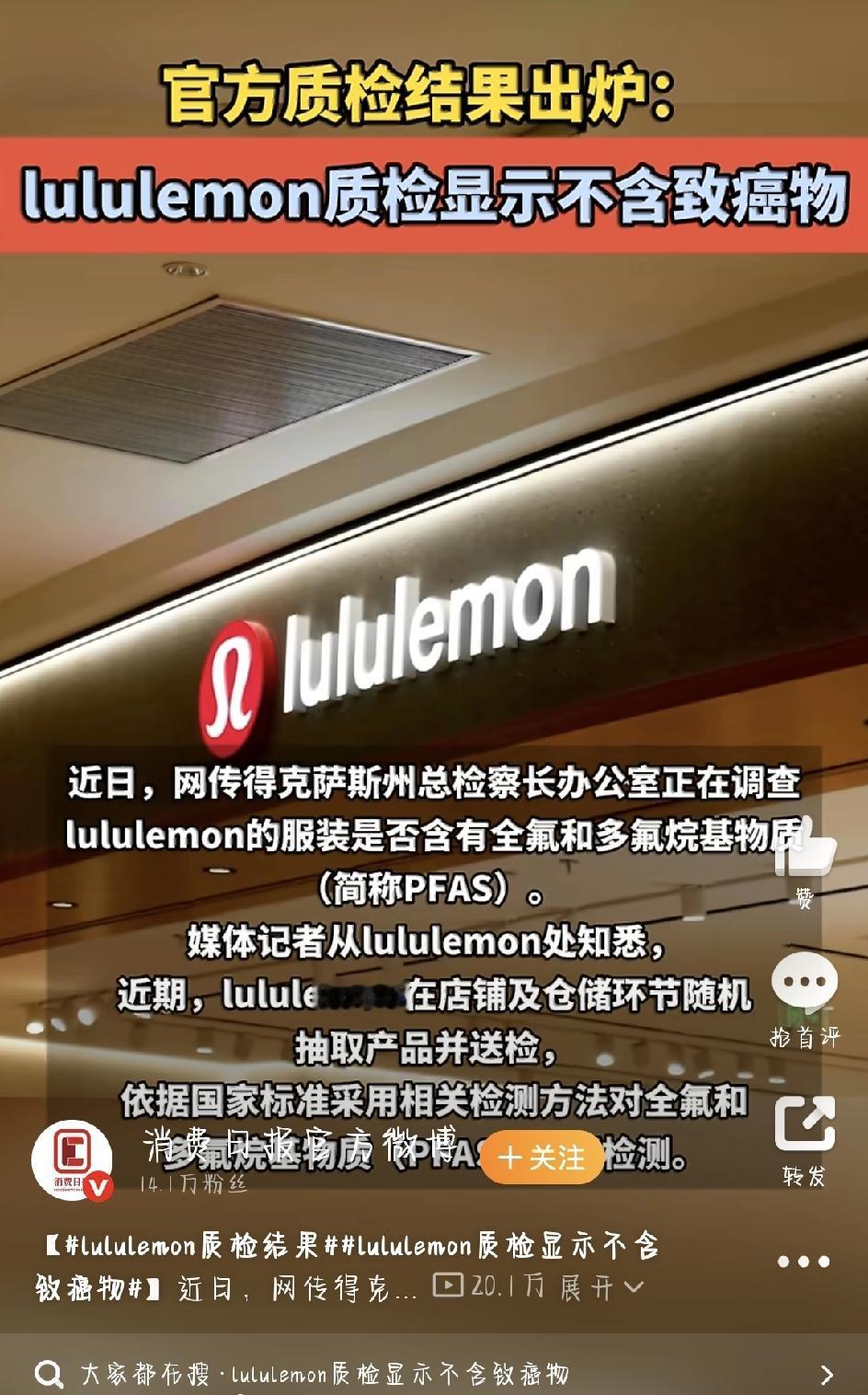 最近,运动品牌lululemon因为“PFAS争议”在网上闹得挺大,很多人都在担心自己买的衣服到底安不安全。4月22号,这事儿总算有了明确说法——官方出了检测结果,监管部门也同步抽查了,算是给大家吃了颗定心丸。 事情得从几天前说起。外媒报道,美国得克萨斯州总检察长办公室要调查lululemon的服装里是否含有全氟和多氟烷基物质,也就是大家常说的PFAS。这种物质被叫做“永久性化学品”,特别难分解,以前很多防水、防污的衣服里都会用到。有研究说它可能跟内分泌紊乱、癌症等健康问题有关,消息一出来,网上立马炸了。国内不少消费者也跟着慌了——大家买lululemon,本来就是冲着它主打健康、舒适的定位,要是真含这种有害物质,那也太闹心了。 就在大家等着看结果的时候,4月22号,@中新经纬 第一时间从lululemon官方拿到了检测报告。结果显示,他们从店铺和仓库里随机抽的产品,经过专业检测,PFAS物质都没有检出。官方还特意强调,一直把消费者的健康安全放在第一位,国内所有在售产品,都完全符合中国的法律法规以及国家、行业各项标准。 更让人放心的是,监管部门也出手了。针对最近的舆情,相关部门专门抽查了lululemon部分有防水功能的产品,检测结果同样是——没检出PFAS。也就是说,不管是品牌自己送检,还是监管部门抽查,结果都一样:在国内买的lululemon衣服,PFAS这一项是安全的。 其实从一开始,lululemon就没回避问题。他们早就回应过,公司早就不使用PFAS了,以前也只是在少量防水产品里用过,而且在2023财年就已经逐步淘汰了这种物质,还要求所有供应商定期找第三方机构检测限用物质,确保合规。这次的检测结果,正好印证了他们的说法。 不过也得说一句,这次争议也反映出大家越来越在意健康了。现在买东西,大家都更关注成分和安全,这对品牌来说也是好事,能逼着它们不断升级标准、改进生产。而且我国现在也在完善相关管控,比如PFAS里的全氟辛烷磺酸等已经被纳入重点管控清单,还有相关检测标准在落地,以后大家买衣服也会更放心。 总的来说,这次lululemon的PFAS风波,最终结果是国内产品安全过关,没检出有害物。大家不用再为这事儿担心了,该穿的放心穿就行。当然,以后买功能性产品,多留个心眼看看成分、检测报告也没坏处,毕竟健康永远是第一位的。希望所有品牌都能像lululemon这样,用真实的检测结果来回应消费者的信任,也让我们买东西的环境越来越透明、安心。 来源:消费日报官方微博
