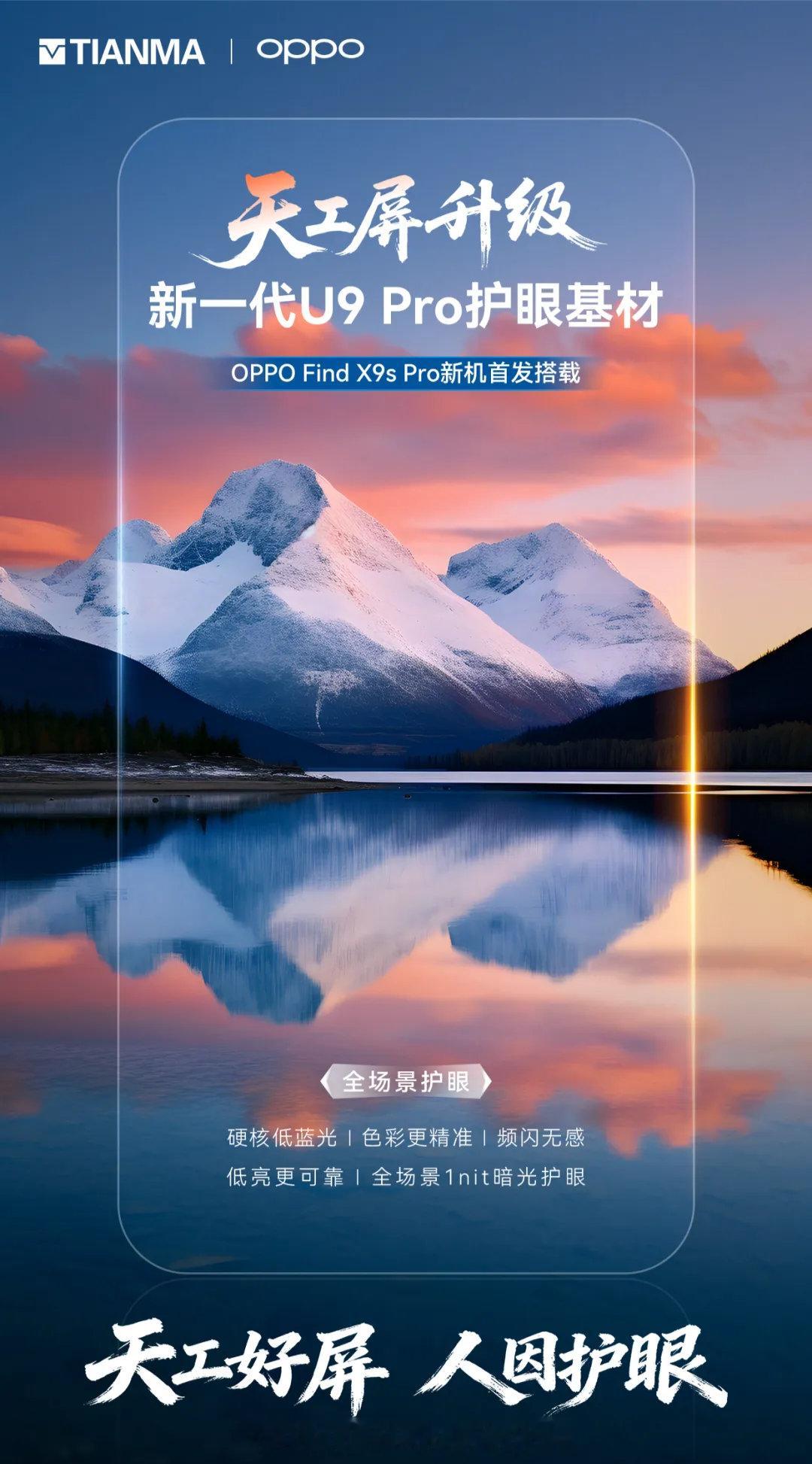 天马官方随后发文宣布,OPPO Find X9s Pro 新机首发搭载新一代 U9 Pro 护眼基材。