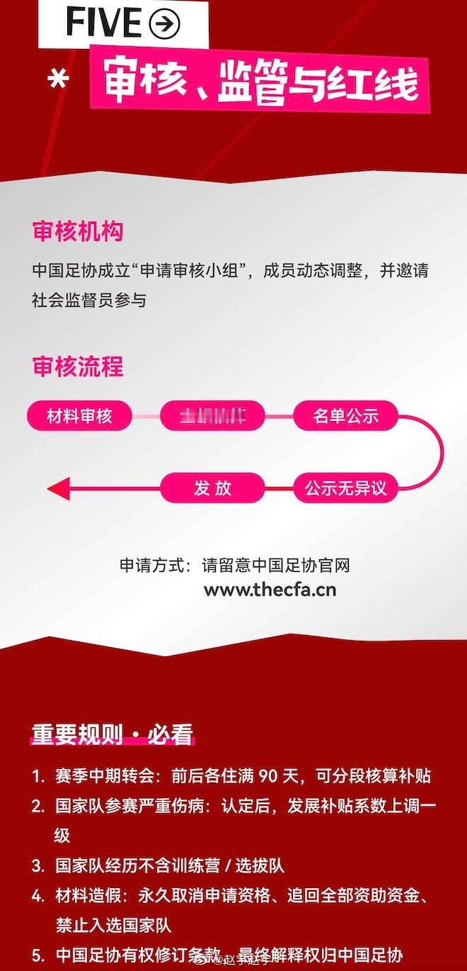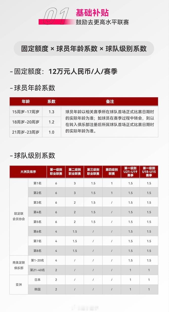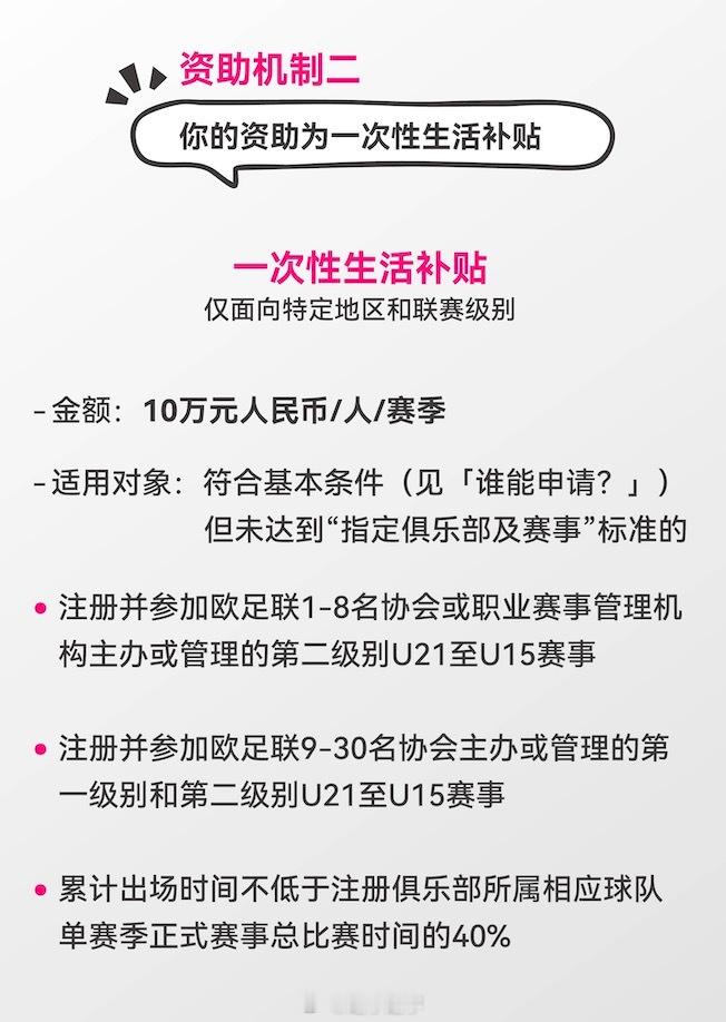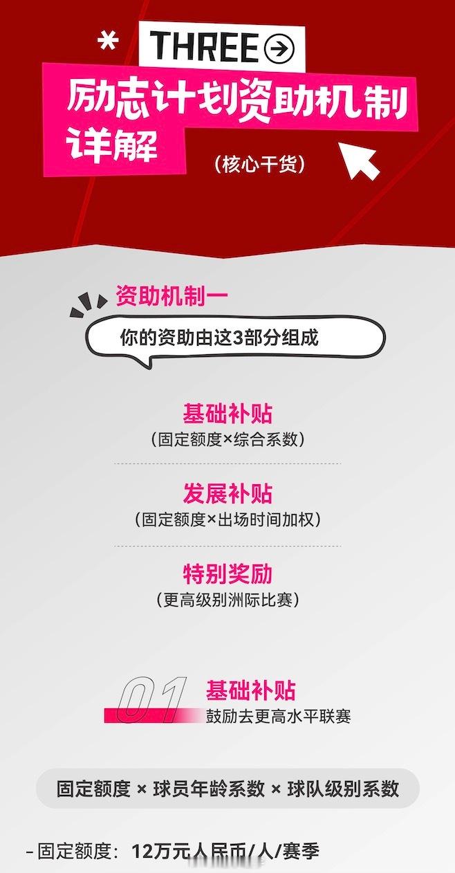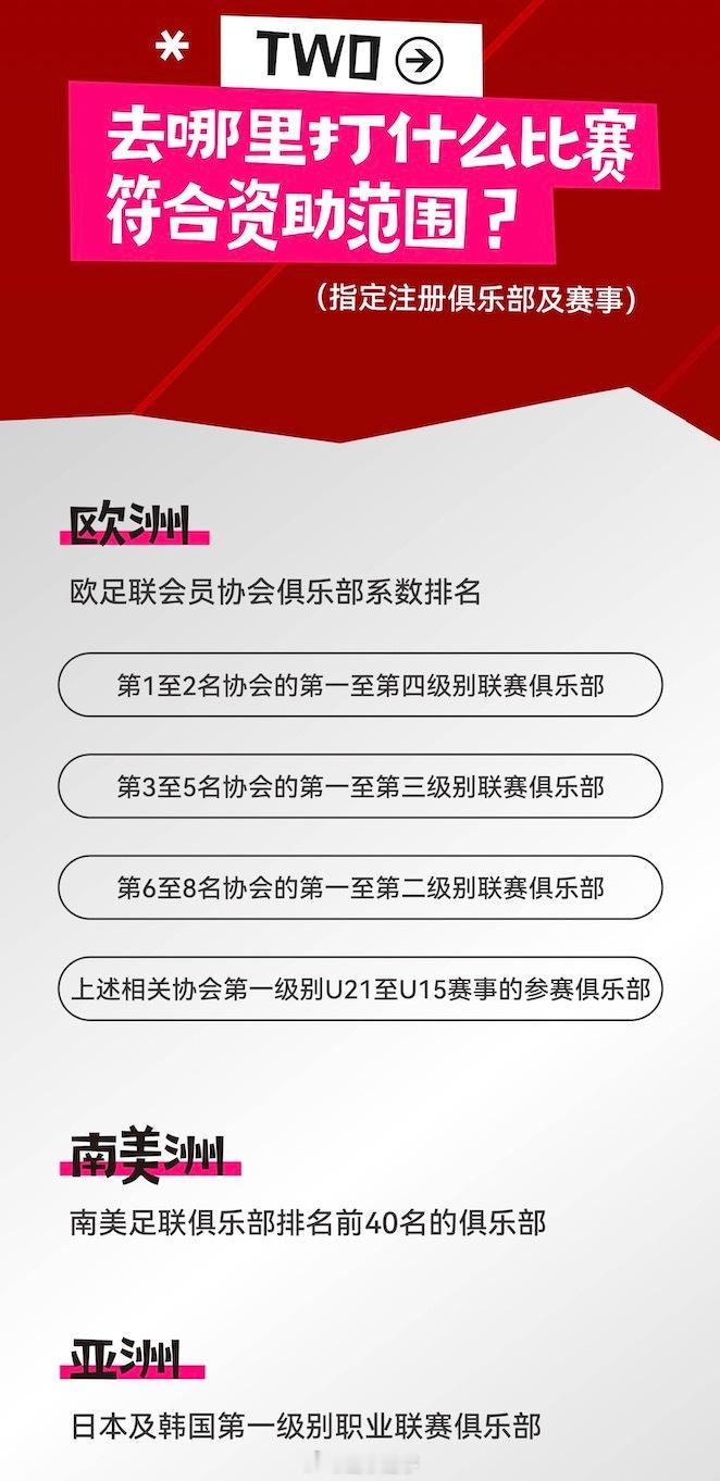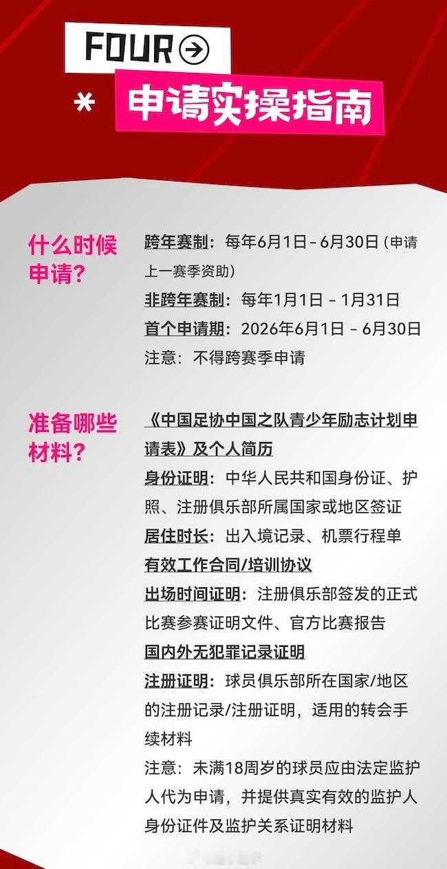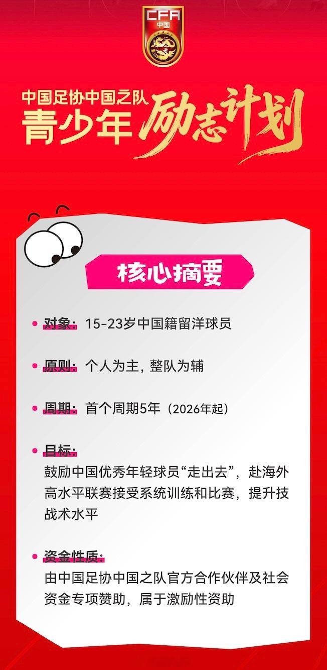 关于中国足协中国之队青少年励志计划(留洋)的全部细节,都在这九张图里了,感兴趣可以看一下。尤其是关于补助——说留洋能获得多少钱资助的问题,都说得很详细。举个例子,23岁以下球员,只要能登陆英超,就可以获得72万元补助。如果能踢上更多比赛,就会获得更多自助和补贴。我觉得这非常好,最起码让那些留洋的球员或准备留洋的球员,多了一份保障。就连出席活动的嘉宾、前国脚杨晨都开玩笑地说,我们当年还有这个政策,我可能16岁就去留洋了。
