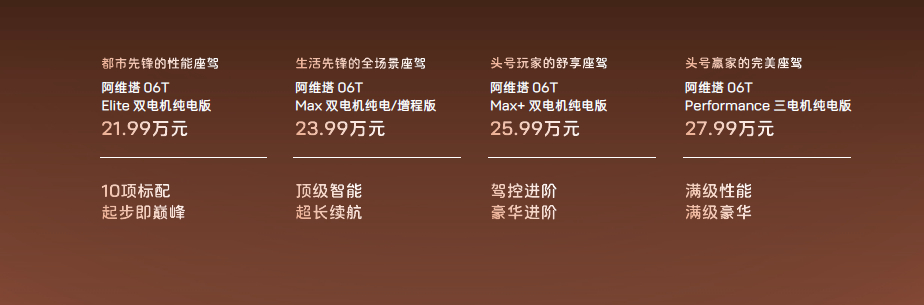 年轻人第一台性能车 现在新能源车都在卷旅行车、卷性能,但真正做到原创设计、极致性能、顶级智能辅助驾驶三者拉满的,我只服阿维塔 06T。它没有跟风套壳,而是坚持做自己的未来美学,低趴宽体、游隼姿态,把曾经小众的风格,变成人人都能驾驭的主流颜值。性能上更是不讲道理,三电机 968 匹马力,2.78秒破百进入2秒俱乐部;双电机后驱也能做到3.74秒,是目前量产最快后驱电车。搭配大师漂移模式,可玩性直接拉满。更重要的是快得很稳,太行分布式电驱带来全域稳控,雨雪不滑、弯道不飘、紧急避险不慌。华为乾崑智能辅助驾驶搭载896线激光雷达与27颗传感器,超远距精准识别障碍物,配合MoLA大模型实现自然流畅交互。权益后到手价21.59万起!今日24点前下定,可享3000元意向金权益!这才是年轻人真正想要的全能性能车。阿维塔06T上市21.99万起