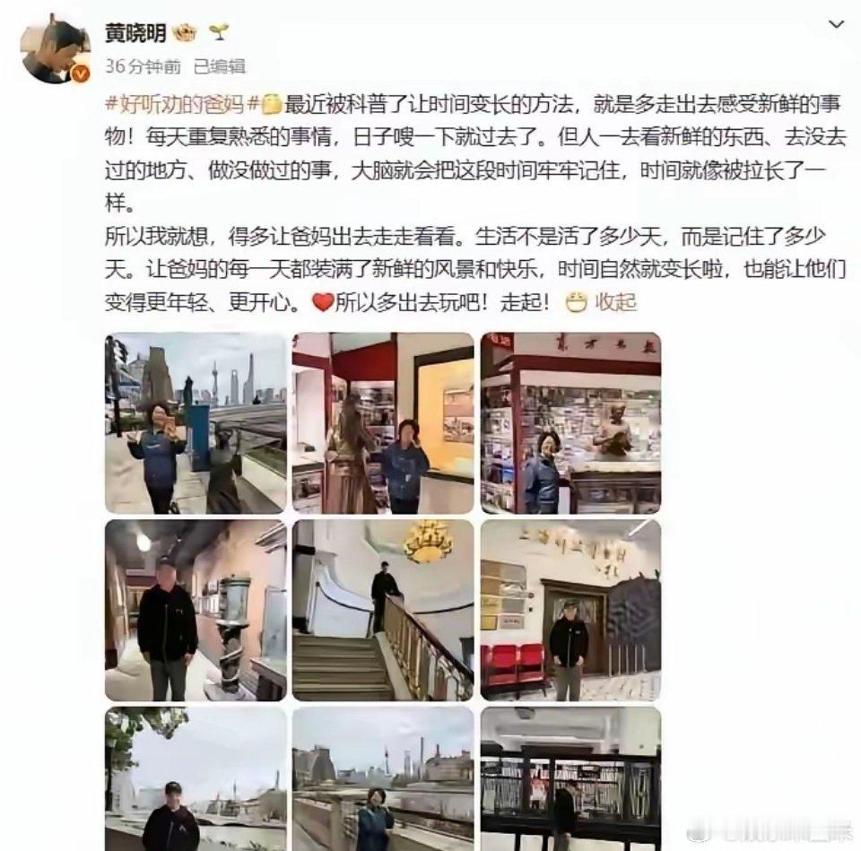 黄晓明,说话越来越有水准了!!4月21日,一向以“霸总语录”出圈的黄晓明冲上热搜,这次不是八卦绯闻,而是他带着父母出游,顺便分享了一个超治愈的延长时间的生活哲学!他在微博里说:每天重复熟悉的事情,日子嗖一下就过去了。但人一去看新鲜的东西、去没去过的地方、做没做过的事,大脑就会把这段时间牢牢记住,时间就像被拉长了一样。还配上了和父母出游的照片,文字温柔又通透,瞬间戳中了无数网友的心。不少人感慨:原来这才是让时间变慢的秘诀!比起每天重复的生活,带父母多出去走走,看不一样的风景,不仅能留下更多温暖的回忆,还能让父母的生活变得更鲜活。黄晓明用行动诠释了陪伴是最好的礼物,也让大家明白:生活的长度,从来不是活了多少天,而是记住了多少个快乐的瞬间。这波走心分享,直接让黄晓明的路人缘蹭蹭上涨,网友直呼:晓明哥这格局,终于不油了!你们都有多久没带父母出去走走了