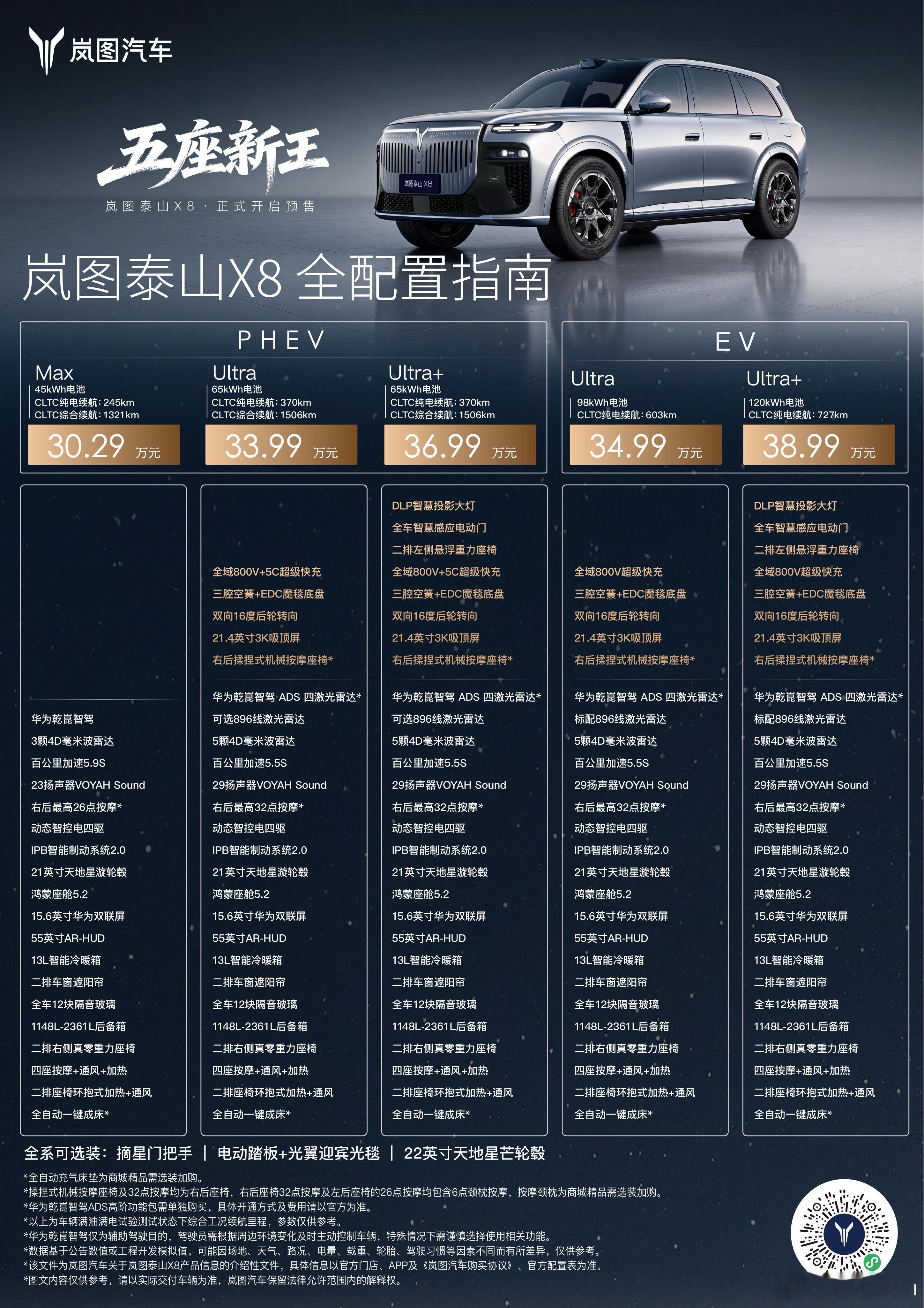 岚图泰山X8一共5个版本我最推荐PHEV的Ultra版本65度电池,纯电续航370KM,支持800V+5C快充,还有后轮转向、三腔空悬。当然加3万可以买到Ultra+,不过新增的配置多是情绪价值取向,个人觉得这三万可以省,主要看你喜好。问题来了,你最推荐哪一款?岚图泰山X8预售53分钟订单破1.5万30.29万起岚图泰山X8预售岚图泰山X8五座新王移动总统套房
