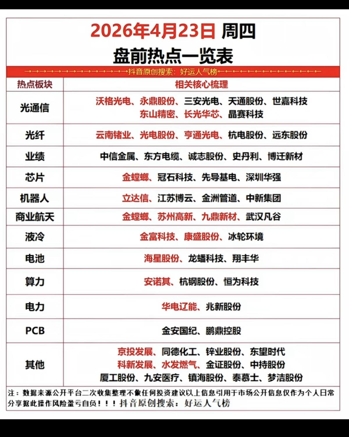 4.23周四 市场热点方向+投资逻辑! 1.光通信,PCB 2.光纤光缆,算力 3.机器人 4.商业航天 5.液冷服务器 6.电池