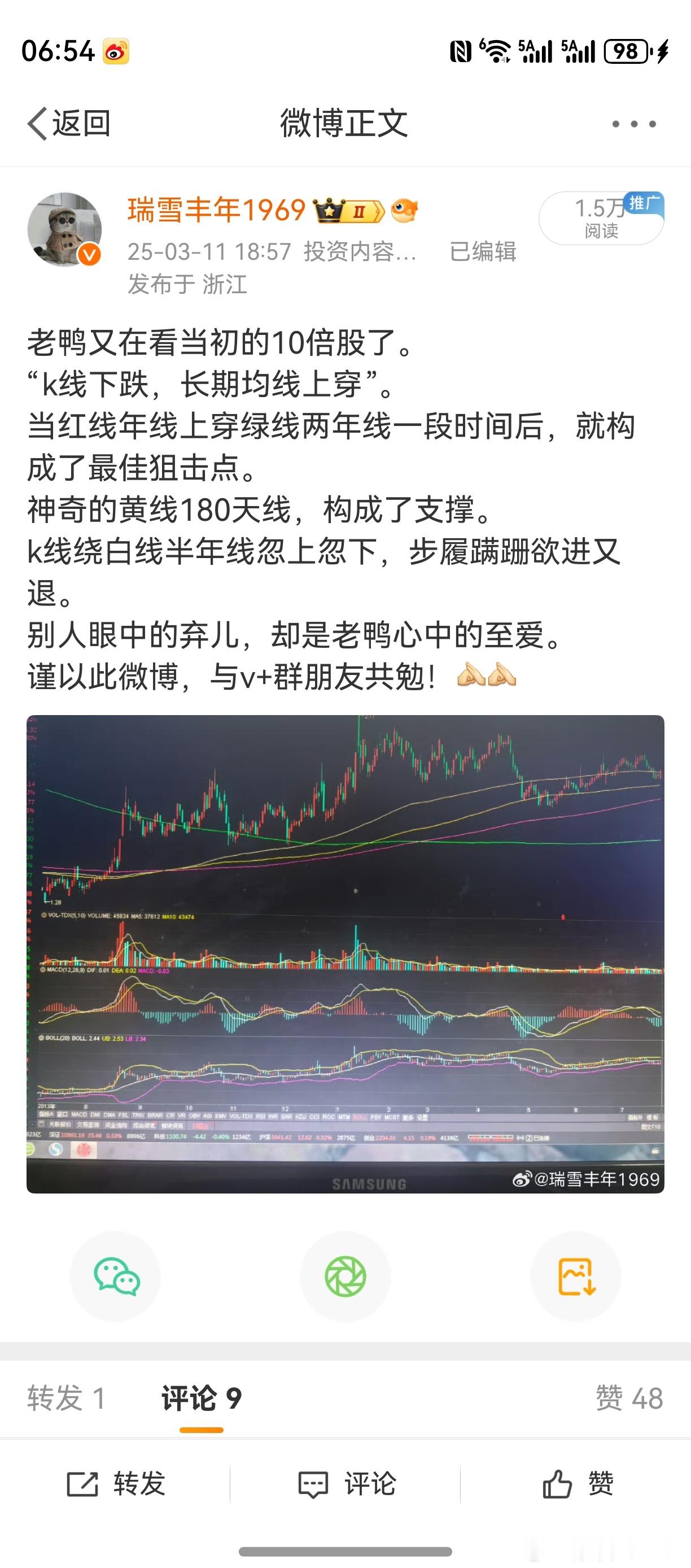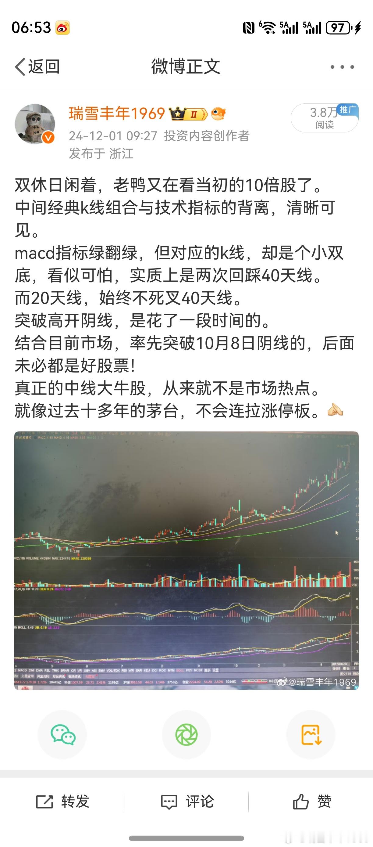 微博上涉及到的技术分析方法,可参考。4月4日判断创业板奔向4000点,所运用的技术分析,就是第二条微博所述。判断现在的股票能成为10倍股,所运用的技术分析,就是第一条微博所述。均线系统排列,务请领会关键是“排列”。怪了,两年来,老鸭怎么错过了该股?--心无旁骛。老鸭可不会后悔。