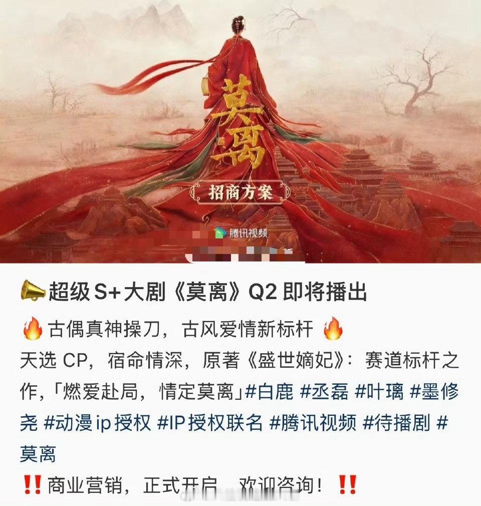白鹿丞磊莫离Q2播出白鹿丞磊莫离正式开启售卖 白鹿的大女主剧《莫离》终于要来了啊,新剧将在Q2播出。一整个氛围感拉满了啊!!!新剧正式开始售卖,看得出来白鹿和丞磊的号召力了啊,坐等新剧早日官宣定档了啊!!!