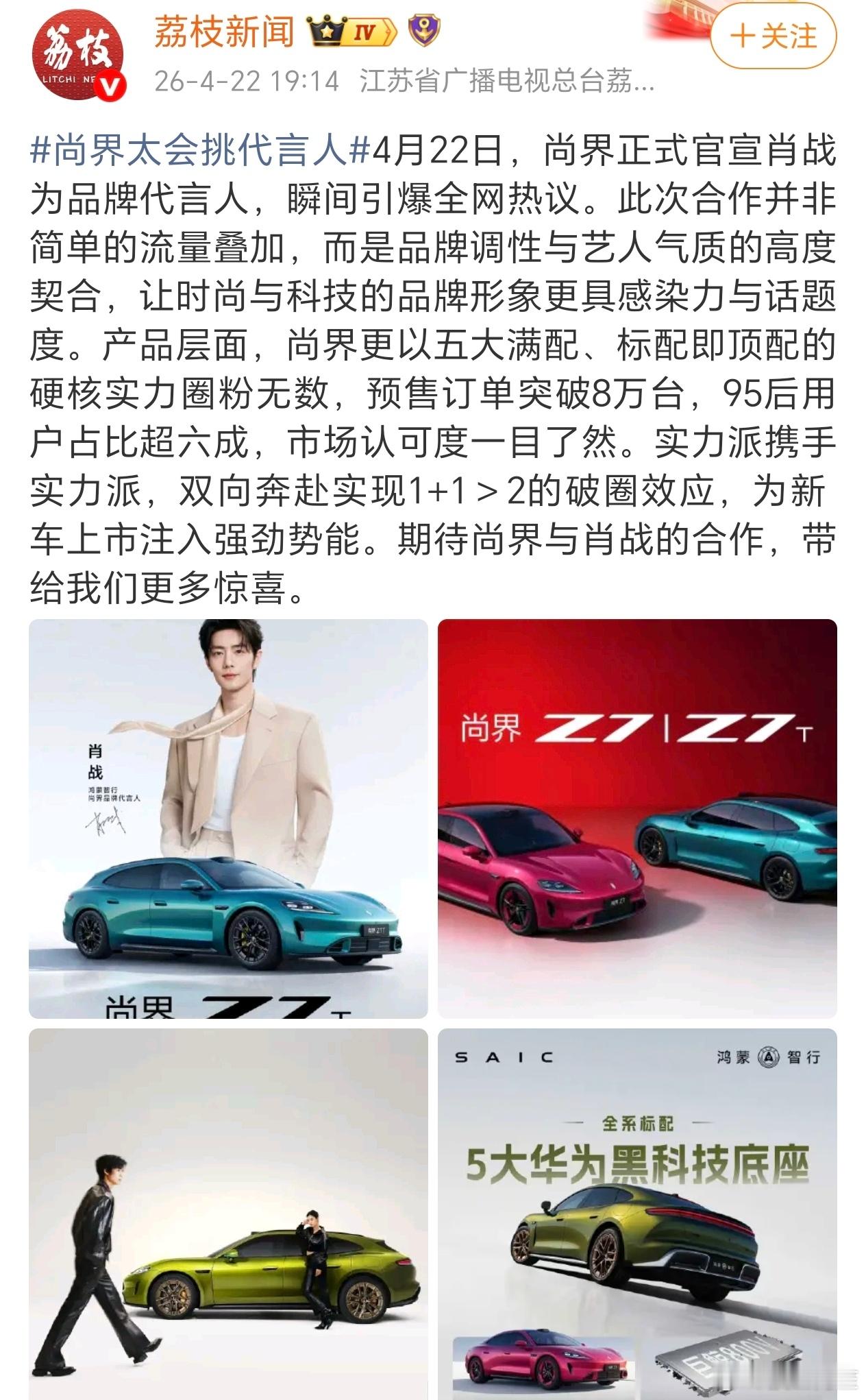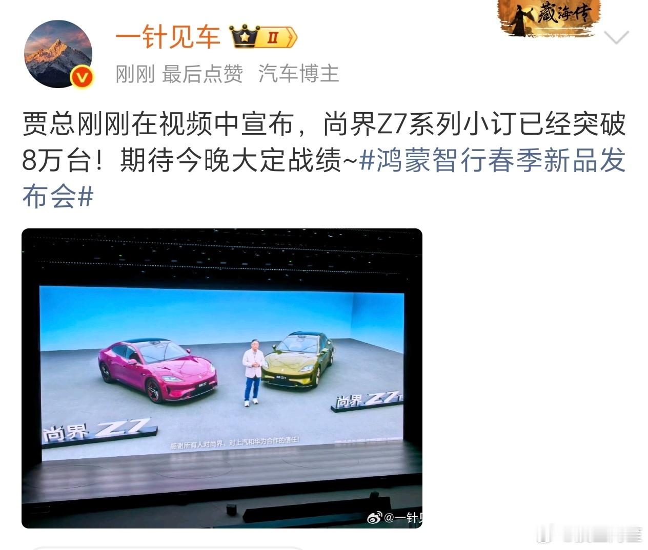 尚界贾总在视频里宣布,尚界Z7小订已破8万台了,这个成绩真的要震撼整个车圈了,毕竟我昨天还看到有车粉说能破3万就很厉害呢,没想到是8万果然选对代言人,破圈和真金白银就是这样滚滚而来肖战代言尚界