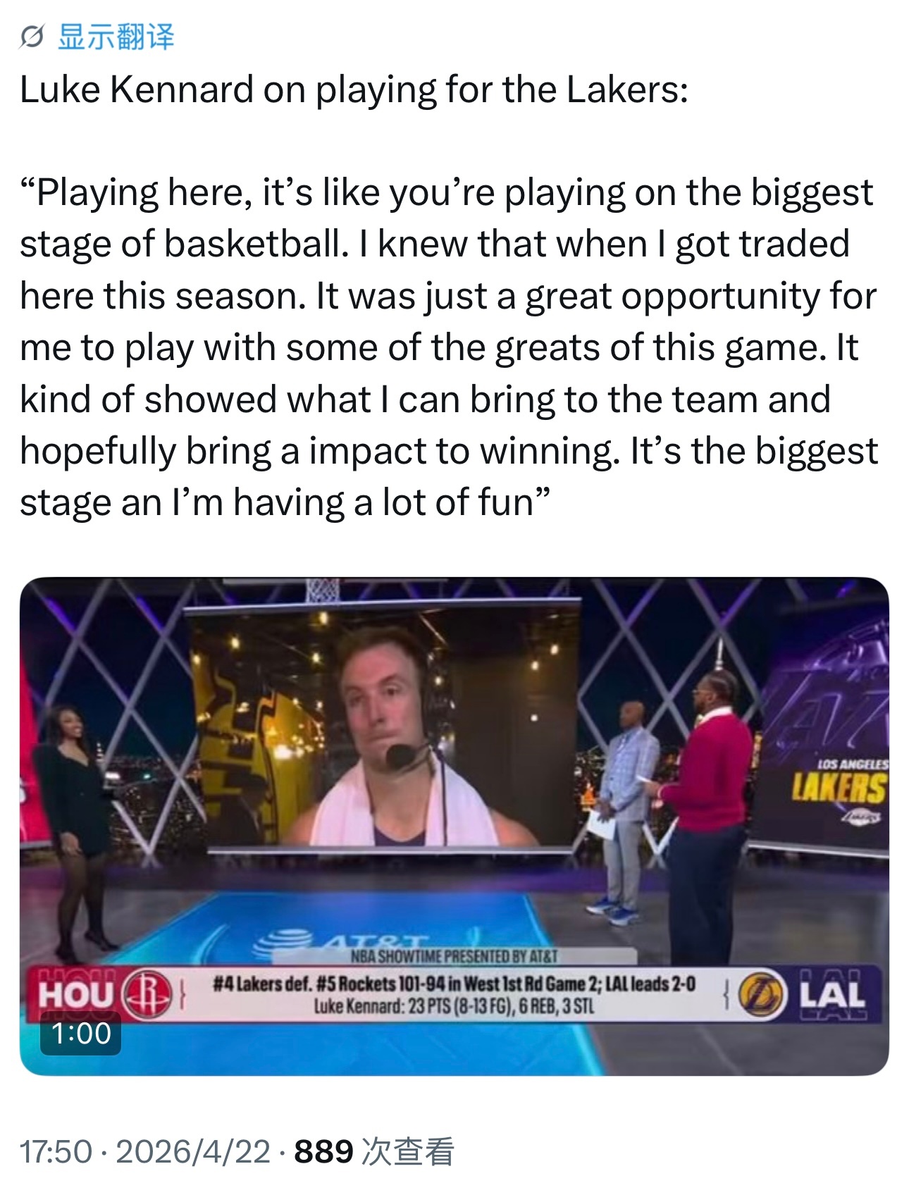 “在这里比赛,就像是站在篮球世界最棒的舞台中央,本赛季被交易到湖人时,我就深知这一点。能和篮球史上最优秀的巨星们并肩作战,对我而言是绝佳的机遇。这段经历也让球队认识到了我的赛场价值,我希望能用自己的表现为球队赢球贡献力量。这是万众瞩目的最高舞台,我在这里打得无比享受、乐在其中。”