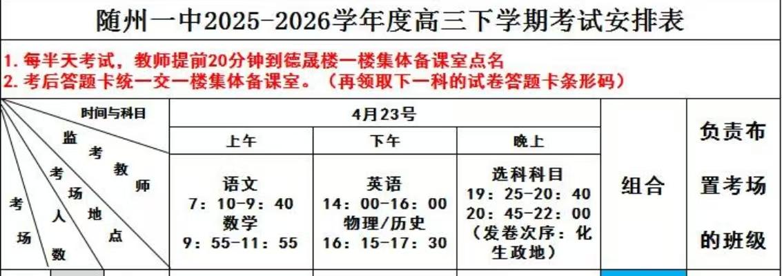从早考到晚,一天考完! 2026年4月22日,随州市高三四月调考开考,这次考试历时两天。作为随州市的头部高中,随州一中自然是参加这次全市统考。 不过,随州一中这一次并没有遵照既定的时间来考试,而是选择在明天4月23日一天考完六门。从早一直考到晚自习结束。对于这种“211”模式,随州一中高三学子们早已不陌生,这也一直都是随一的传统。 最近这段时间,很多地市州名高,都选择了缩短考试时间,采用多轮考试+讲评+再考试循环反复的方式,来锤炼考生的应试能力。