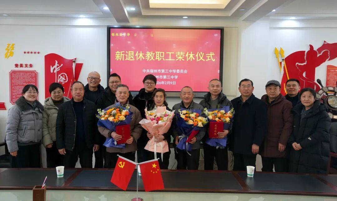 宿州三中蒋晓军、张少军、秦素兰、张乾、唐超五位教师荣休仪式 2月9日举行,蒋晓军、张少军两位老领导先发表荣休感言,校长赵辉讲话并颁发荣休纪念证书、敬献鲜花。