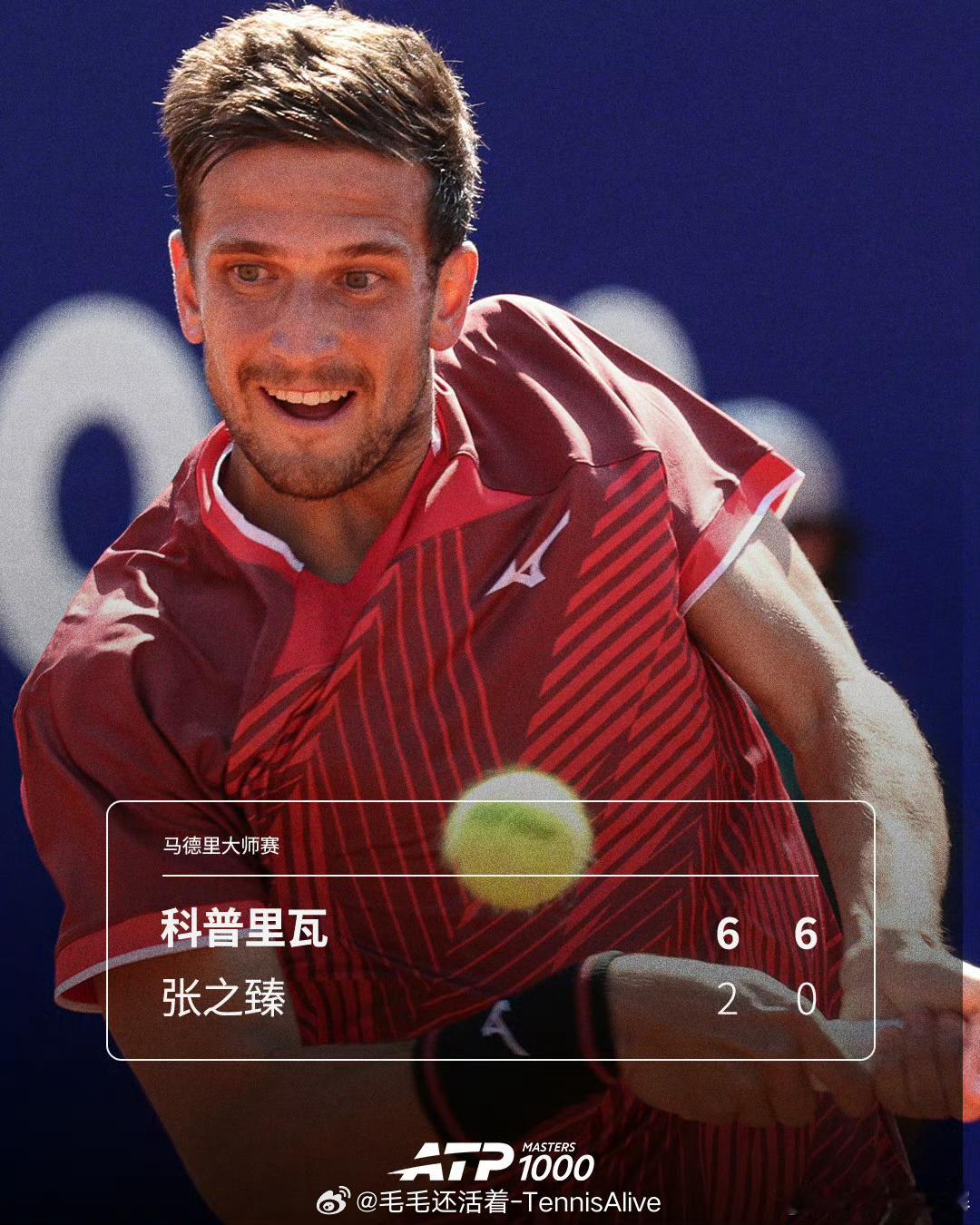 张之臻2-6 0-6科普里瓦止步马德里首轮。