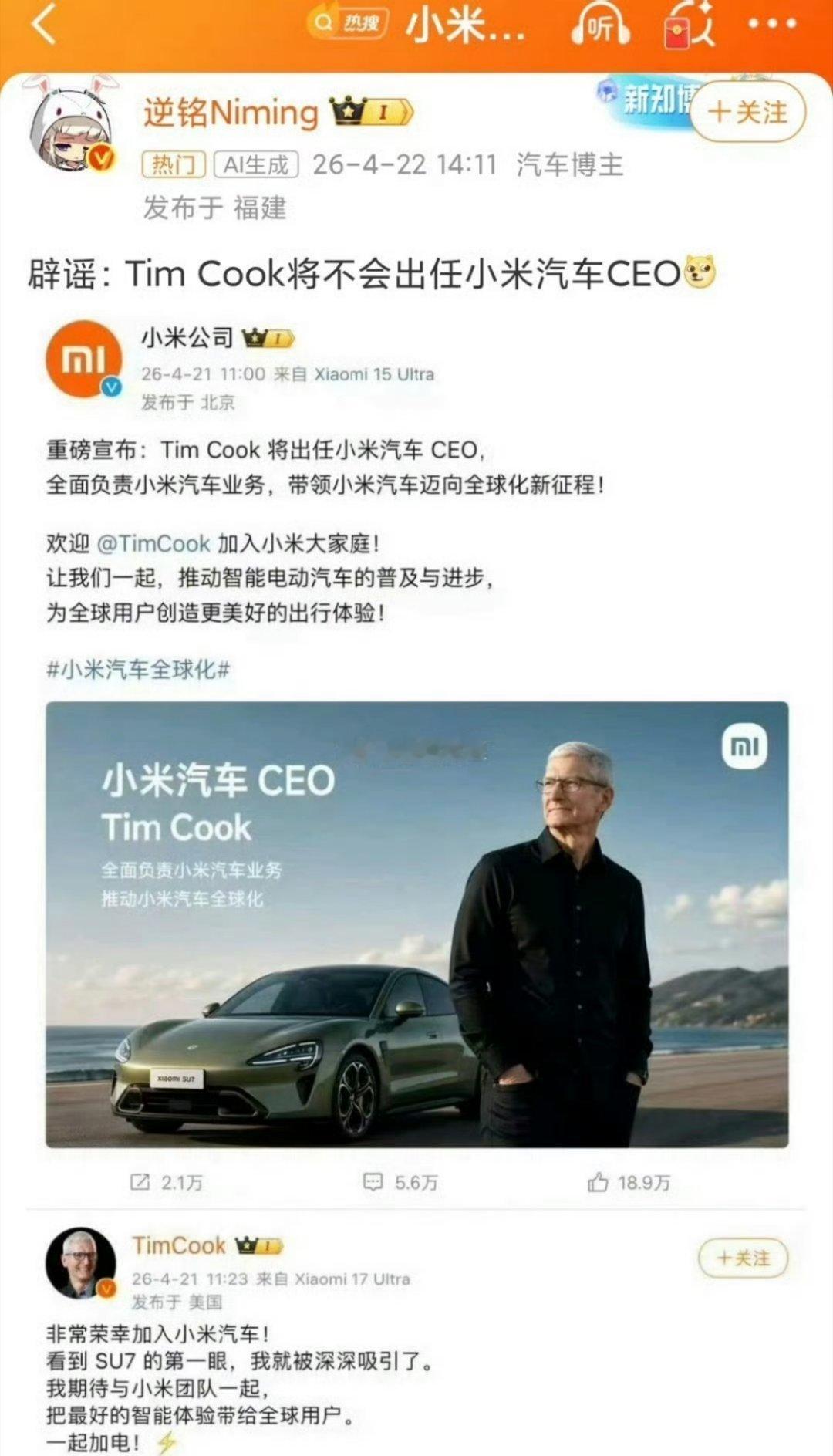 科技佳ZHJ现在大家P图真的是没轻没重的有人P了库克出任小米CEO、雷军当苹果CEO,乍一看还真有点唬人徐洁云这波也是紧急辟谣了,玩笑切勿当真。以为库克真加入小米汽车了徐洁云辟谣库克将出任小米汽车CEO科技先锋官