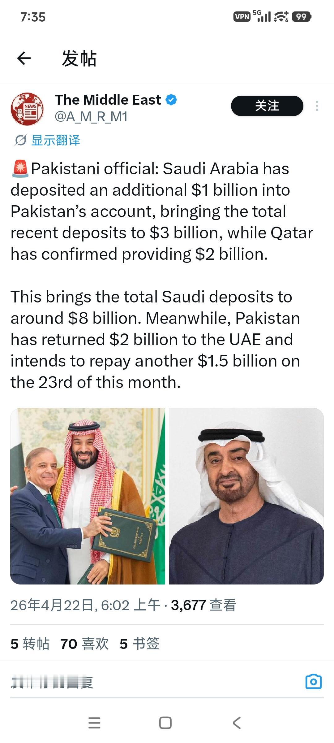 巴基斯坦官员对外披露,沙特阿拉伯向巴基斯坦账户追加存入 10 亿美元,让近期沙特新增的总存款达到 30 亿美元。 卡塔尔也已确认提供 20 亿美元资金支持,沙特在巴基斯坦的累计存款总额由此达到约 80 亿美元,与此同时巴基斯坦已向阿联酋归还 20 亿美元,还计划在本月 23 日再偿还 15 亿美元。 这笔资金的到账节奏,刚好卡在巴基斯坦偿还阿联酋到期债务的关键节点,背后连着巴基斯坦外汇储备的紧绷状态与海湾国家间的金融互动逻辑。 沙特这次的 30 亿美元并非一次性到账,而是分批次完成,先到账 20 亿美元,最后一笔 10 亿美元在近期完成划转,直接进入巴基斯坦央行的外汇账户,这笔新增资金加上沙特此前已经存入、并完成期限延长的 50 亿美元,合计 80 亿美元的资金沉淀,成为巴基斯坦外汇储备里最稳定的外部支撑之一。 卡塔尔的 20 亿美元则以确认承诺的形式落地,没有附加短期还款要求,主要用于补充巴基斯坦的经常账户流动性,覆盖进口支付与短期外债偿付的缺口,这两笔合计 50 亿美元的资金,刚好能覆盖巴基斯坦要还给阿联酋的 35 亿美元债务,还能留下 15 亿美元的缓冲空间,避免还款后外汇储备出现断崖式下滑。 巴基斯坦的外汇储备此前一直处于偏紧区间,截至 3 月底央行外汇储备约 164 亿美元,仅能覆盖三个月左右的进口需求,而阿联酋要求偿还的 35 亿美元,占其外汇储备的两成以上,一旦集中偿还,很可能导致卢比汇率波动、进口支付能力下降,甚至影响国际货币基金组织对巴基斯坦的后续援助评估。 阿联酋这次没有像以往那样同意债务展期,而是要求巴基斯坦按期全额偿还,打破了双方多年的债务处理惯例,也让巴基斯坦的外部资金压力在短时间内急剧上升,这也是沙特、卡塔尔快速注资的直接背景。 沙特对巴基斯坦的资金支持,不只是简单的短期注资,更包含存量资金的长期化安排,之前的 50 亿美元存款原本是短期滚动模式,这次一并延长了存期,不再需要每年重新协商续期,相当于给巴基斯坦提供了长期稳定的外汇底仓,减少了短期资金集中流出的风险。 这种支持也和双方的军事、能源合作绑定,巴基斯坦长期向沙特提供军事人员培训、防务协作,沙特则以长期存款、低价原油供应等方式,为巴基斯坦的经济安全托底,形成安全与金融相互支撑的关系。 卡塔尔的 20 亿美元支持,同样带着地区协作的考量,卡塔尔近年来持续扩大在南亚、中东的金融布局,对巴基斯坦的资金注入,既巩固了双方在能源、投资领域的合作,也在海湾国家内部形成差异化的金融立场,和沙特一起为巴基斯坦搭建起资金缓冲带,避免其因债务压力陷入外部融资困境。 巴基斯坦这边则保持着严格的履约节奏,先完成 20 亿美元的还款,再按计划在 23 日结清剩余 15 亿美元,用实际行动维护主权信用,同时借助沙特、卡塔尔的资金,平稳度过这次债务集中偿付期,也为后续争取更多国际融资、稳定国内经济创造条件。 整个资金往来的过程,表面是国家间的存款、债务偿还,背后是地区金融协作与地缘立场的联动,沙特、卡塔尔的注资节奏、巴基斯坦的还款安排、阿联酋的债务要求,每一步都和外汇储备安全、主权信用、地区合作关系紧密挂钩,也让南亚与海湾的金融互动变得更受关注。 你怎么看这次沙特、卡塔尔注资与巴基斯坦偿还阿联酋债务背后的地区金融逻辑?