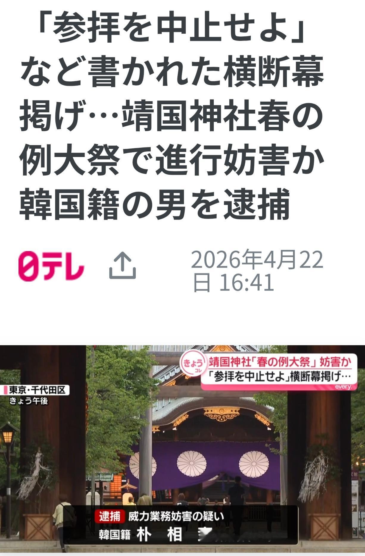64岁勇士抗议参拜靖国神社被日警逮捕 日媒《日本新闻网》4月22日报道:今天在靖国神社举办的春祭,126名高市内阁大臣和议员参拜。 来自韩国的64岁朴相奎,因在门前举着写有“停止参拜”的横幅抗议,被日本警方以“妨碍活动进程”为由逮捕。 据东京都警察厅称:朴相奎“涉嫌妨碍了22日上午11点在千代田区靖国神社举办的春祭活动”。 当时朴相奎在门口举起一面日文横幅,上面写着“停止参拜战犯的靖国神社”。 对于警方讯问,朴相奎表示“做了自己想做的事”。 朴相奎于前天(4月20日)刚抵达日本。 日本 韩国 爆料 高市早苗为何要“拜鬼” 我要上精选-全民写作大赛 天南地北大拜年