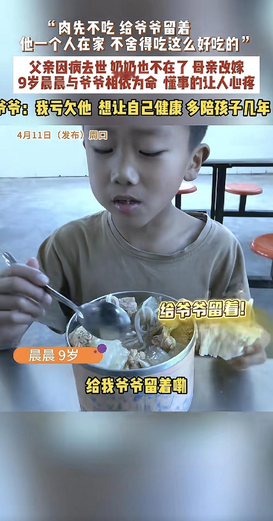 河南周口,9岁的晨晨和爷爷相依为命。父亲不在了,母亲也改嫁了,家里就剩下爷孙俩。 吃饭的时候,晨晨把肉夹到一边,说:“肉先不吃,给爷爷留着。他一个人在家,不舍得吃这么好吃的。” 爷爷听了,眼眶红了。他说,自己亏欠孩子太多,只盼着身体健康,能多陪晨晨几年。 9岁的孩子,本该是调皮捣蛋的年纪,晨晨却早早学会了心疼人。那份懂事,让人看了心里酸酸的。 有网友说,这孩子是爷爷的小棉袄,也是爷爷活下去的盼头。愿爷孙俩的日子,能越过越暖。