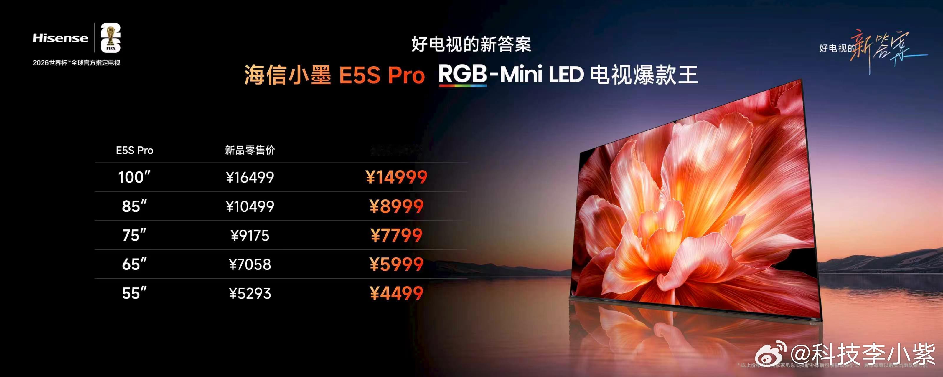 价格全系补贴后:55英寸4499元、65英寸5999元、75英寸7799元、85英寸8999元、100英寸14999元。免费安装,价保618。