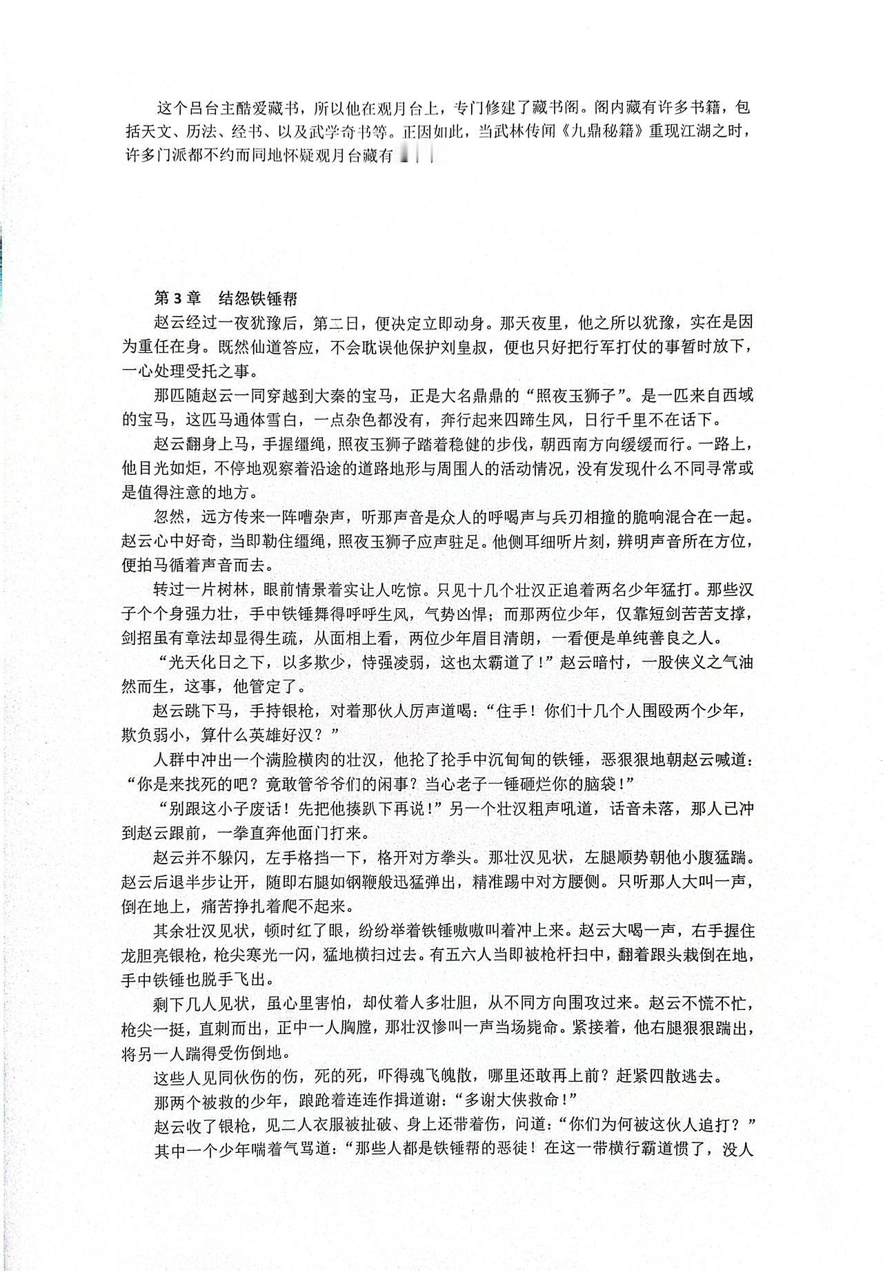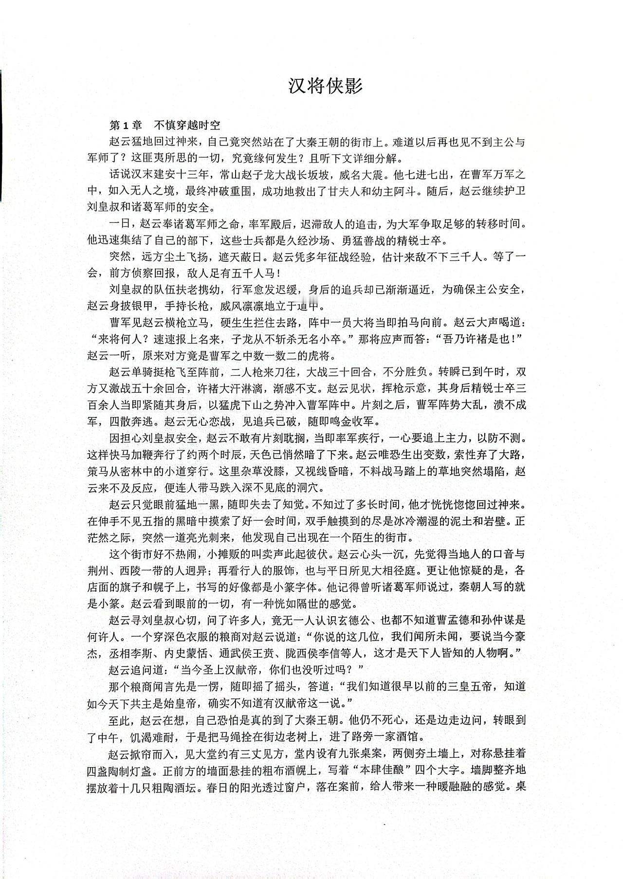 我的武侠小说《汉将侠影》,这是电子版A4规格打印前4页内容。这部小说将武侠与权谋、军事谋略结合在一起,同时描写了一段跨越秦汉的爱情故事,情节新颖,内容精彩。