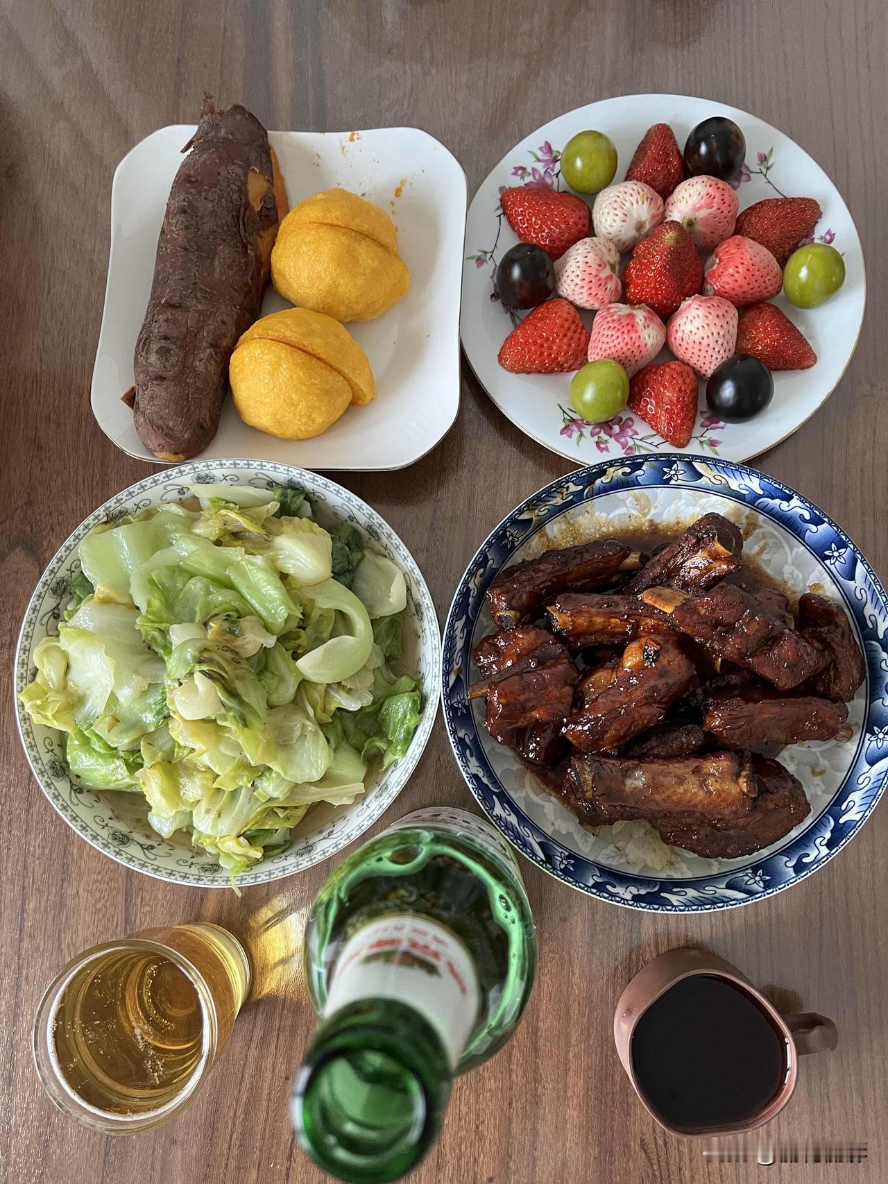 好友们晚上好!周三快乐,晚餐香香!今天的晚餐: 素炒圆白菜 红烧排骨 红薯窝头 果盘 今天忙了一天,上午收拾新房,然后把车擦了。下午烙馅饼做晚饭,今天中午也没休息。 下午先生炖排骨我烙馅饼,然后炒了一个素圆白菜,弄一个果盘,把窝头和红薯放饼铛里热了一下,一顿美味的晚餐就齐了。 今儿的晚餐还是一荤一素一果,俩人的晚餐随意随性,想怎么吃就怎么吃。时间不早了,话不多说,开饭啦![大笑][大笑][大笑][大笑][大笑][大笑]