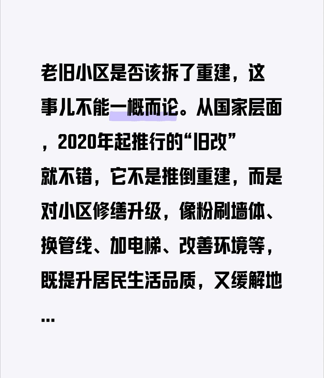 老旧小区是否该拆了重建,这事儿不能一概而论。 从国家层面,2020年起推行的“旧改”就不错,它不是推倒重建,而是对小区修缮升级,像粉刷墙体、换管线、加电梯、改善环境等,既提升居民生活品质,又缓解地方财政压力,还能稳定房地产市场。 但原拆原建就有不少问题。老房子大多是楼梯房,公摊低,60平套内基本就是60平。可重建后,按新规范要建电梯井、消防通道等,公摊大幅上涨,套内面积缩水。而且原拆原建过程中,业主还得面临过渡安置等麻烦。所以,是否拆除重建,得综合多方面考量,不能盲目追求“新”。