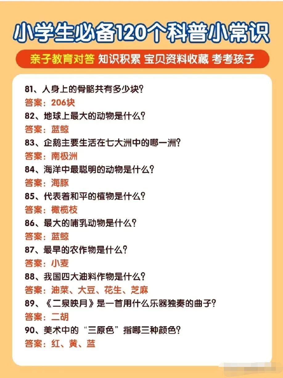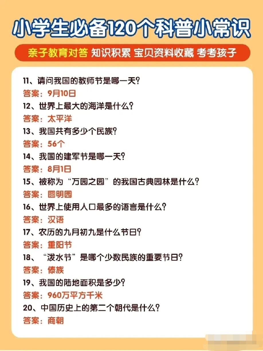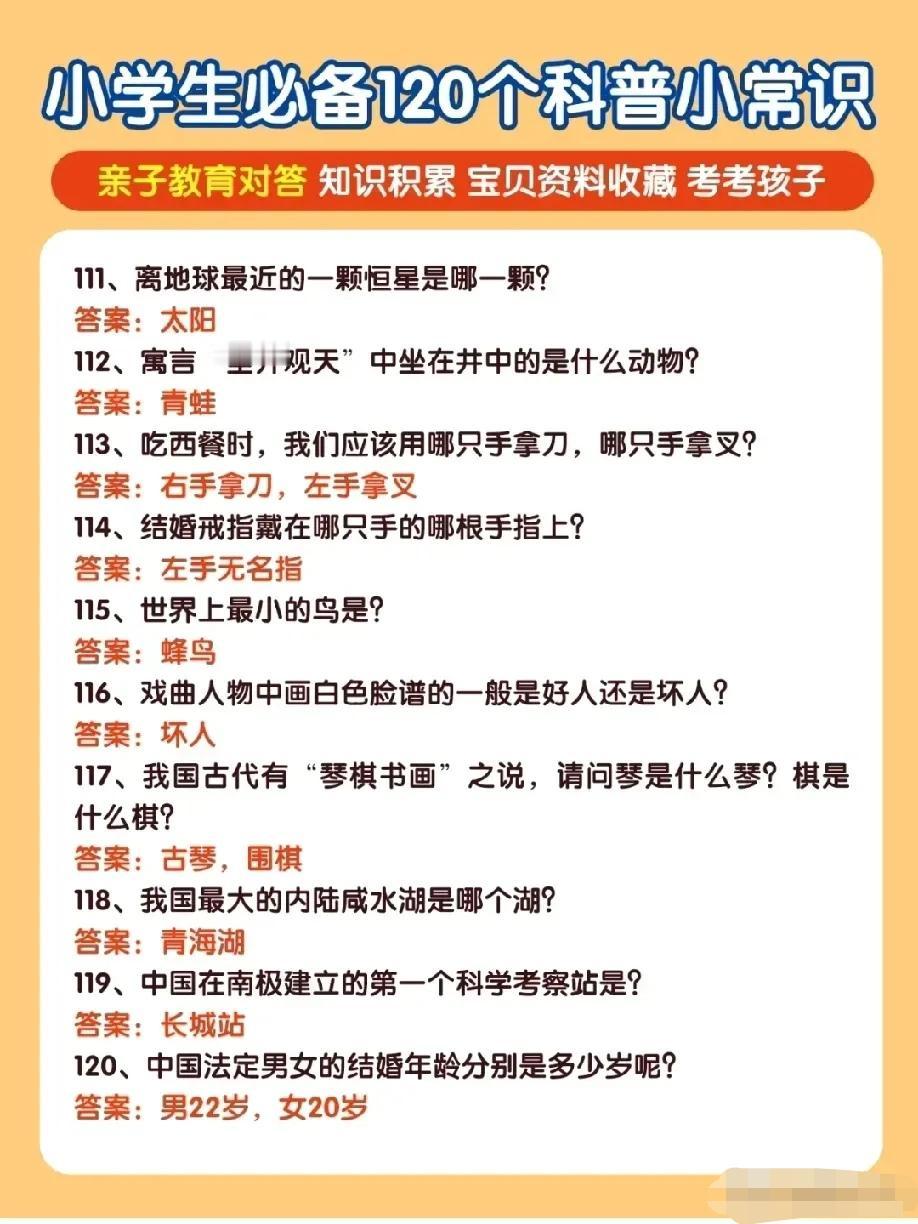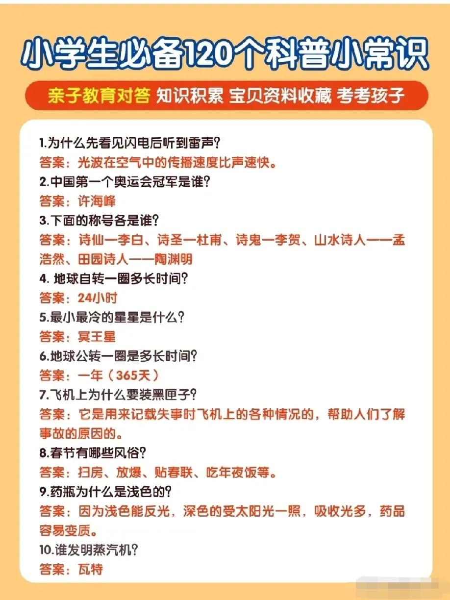为什么别人家孩子见多识广、出口不凡?真相藏在日常百科积累里!这120个小学生必备科普小常识,覆盖自然、生活、科学,亲子问答、写作素材、考试拓展都能用。 不用死记硬背,每天聊几句,轻松拓宽认知边界,告别学习枯燥。当下亲子教育越来越看重综合素养,常识积累就是最划算的投资。收藏起来,陪孩子慢慢学,让眼界与知识同步成长。