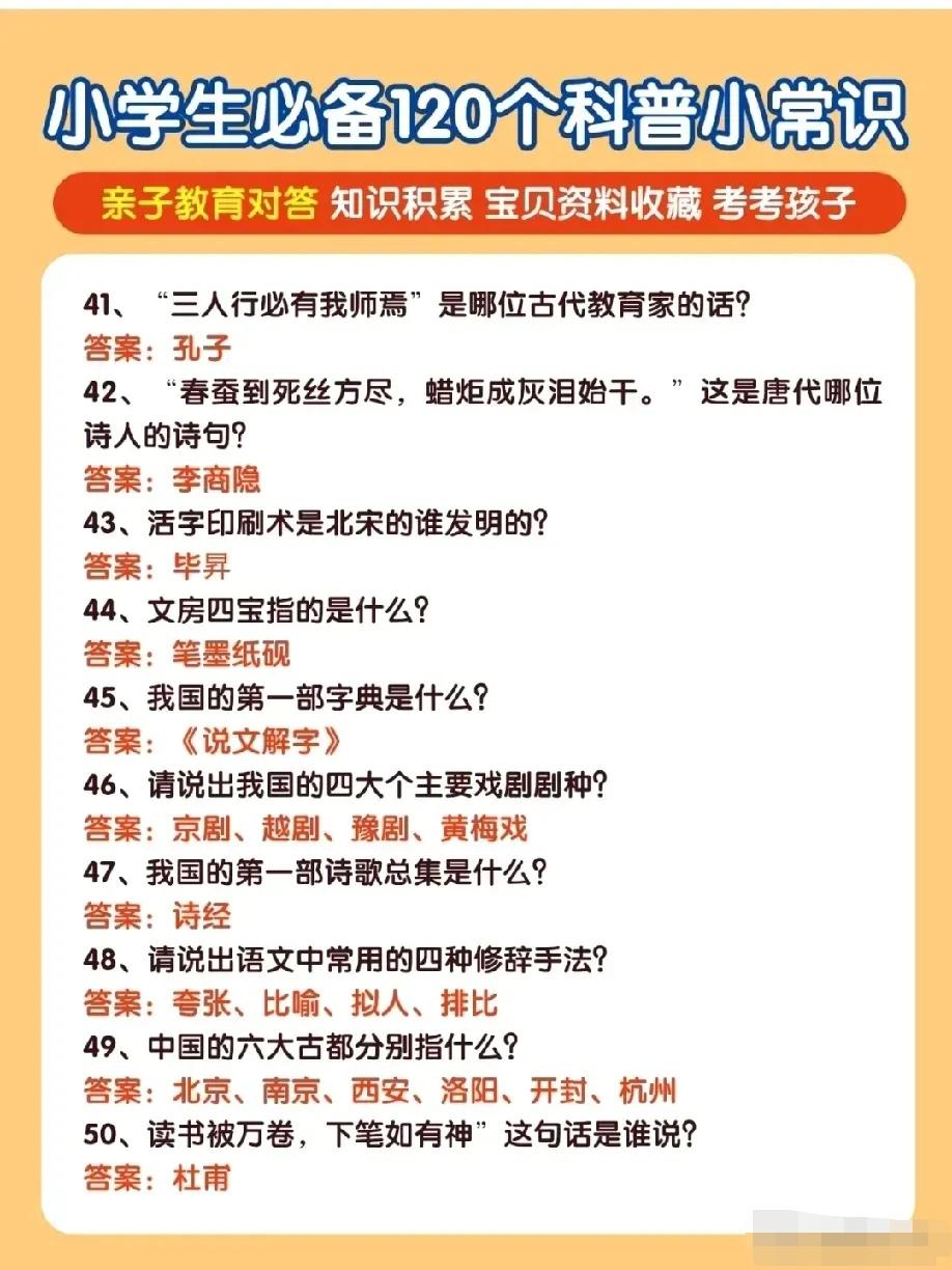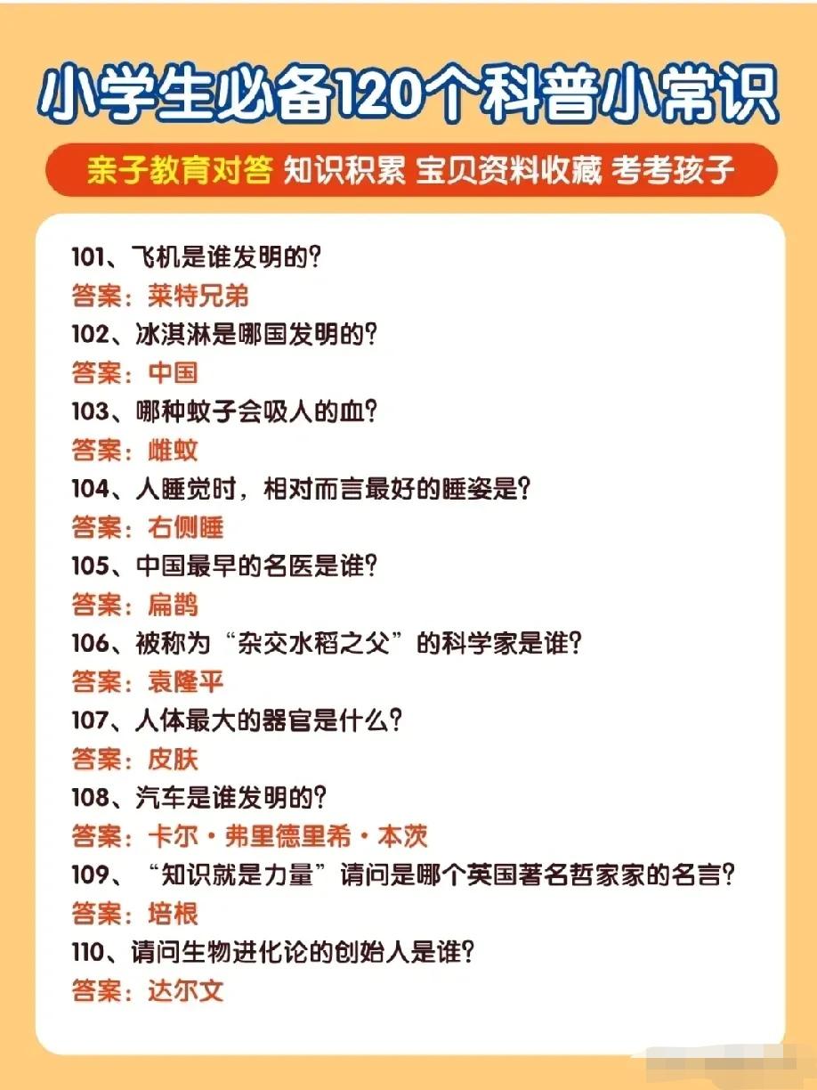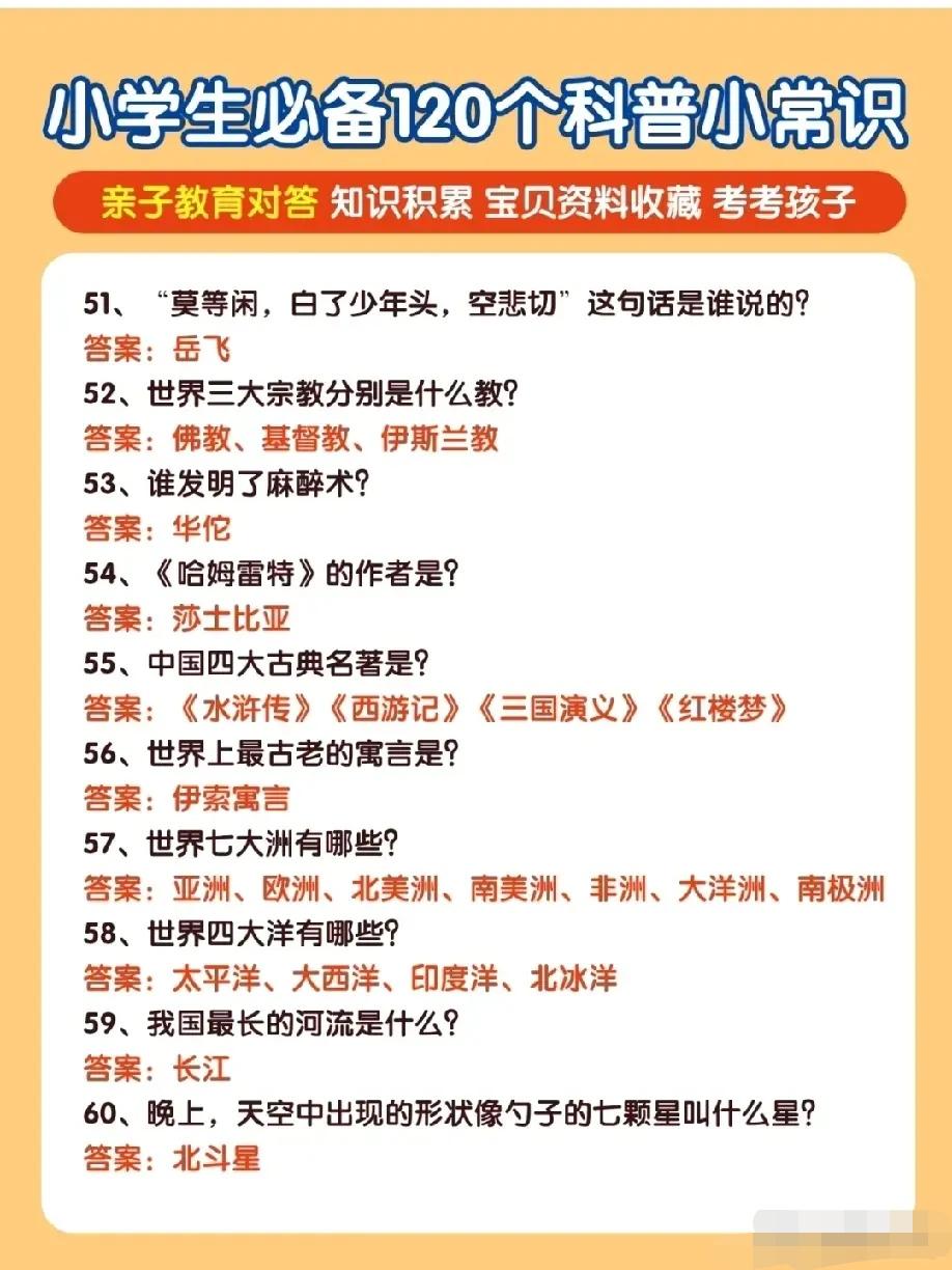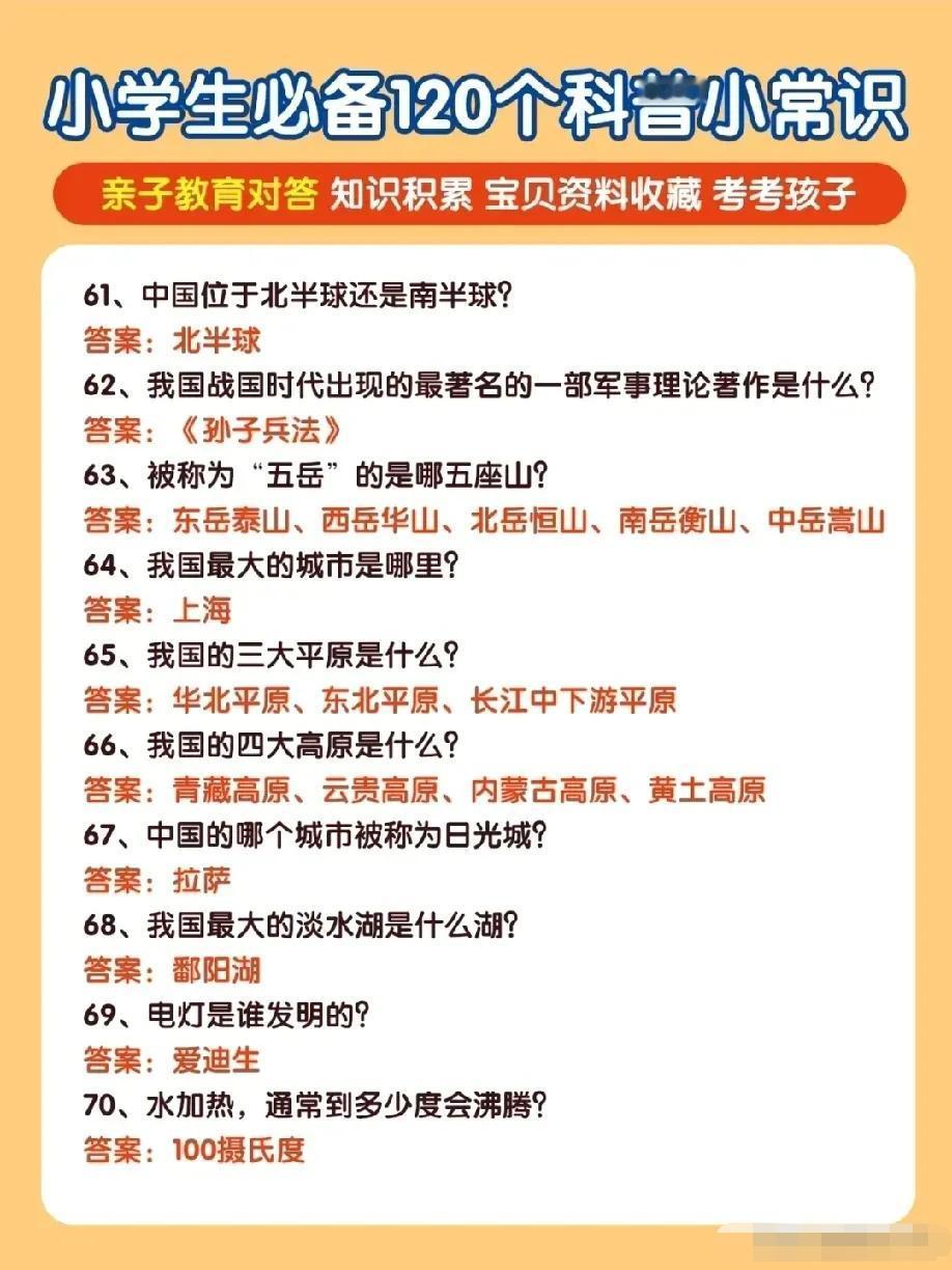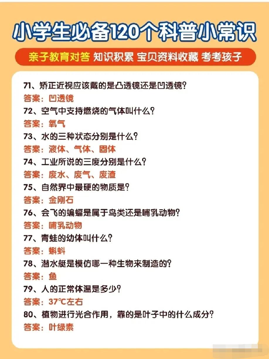 为什么别人家孩子见多识广、出口不凡?真相藏在日常百科积累里!这120个小学生必备科普小常识,覆盖自然、生活、科学,亲子问答、写作素材、考试拓展都能用。 不用死记硬背,每天聊几句,轻松拓宽认知边界,告别学习枯燥。当下亲子教育越来越看重综合素养,常识积累就是最划算的投资。收藏起来,陪孩子慢慢学,让眼界与知识同步成长。