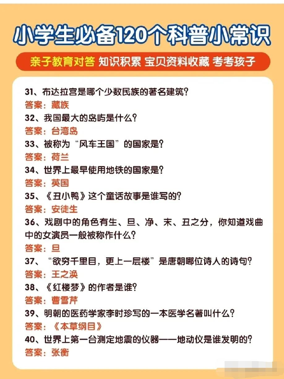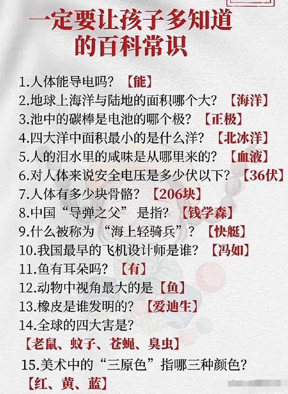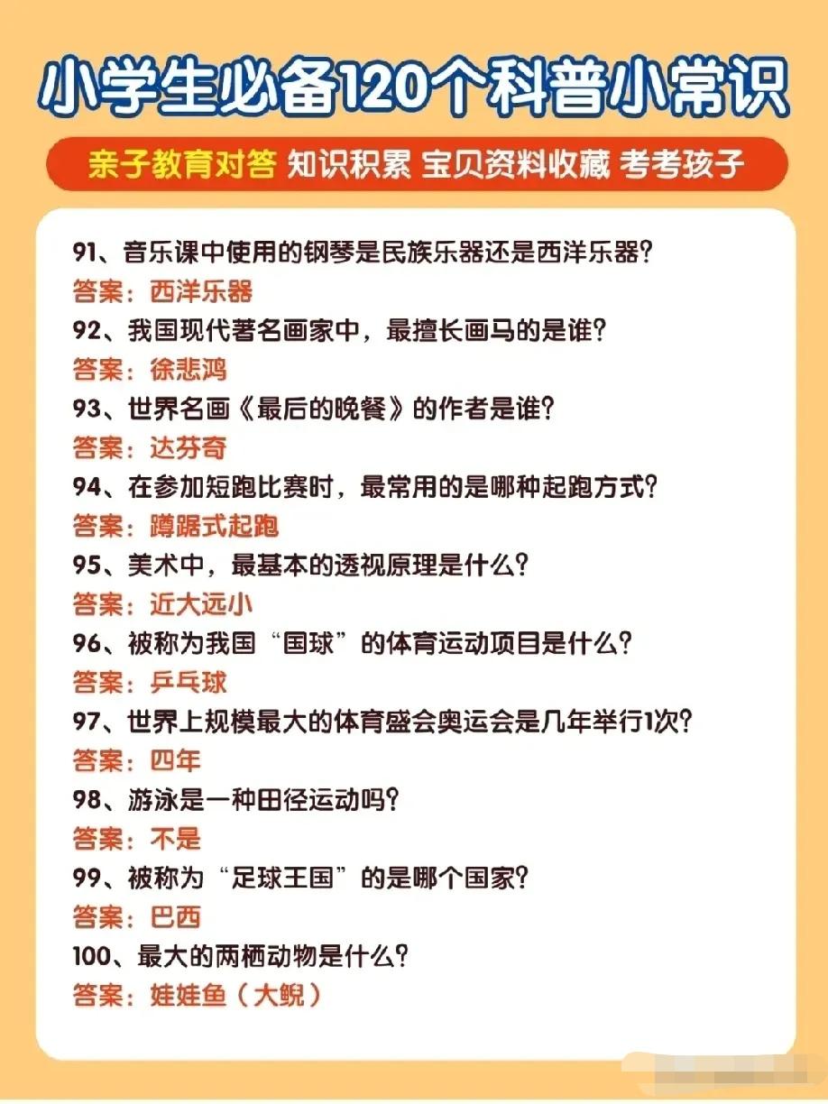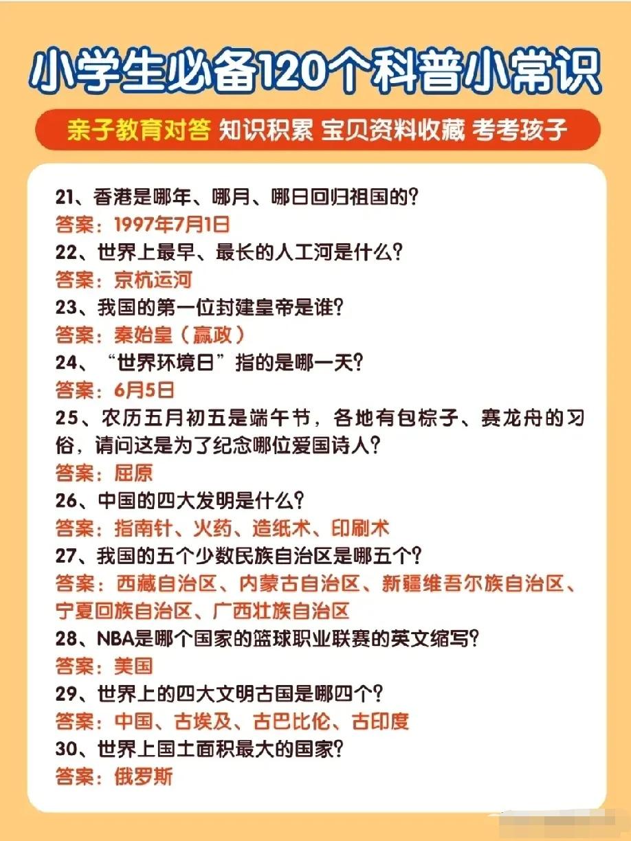 为什么别人家孩子见多识广、出口不凡?真相藏在日常百科积累里!这120个小学生必备科普小常识,覆盖自然、生活、科学,亲子问答、写作素材、考试拓展都能用。 不用死记硬背,每天聊几句,轻松拓宽认知边界,告别学习枯燥。当下亲子教育越来越看重综合素养,常识积累就是最划算的投资。收藏起来,陪孩子慢慢学,让眼界与知识同步成长。