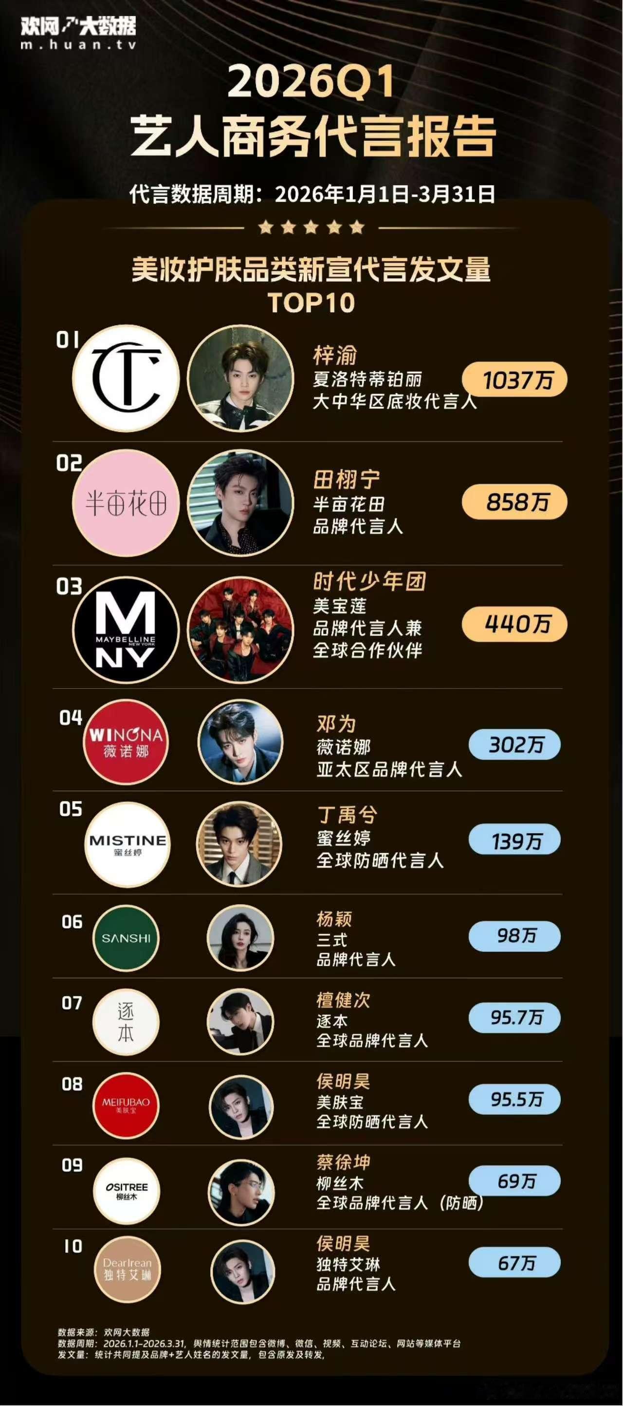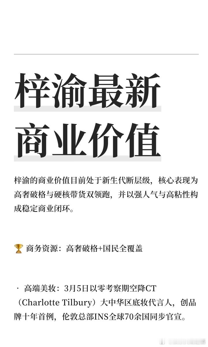 梓渝q1商务季报双品类top1梓渝 欢网大数据2026年Q1季度,艺人商务代言报告出炉:美妆护肤品类新宣代言发文量第一名:🥇1梓渝(ct)服饰饰品类新宣代言发文量第一名:🥇1梓渝(施洛华)从星品到欢网📚,梓渝商业价值毋庸置疑👏