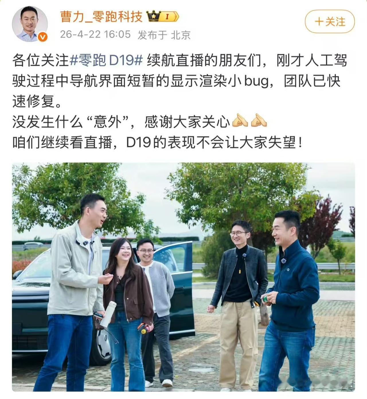 在今天的零跑官方直播D19车型“杭州至北京千里续航实测”时,突发一起意外:车辆行驶在高速路段,中控屏AR导航的车道线、周边车辆等关键信息突然消失,只剩下车辆模型。 直播中可见,零跑高级副总裁曹力神情明显慌了,而且导航异常后直播间评论区被关闭。好在现场技术团队反应迅速,很快修复了该导航bug,续航实测得以继续。 事后曹力微博回应,称这只是导航界面短暂显示渲染小bug,已快速修复;客服则建议车主遇类似问题可到线下门店检测。此外,有零跑车主反馈,此类bug并非首次出现,但官方暂未对该频繁问题进一步说明。【来自懂车帝车友圈】
