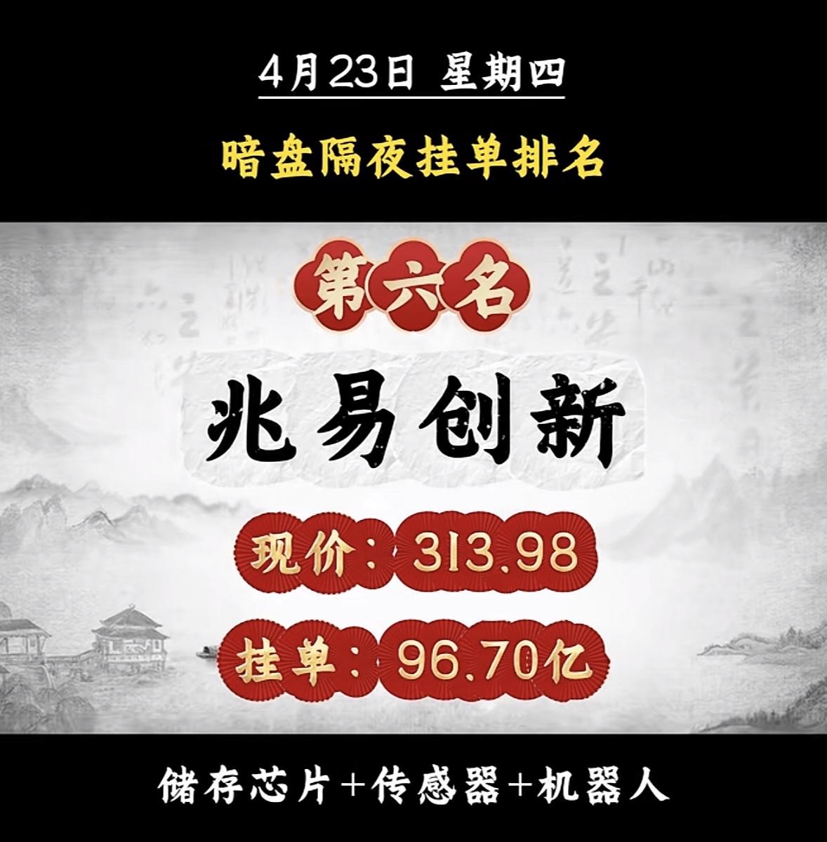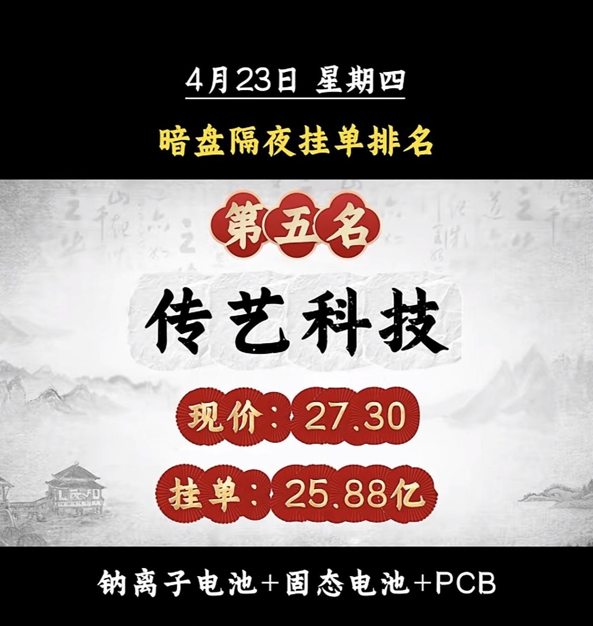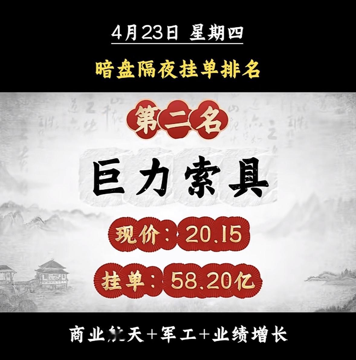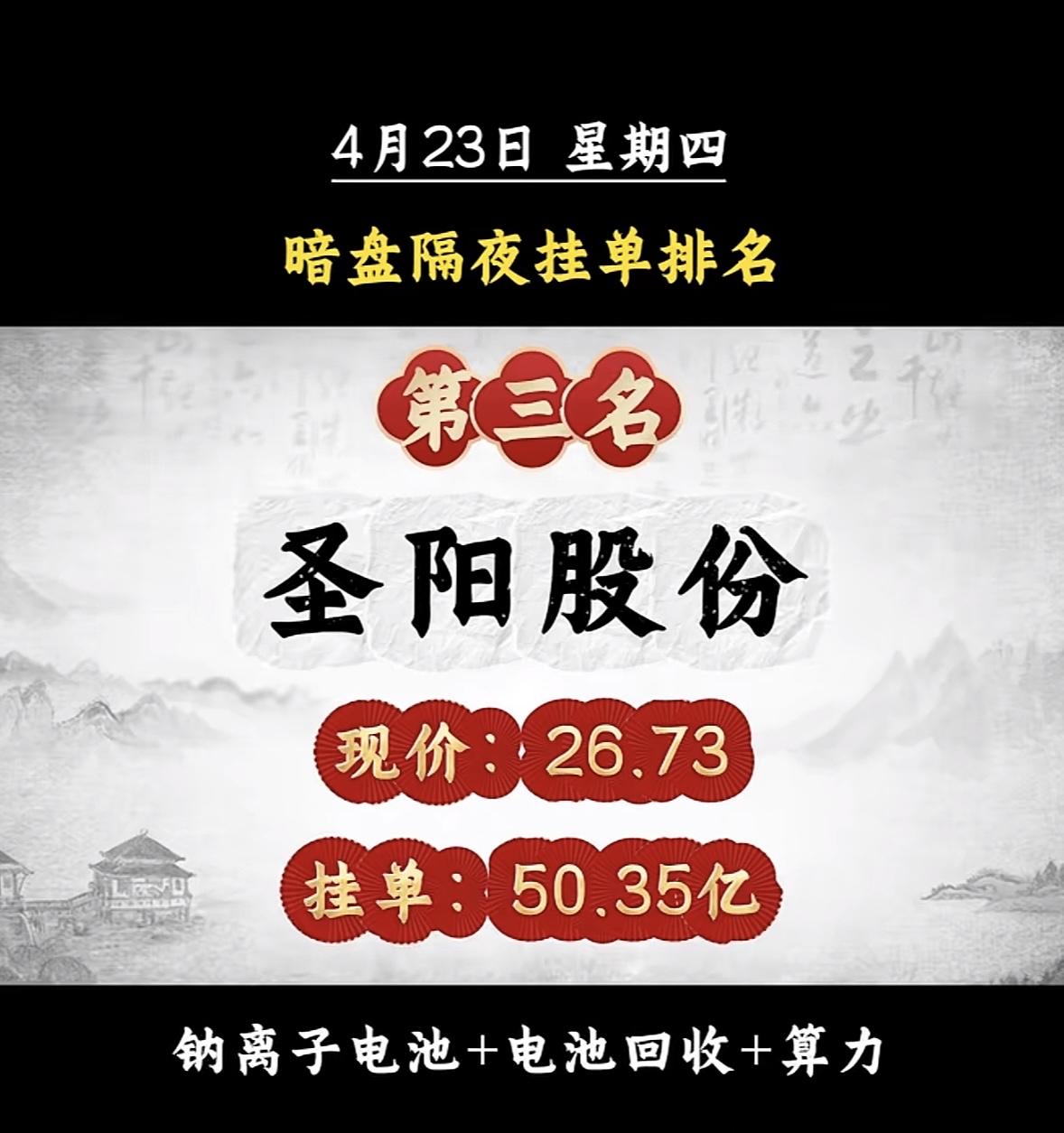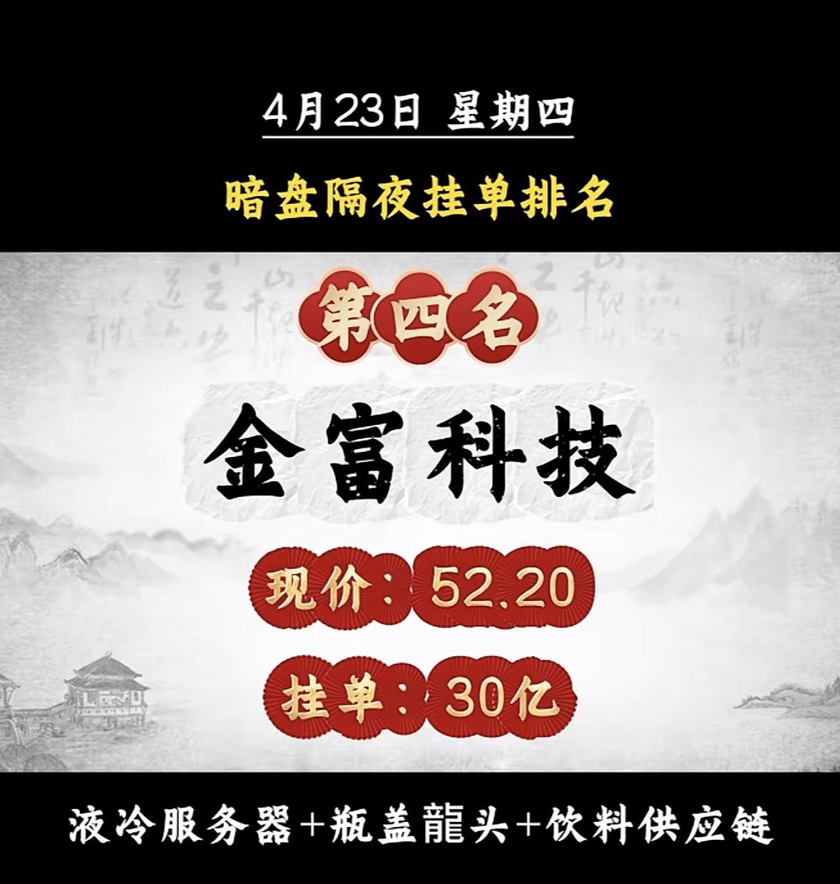 4月23日周四暗盘隔夜挂单排行榜揭晓 4月23日暗盘隔夜挂单,金富科技以52.20亿的价格夺得第四名,这成绩相当亮眼。金富科技已经连收4个涨停板,截至9:39,报52.20元,成交金额5.45亿元。连续涨停期间,累计上涨46.42%。 不过,这背后也有风险。21日晚公司发了风险提示,刚完成对卓晖金属、联益热能各51%股权的收购,可公司之前没相关行业管理经验,运营和整合能力面临考验。而且业绩承诺虽有,但受多种因素影响,经营业绩存在不确定性。投资这只股票,可得多留个心眼!